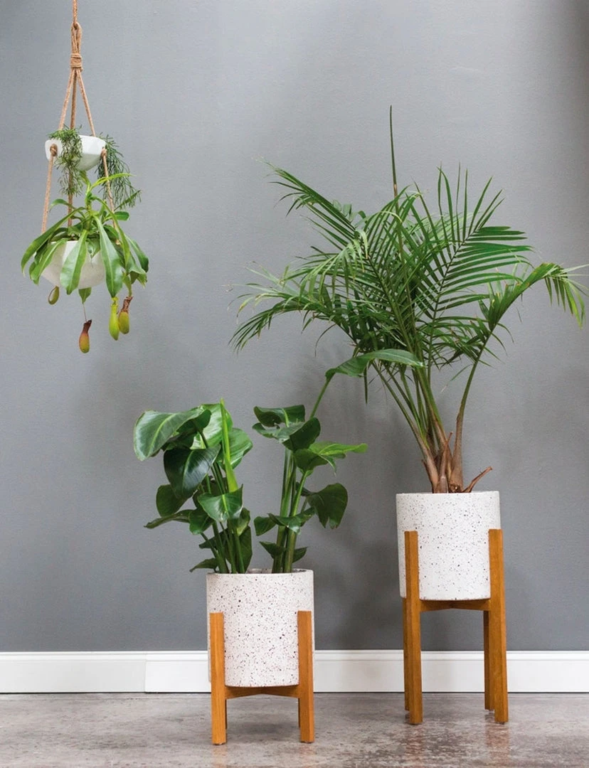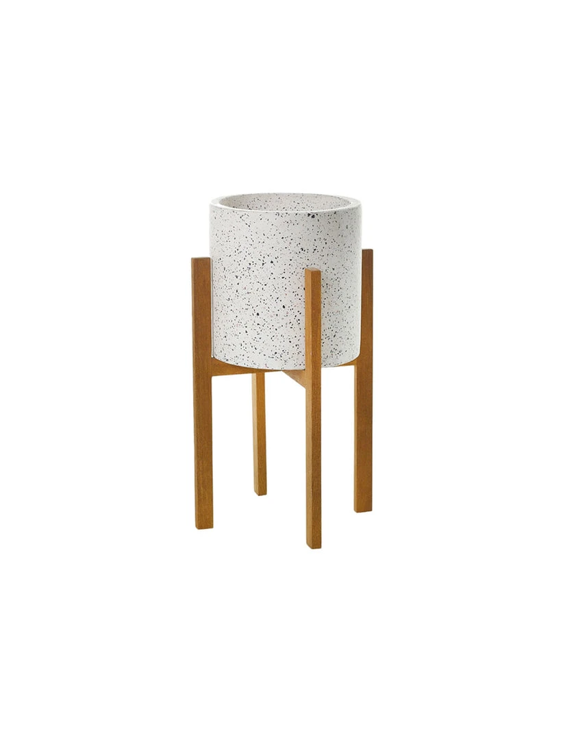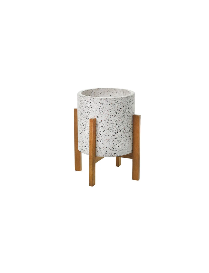 The fresh and eco-friendly Dale planter features terrazzo, a mixture of chips from granite, marble, quartz and other stones, and wooden feet for a warm yet modern look. Frost resistant, can be used outside. However, because of the pourus nature of terrazzo, this product is not 100% water tight.