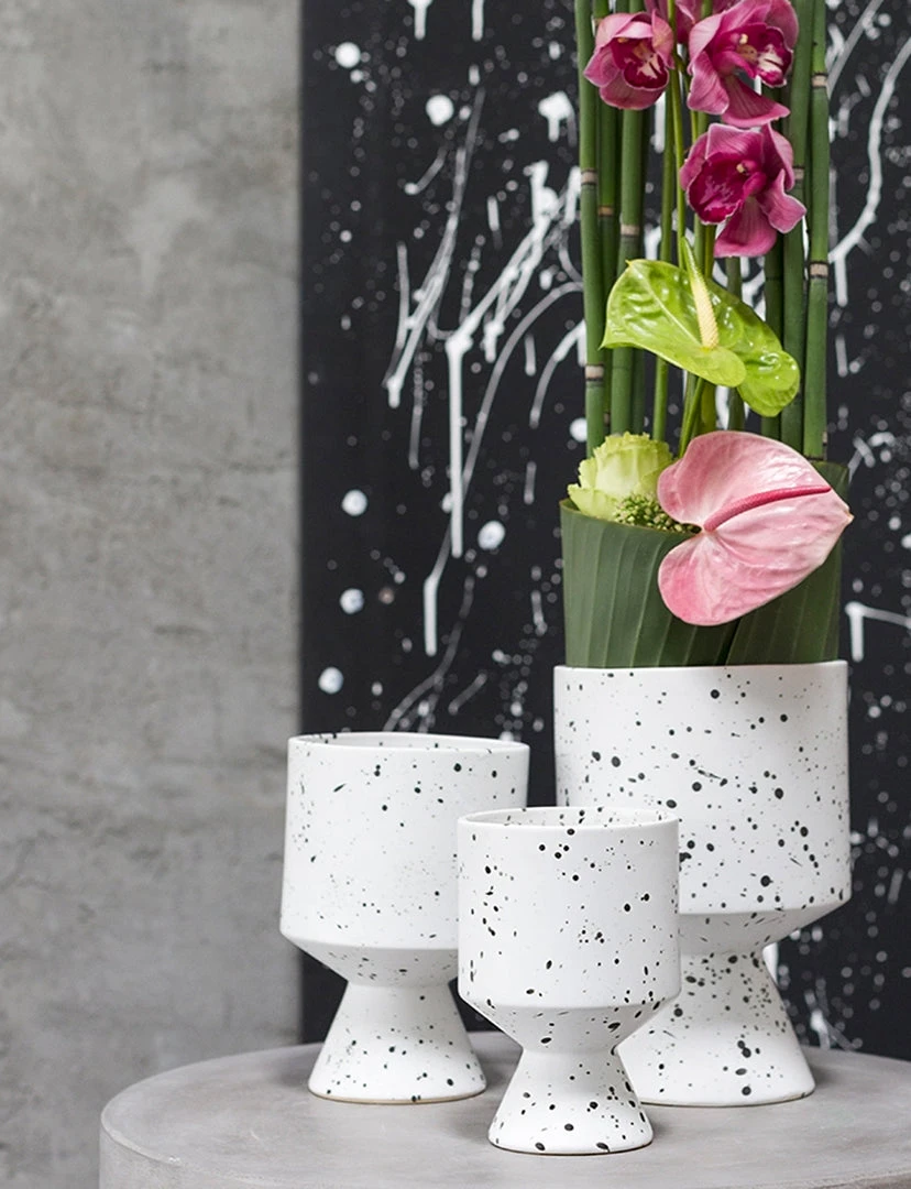 The DeVil collection is unique from silhouette to finish. The vase is first glazed, before speckles are applied by flicking glaze onto the pot by hand.