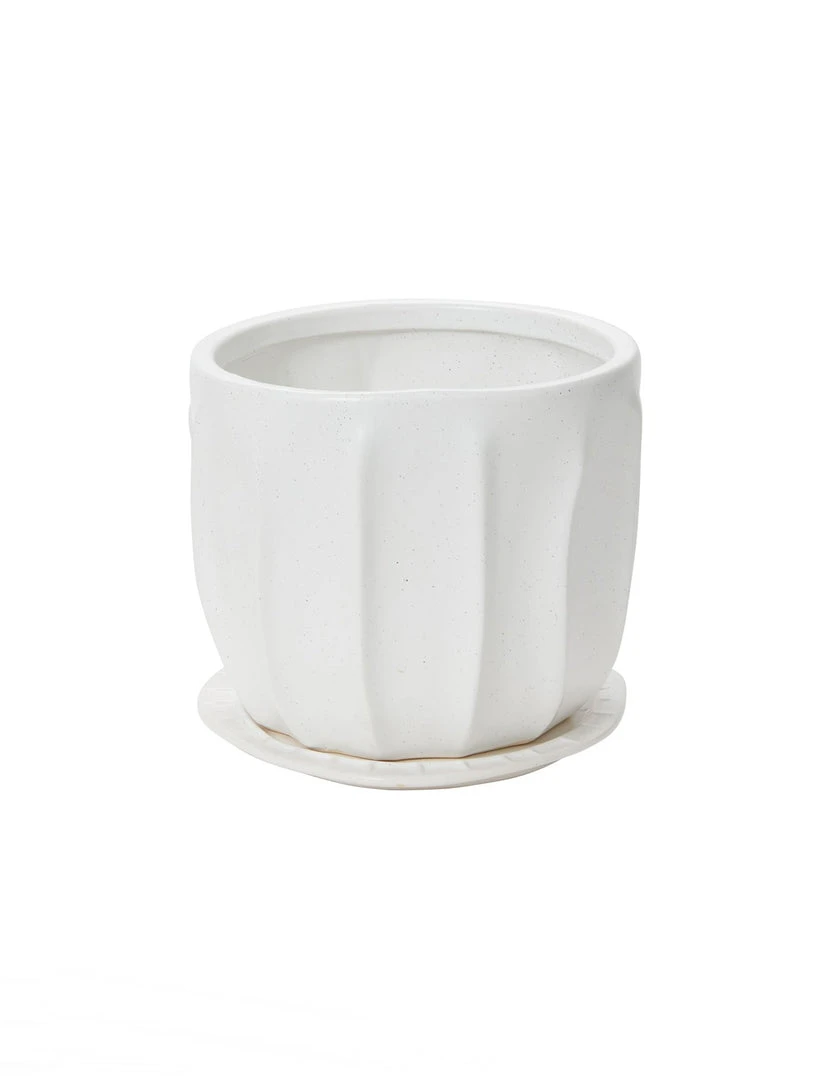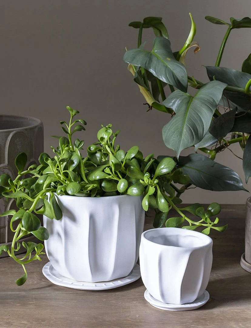 The Draken Pot features a smooth white finish with raised grooves to add organic style to a simple silhouette. A drainage hole and simple saucer make it an everyday staple with an extra dose of style