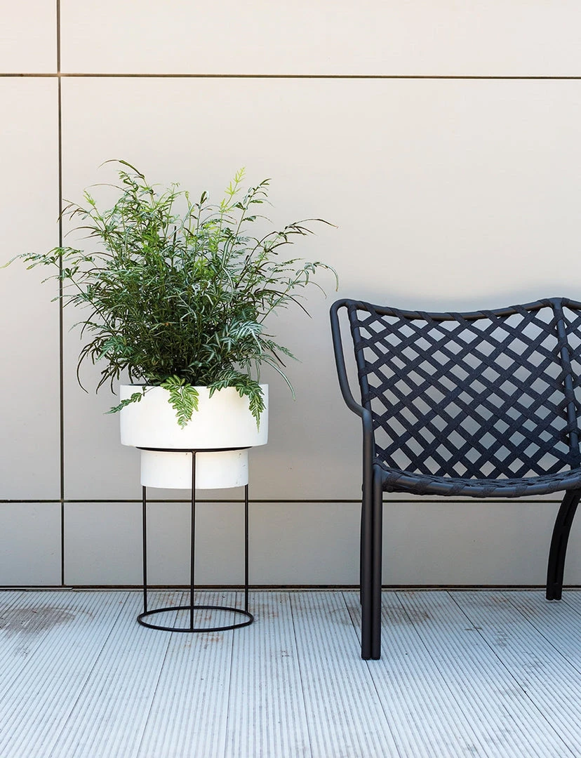 The Moa Plant stand is a modern addition to our outdoor collection. Lightweight polyresin pot in an iron stand. It is designed for outdoor use, frost-resistant, and features a drainage hole for ease of use.