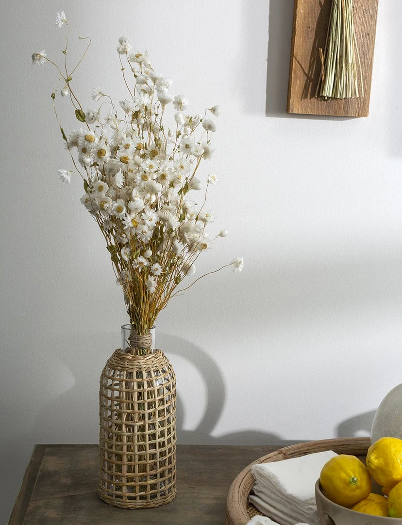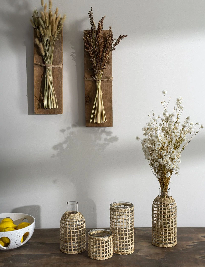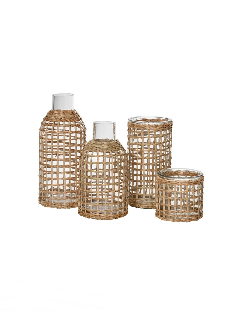 The Jaxon Pot is rattan covered glass for a tropical yet modern look, in neutral tones for a versatile and stylish look. Add style to the home or bring a neutral tropical vibe to your next event