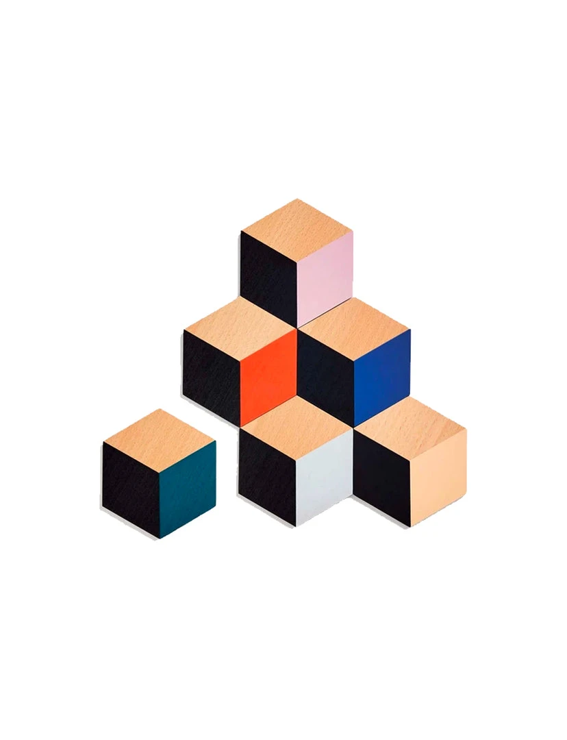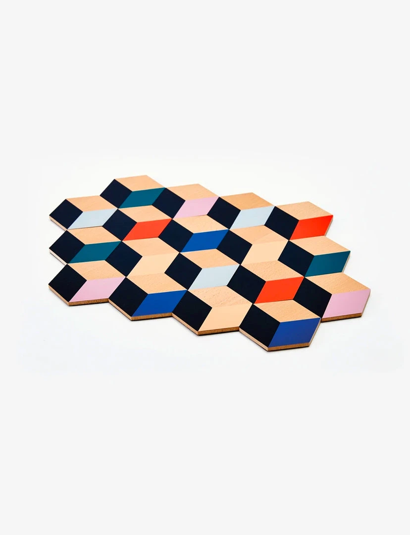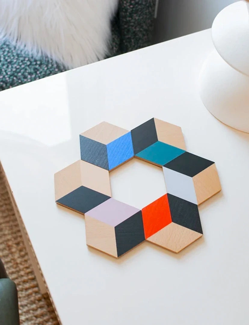 This set of six coasters can be artfully arranged to form a tiled trivet. The illusion of 3D through color and geometry allows for endless permutations, encouraging playful mosaic building on your table. Ideal as a housewarming gift for those with discerning taste or as decoration for your own intimate gatherings.