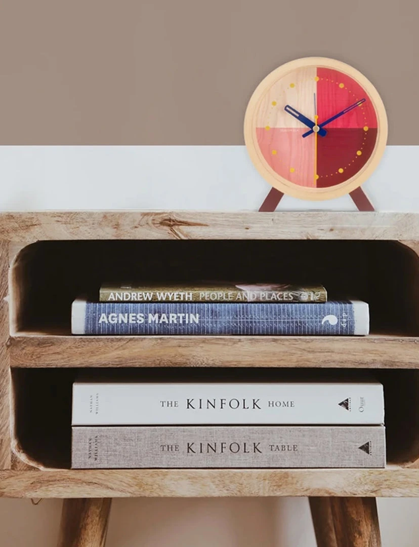 Cloudnola Flor Desk clocks are one of the ones that represent the fashion crossover into our collection. We are influenced by the fashion industry as much as we are influenced by home décor trends. This wood clock was designed by Het Grafisch Ambacht and is a clock version of a screen print shirt. Like in screen printing you mix two colors and get the third one. The geometric split just brings another level of minimalistic design.
