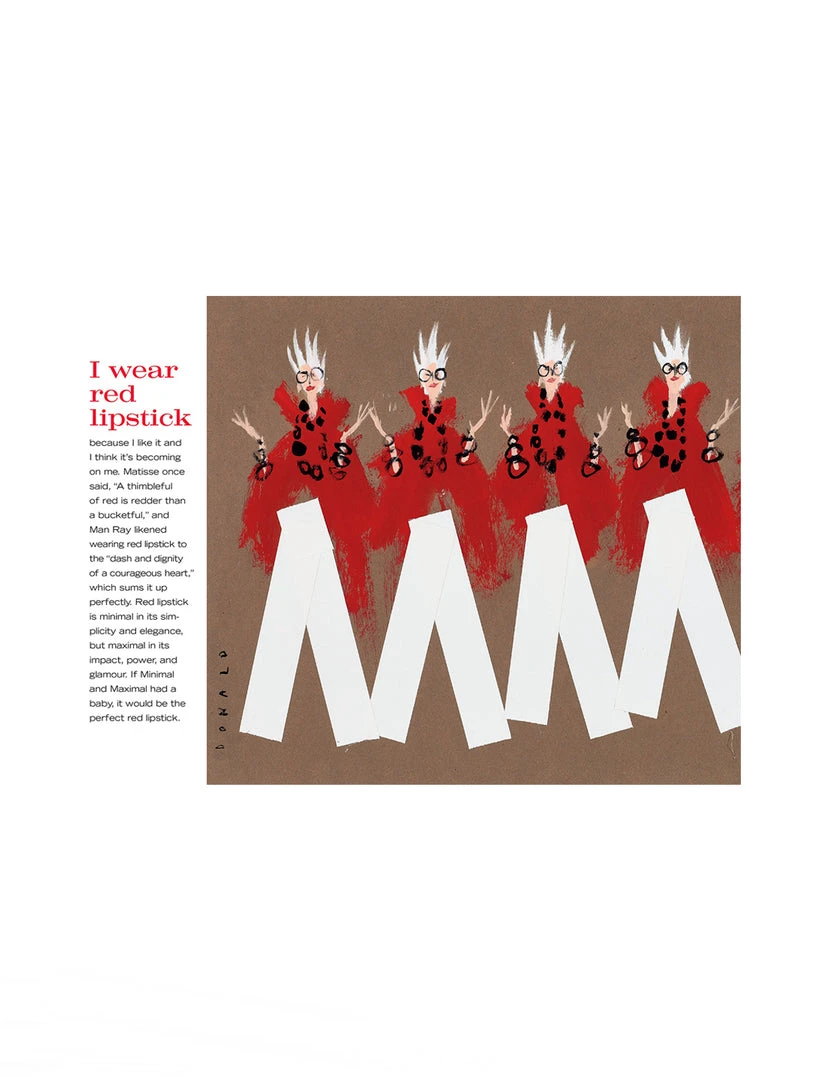 Now, this self-dubbed geriatric starlet, whose irrepressible authenticity, wit, candor, and infectious energy have earned her nearly a million followers on social media, has created an entertaining, thought-provoking, visually arresting, and inspiring volume—her first book—that captures her unique joie de vivre. Iris Apfel: Accidental Icon, contains an eclectic mix of musings and 180 full-color and black-and-white photos and iillustrations—presented in the same improvisational, multifaceted style that have made Iris a contemporary fashion icon. Astute maxims, witty anecdotes from childhood to the present, essays on style and various subjects, from the decline of manners to the importance of taking risks, fill the book as do lists, both proclamatory, revelatory, and advisory.