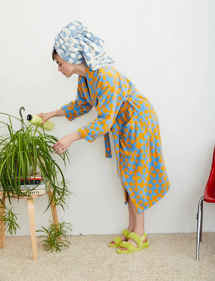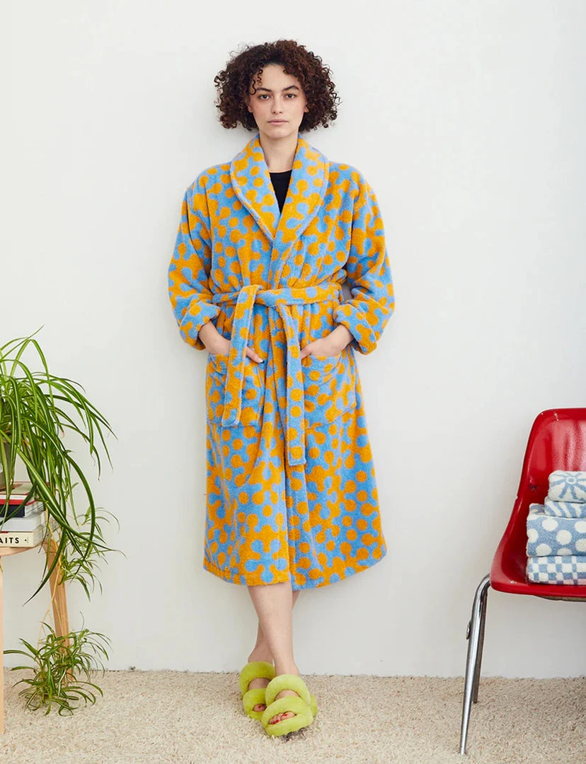 Bathrobe in Atom pattern. Cotton terry bathrobe with shawl collar, patch pockets, and tie in cornflower and marigold Atom pattern.