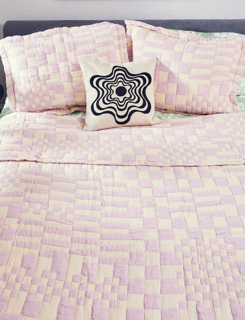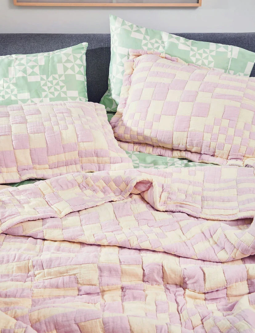 Coverlet Set in lilac and cream Check print. Woven matelassé coverlet with an inner layer of insulation for a quilted effect. Stonewashed, with an extra soft and gauzy hand feel.