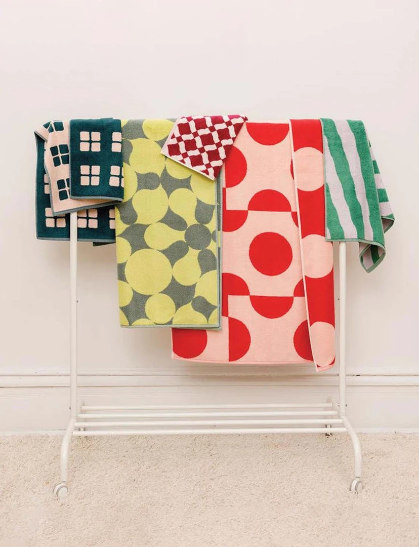 Bath towel in new Pattern. 100% brushed cotton terry, reversible.