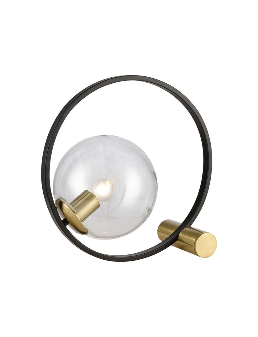 Using the cornerstones of Midcentury design, the Ayla desk lamp plays with form and function. The bulb is housed in a glass orb within a steel ring and is counter balanced by a metal footing. Black and honey brass finishes tie the chic look together.