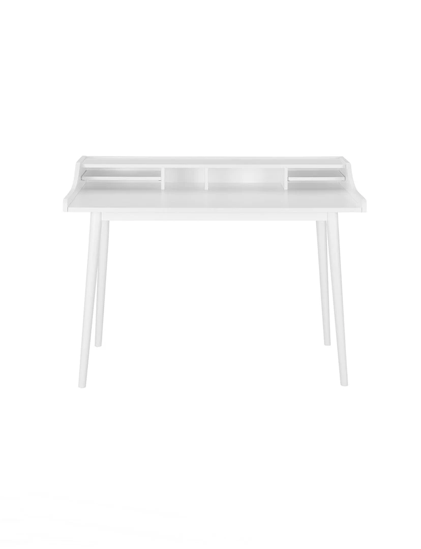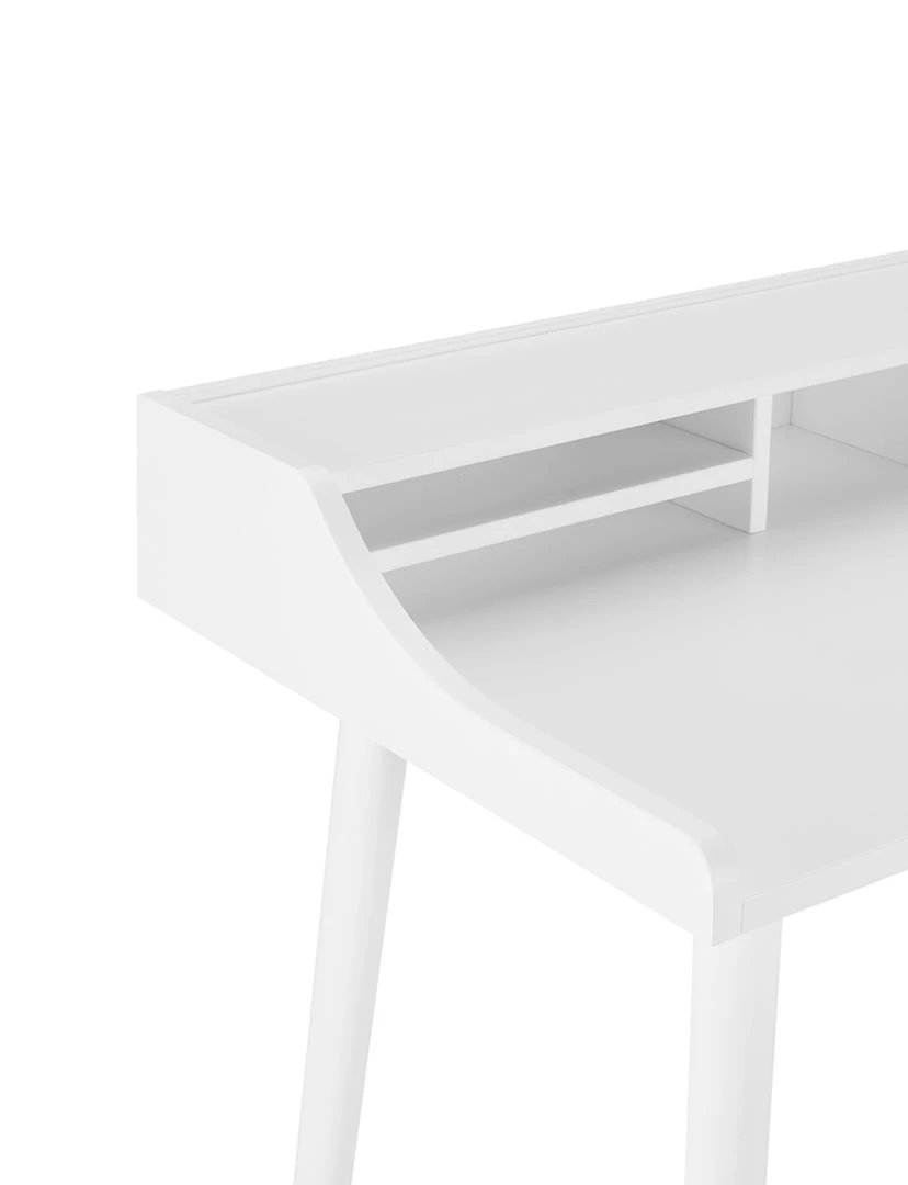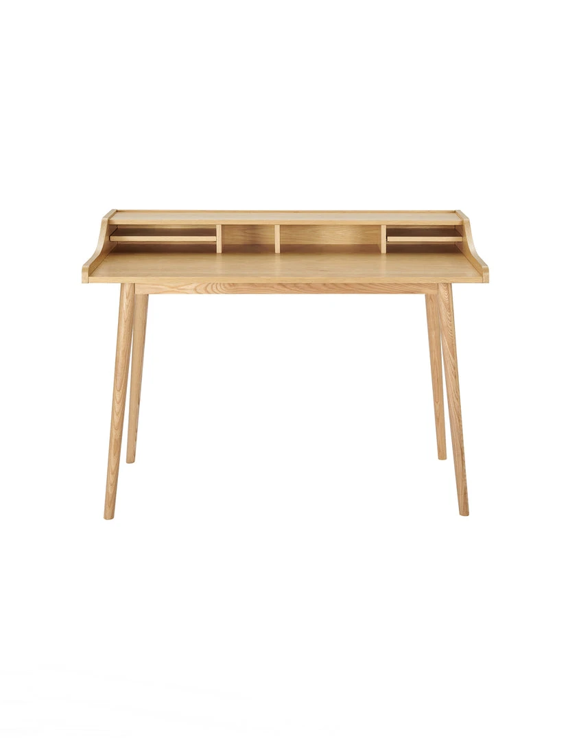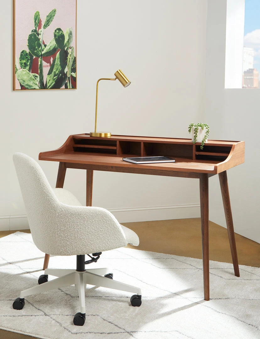 The Fiona Desk features an American walnut veneer top with solid wood legs. The top contains six open shelves of varying sizes to store all your small office supplies in one easy-to-reach location.