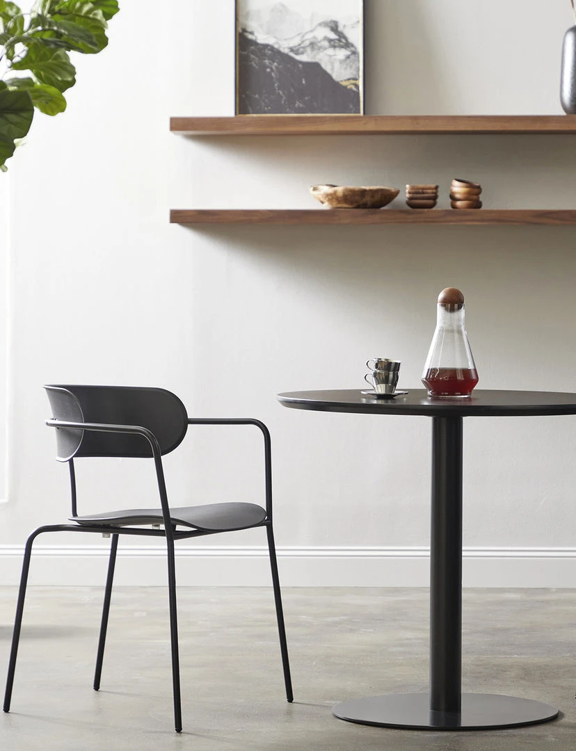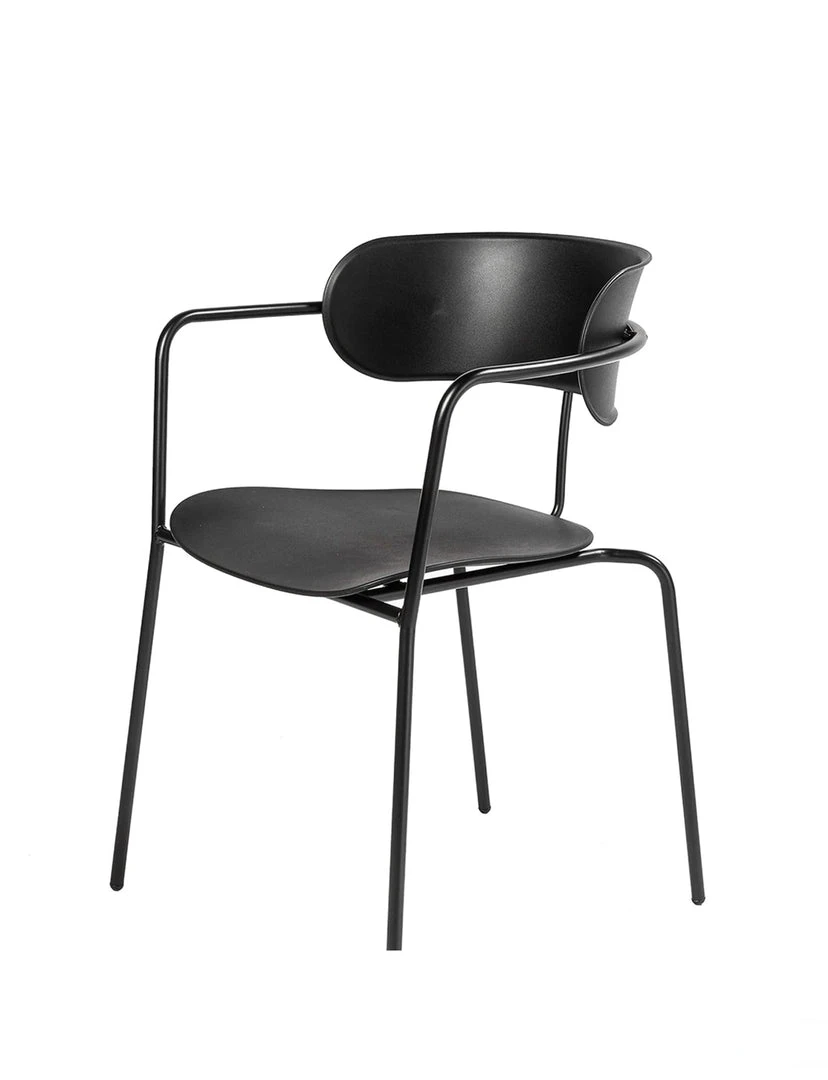 With a modern, minimalist design and chic silhouette, the Perrier Stacking Armchair is as stylish as it is functional. This chair features a polypropylene seat and back and a matte black steel frame, legs and armrests. The convenient stackable design allows up to 4 chairs to be stacked for easy storage.