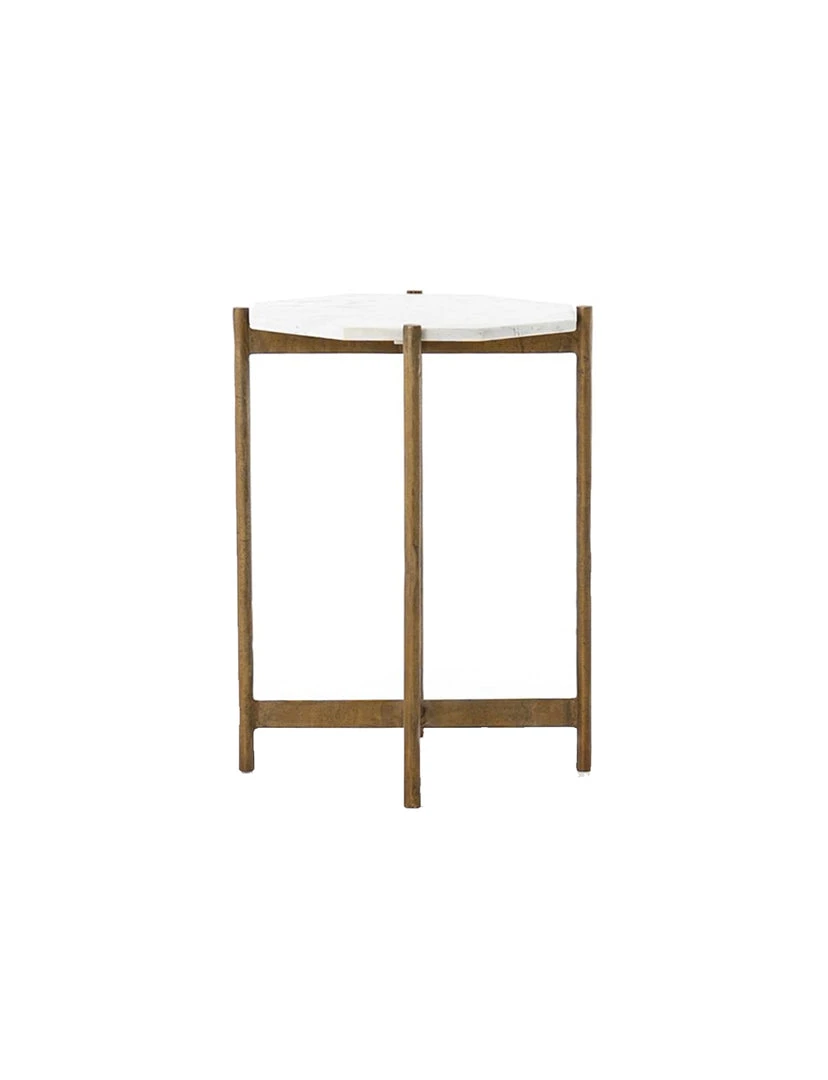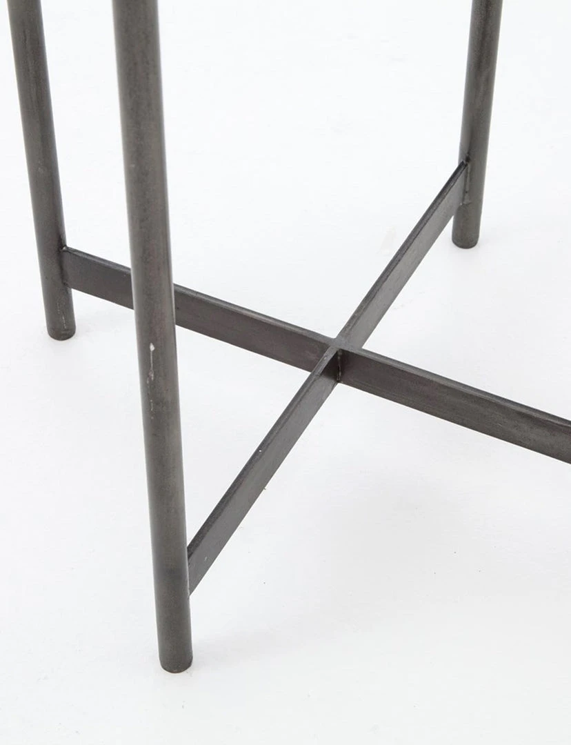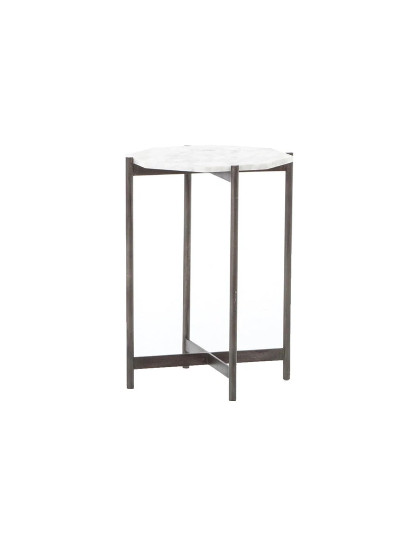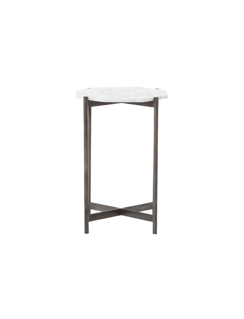 Opposites do tend to attract. A leggy base in rough, hammered-grey aluminum plays up a refined, precisely shaped white marble top.