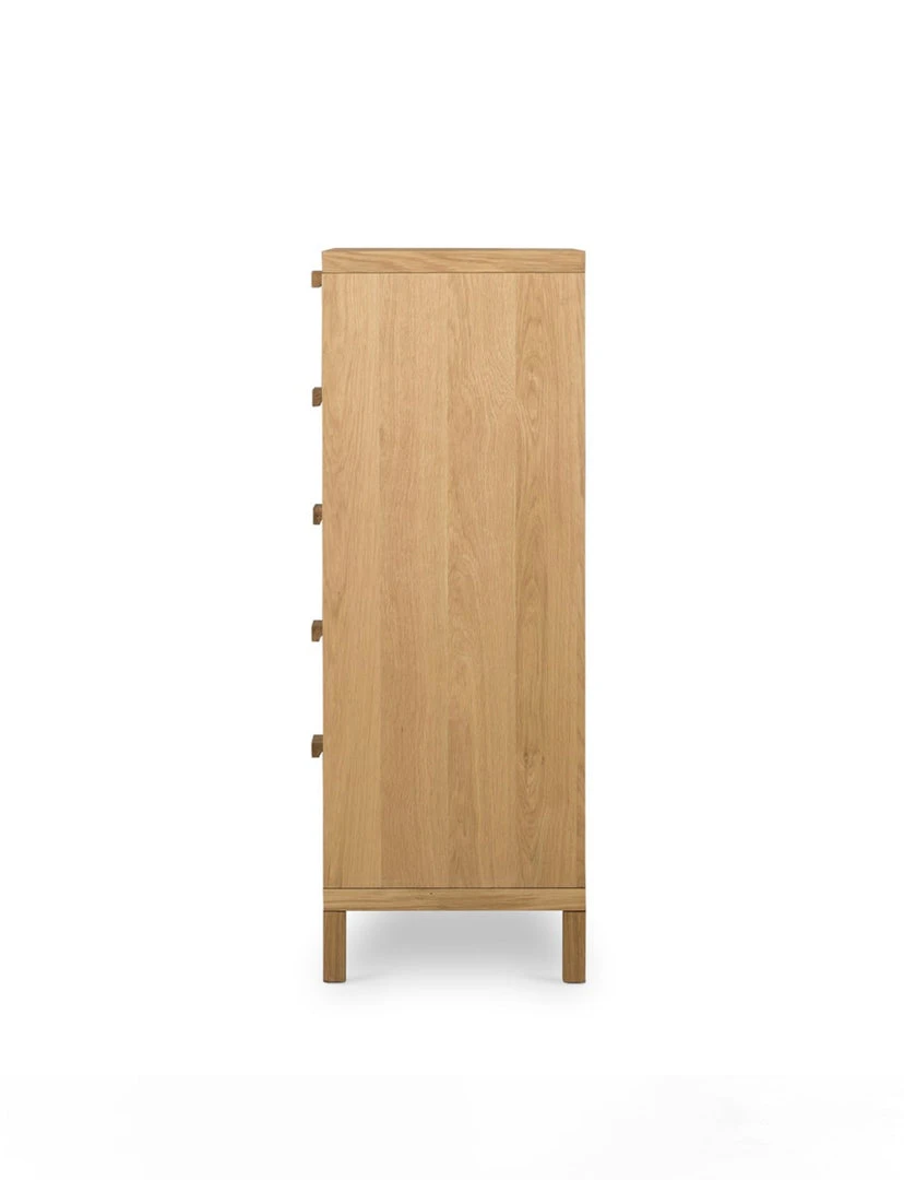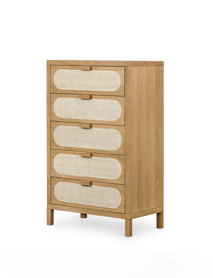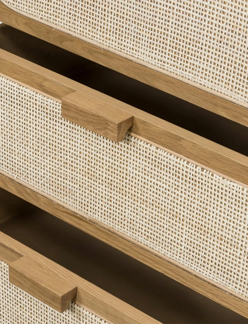 Au naturale. Honey-finished oak welcomes five spacious drawers with pill-shaped cane fronts, for a soft, neutral look with lasting modernity.