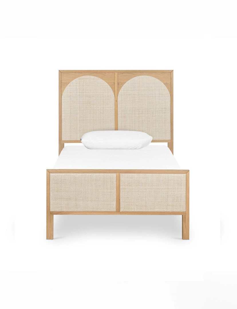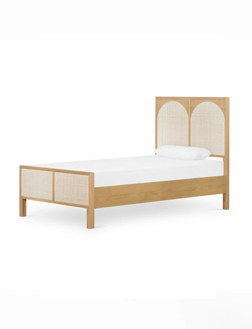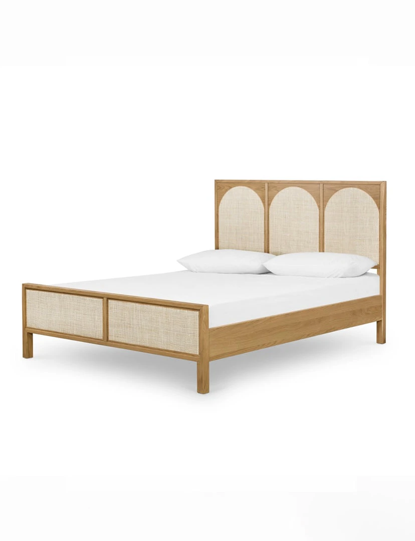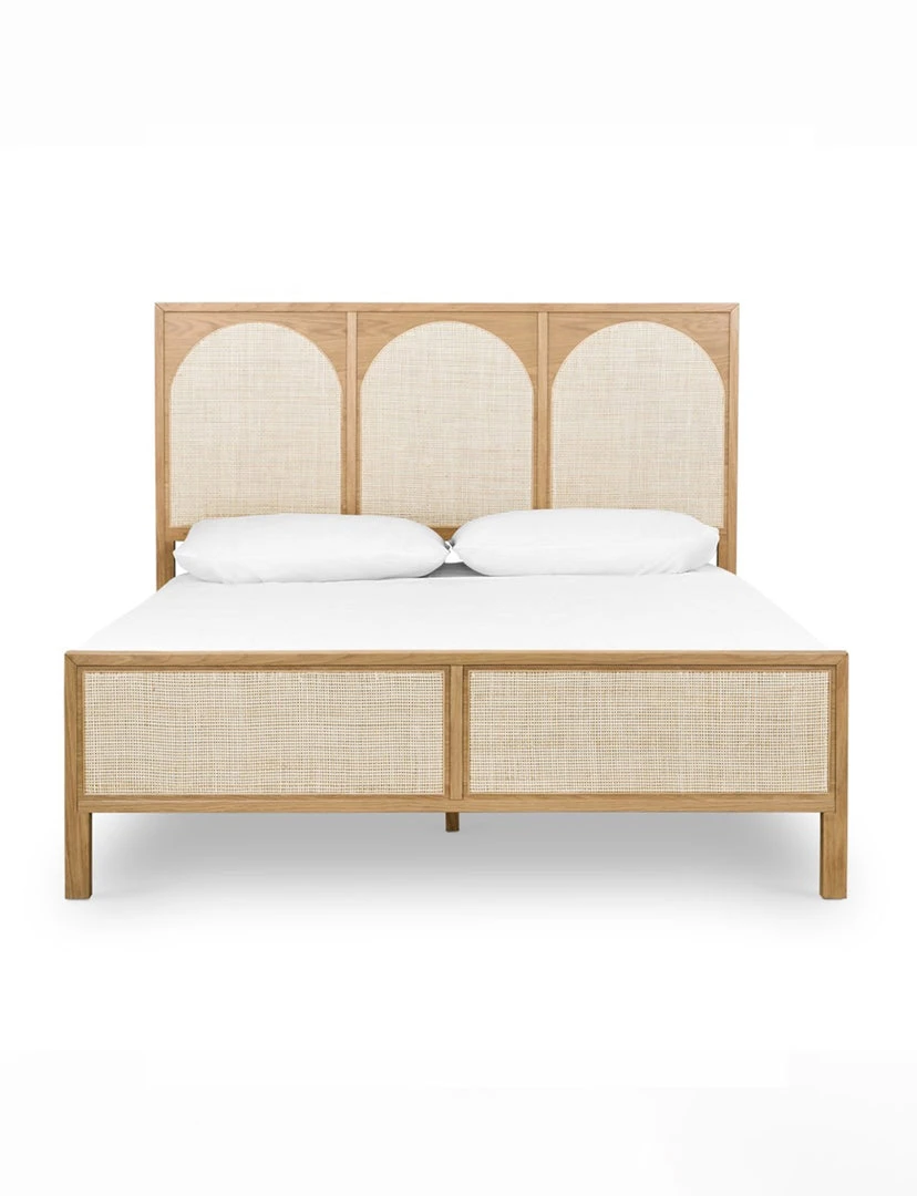 Au naturale. A light oak bed frame features trend-forward cane arches and panel footboard detailing, for a soft, neutral look with lasting modernity.