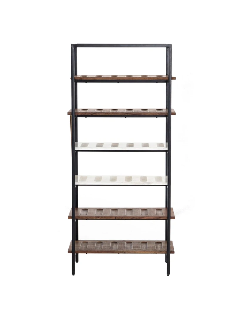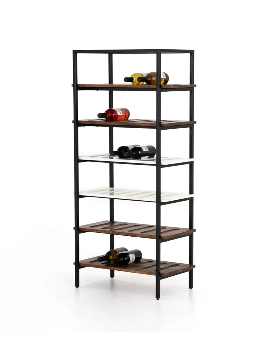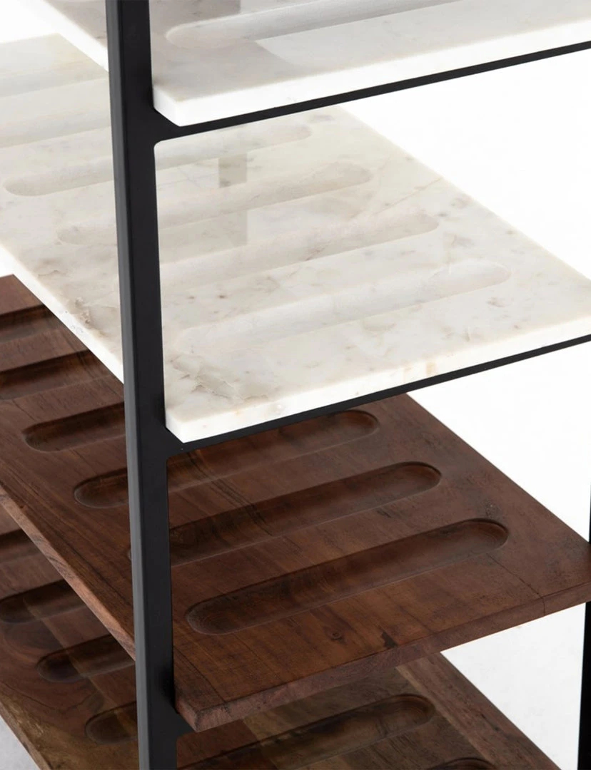 Finished in a matte black, a freestanding iron wine rack features six shelves of toasted acacia and honed white marble, for stylish storage and display of up to 36 bottles. Clever divots keep each bottle securely in place.