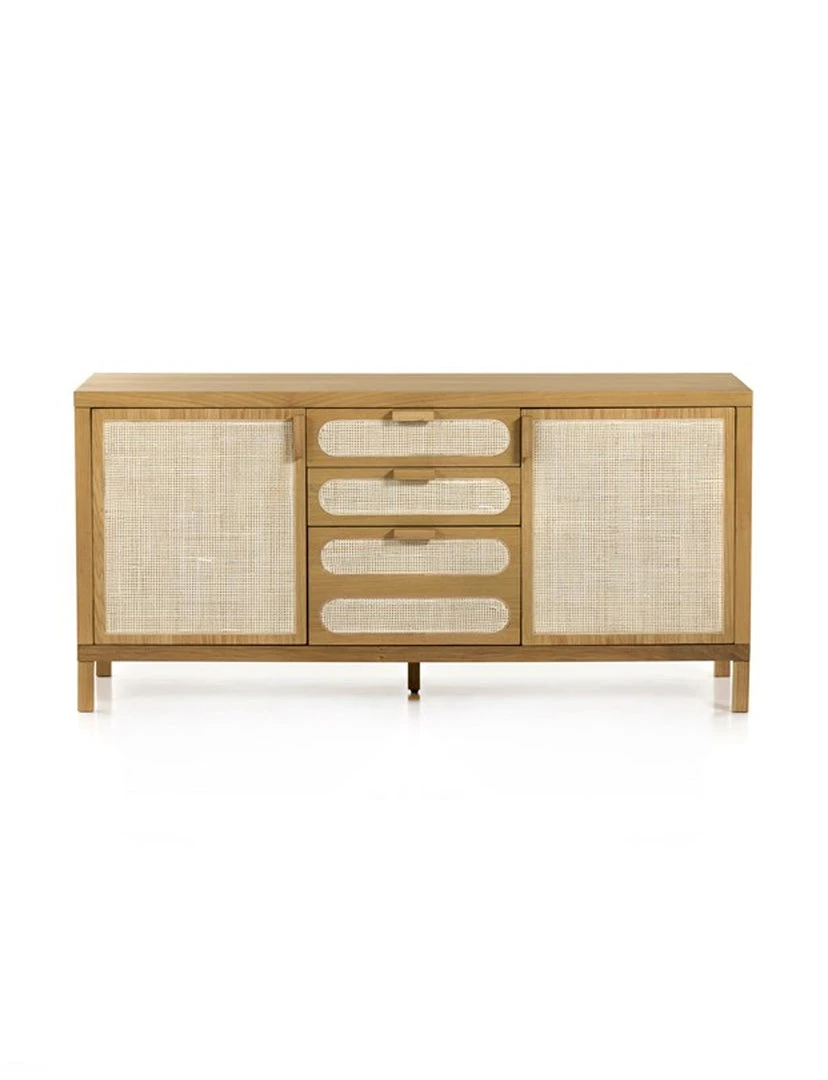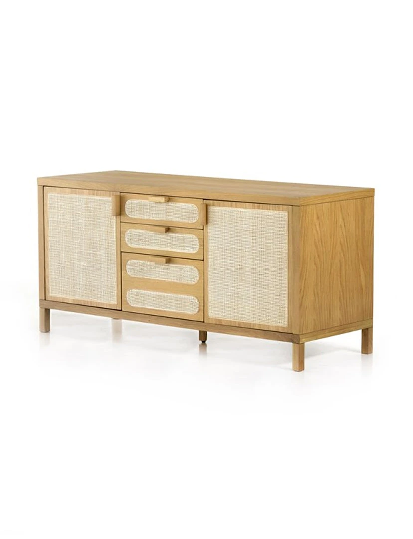 Au naturale. Honey-finished oak welcomes dual drawers with wood-backed cane paneling plus a roomier drawer for file storage. Side cabinetry offers even-more storage options, while rear cutouts make for seamless cord management.