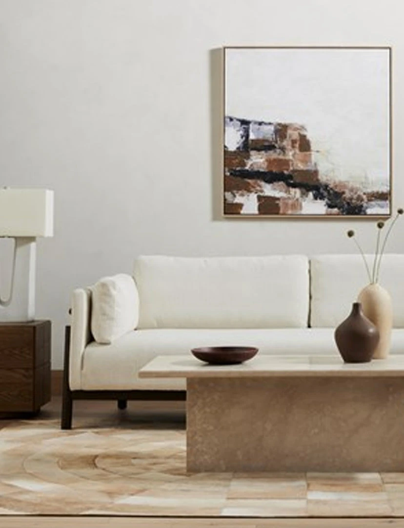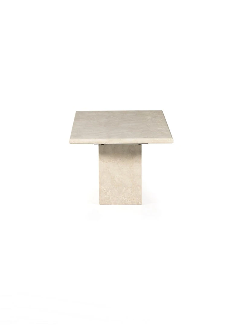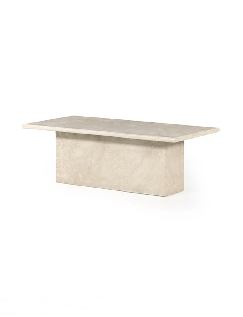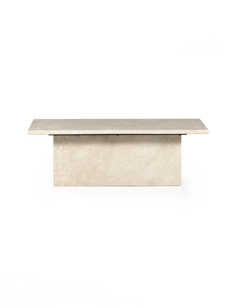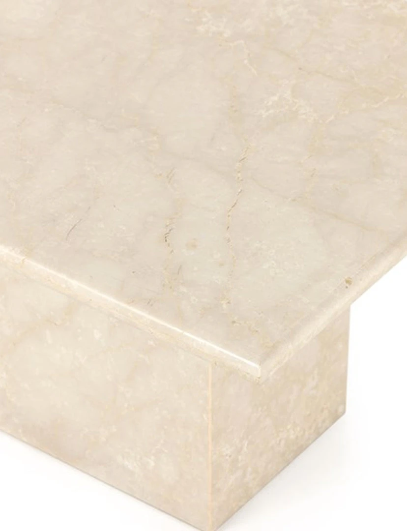 Inspired by Italian design of the 1970s, a monolithic coffee table is made entirely from solid marble in a soft cream.