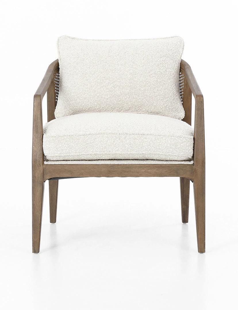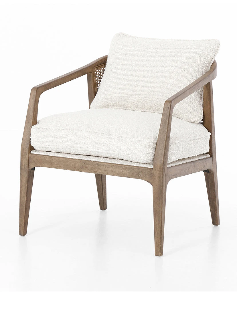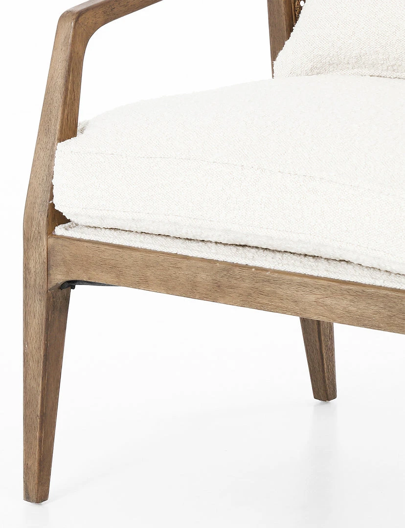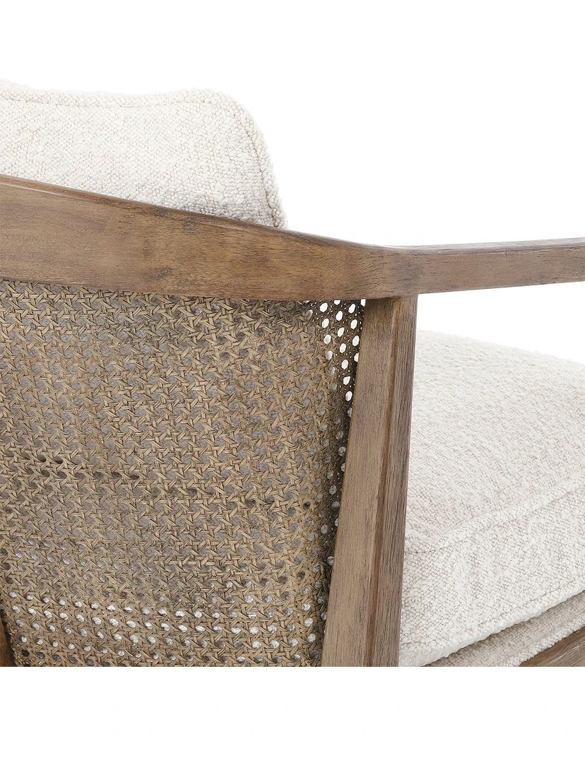 Mid-century modern inspiration with a French twist. Sleek, hand-shaped parawood framing is accented by a textural woven rattan back.