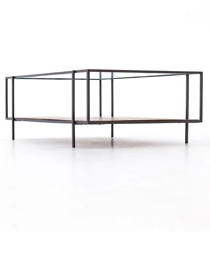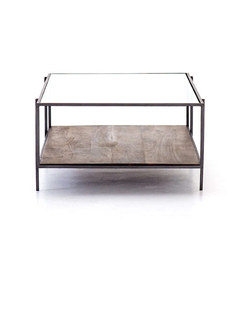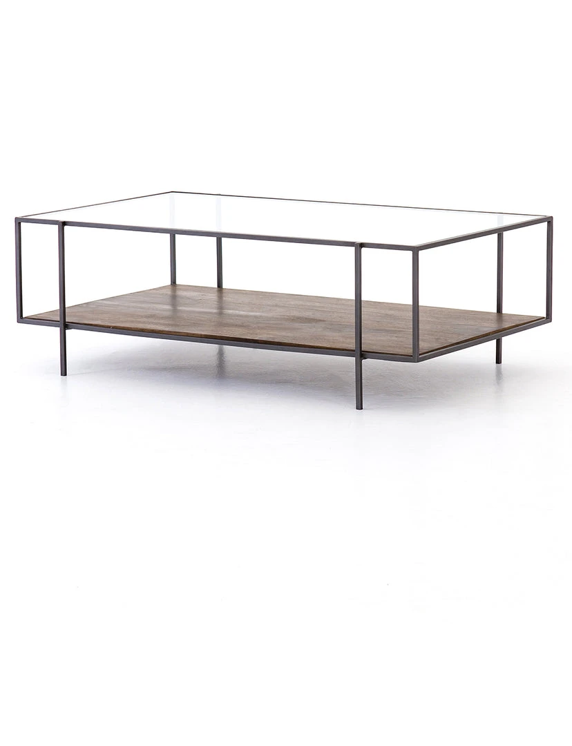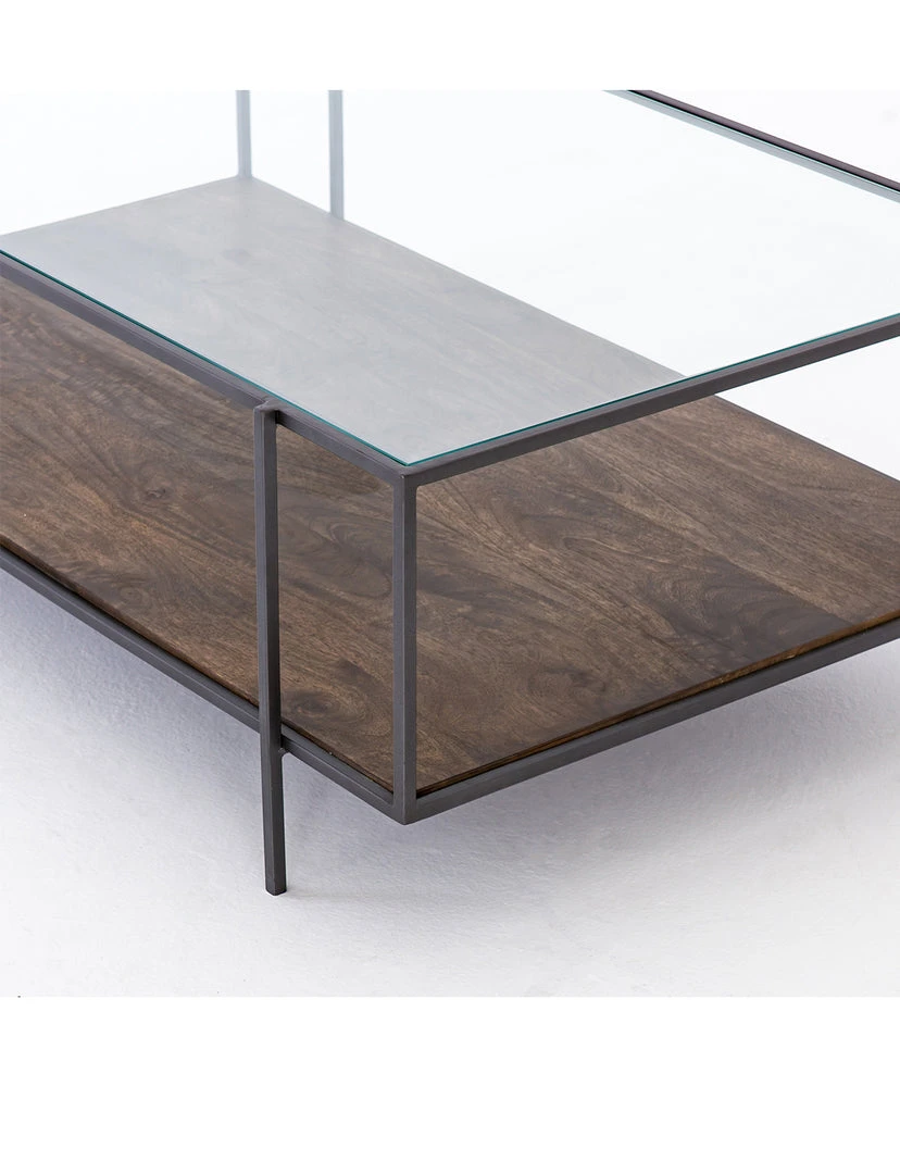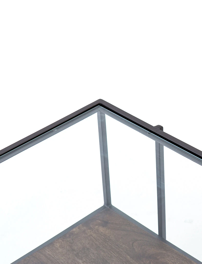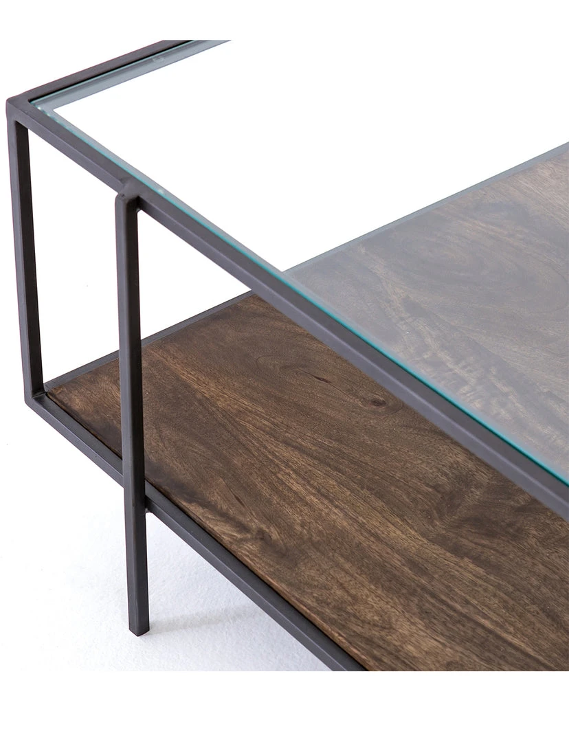 A shadowbox-style coffee table clears the way for your inner collector. Display prized posessions within a glass enclosure of gunmetal-finished iron framing and aged brown mango wood.