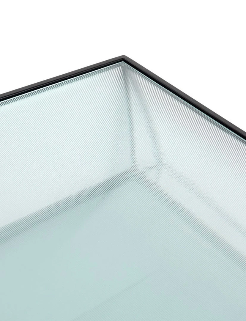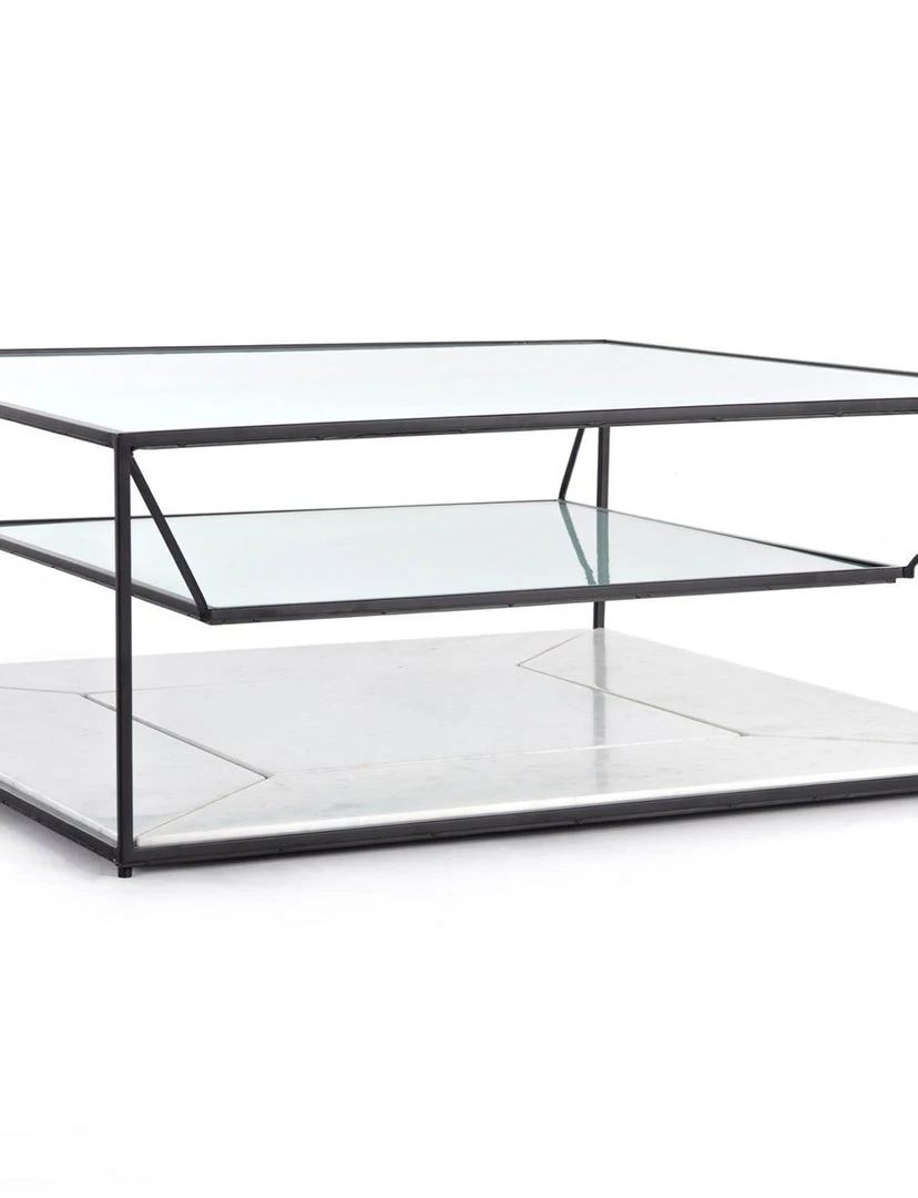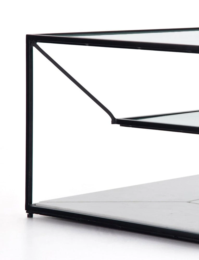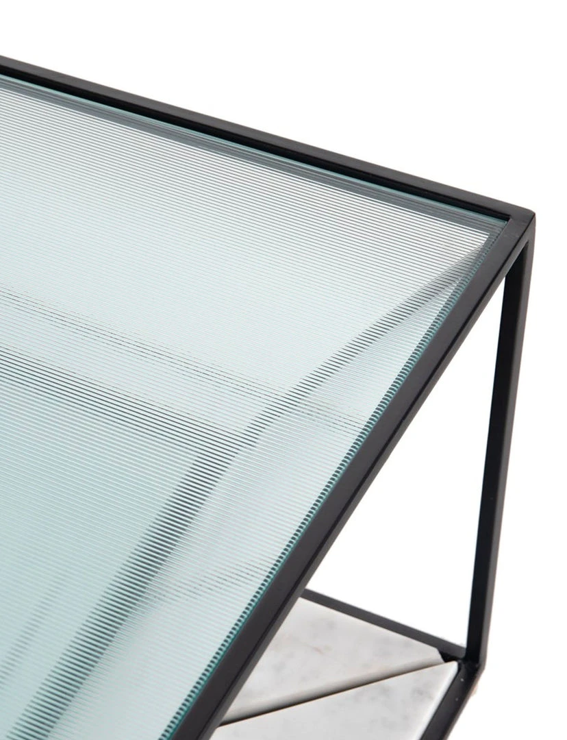 Lighten up. Airy, black-finished iron forms an open frame for a squared base of polished white marble plus suspended shelving of fluted glass – perfect for showcasing favorite coffee table books and more.