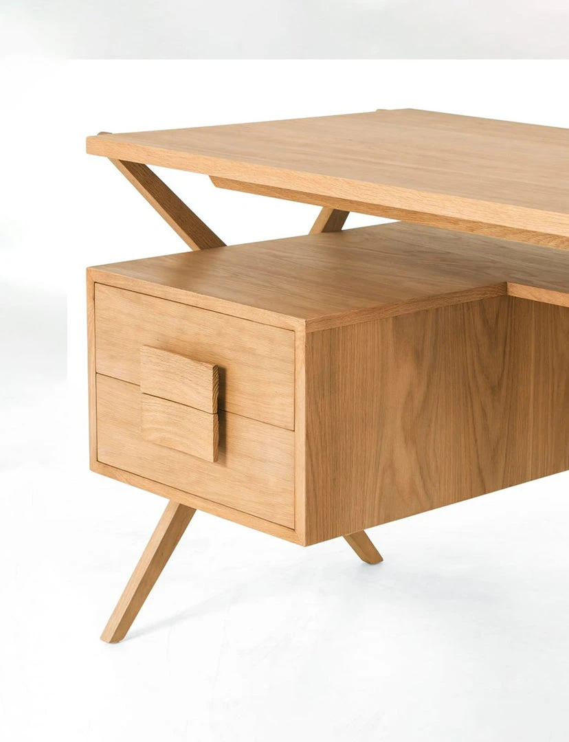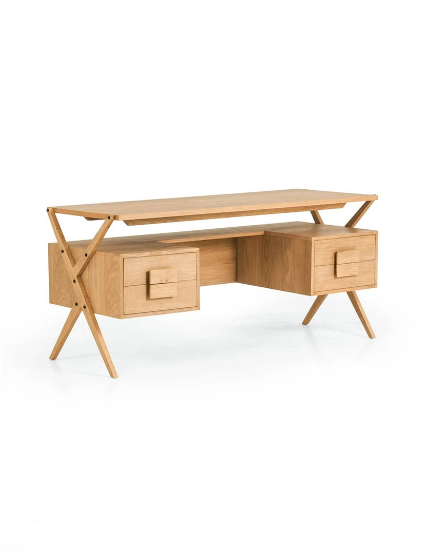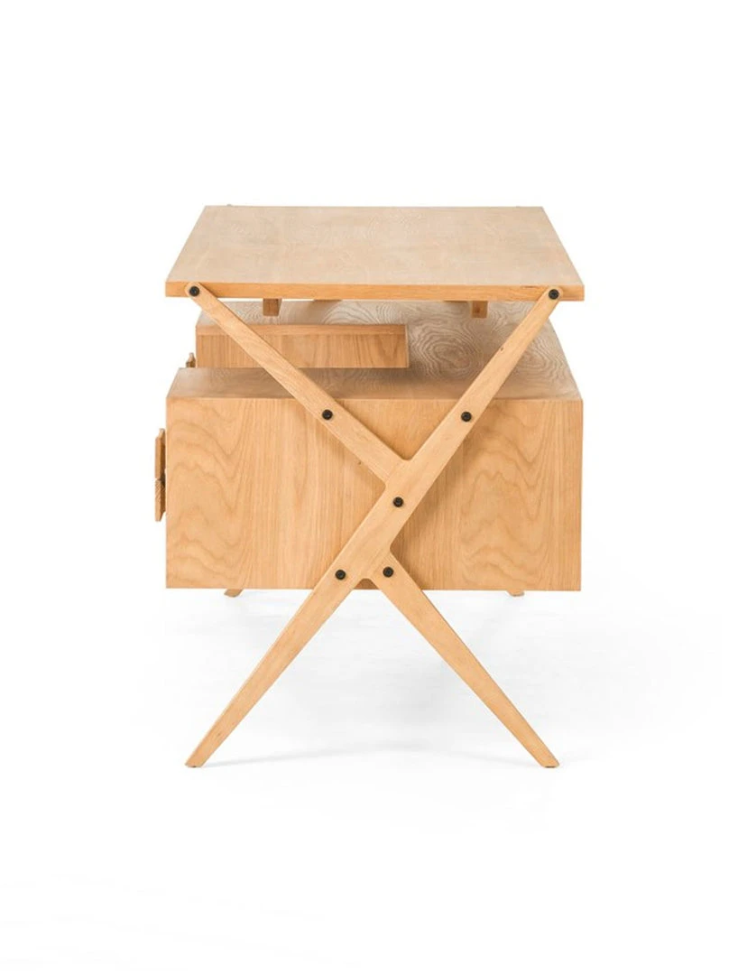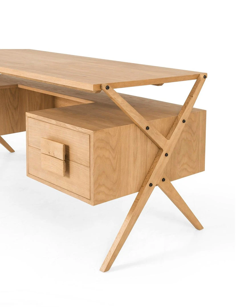 This Burio desk is a natural solid oak that forms an architectural-inspired desk with midcentury-style scissor legs for a light, float-like look with naturalist vibes. Uniquely shaped pulls reveal four spacious soft-close drawers, bringing generous storage options to the modern office.