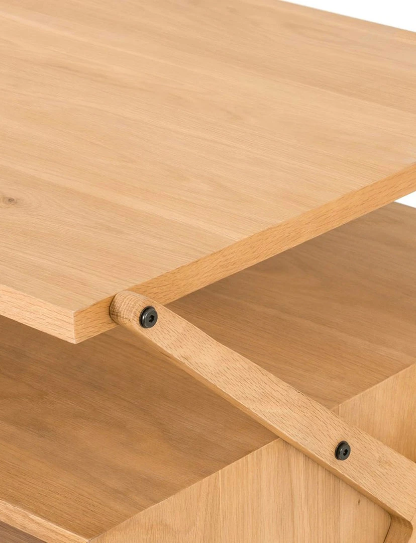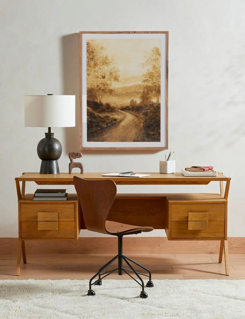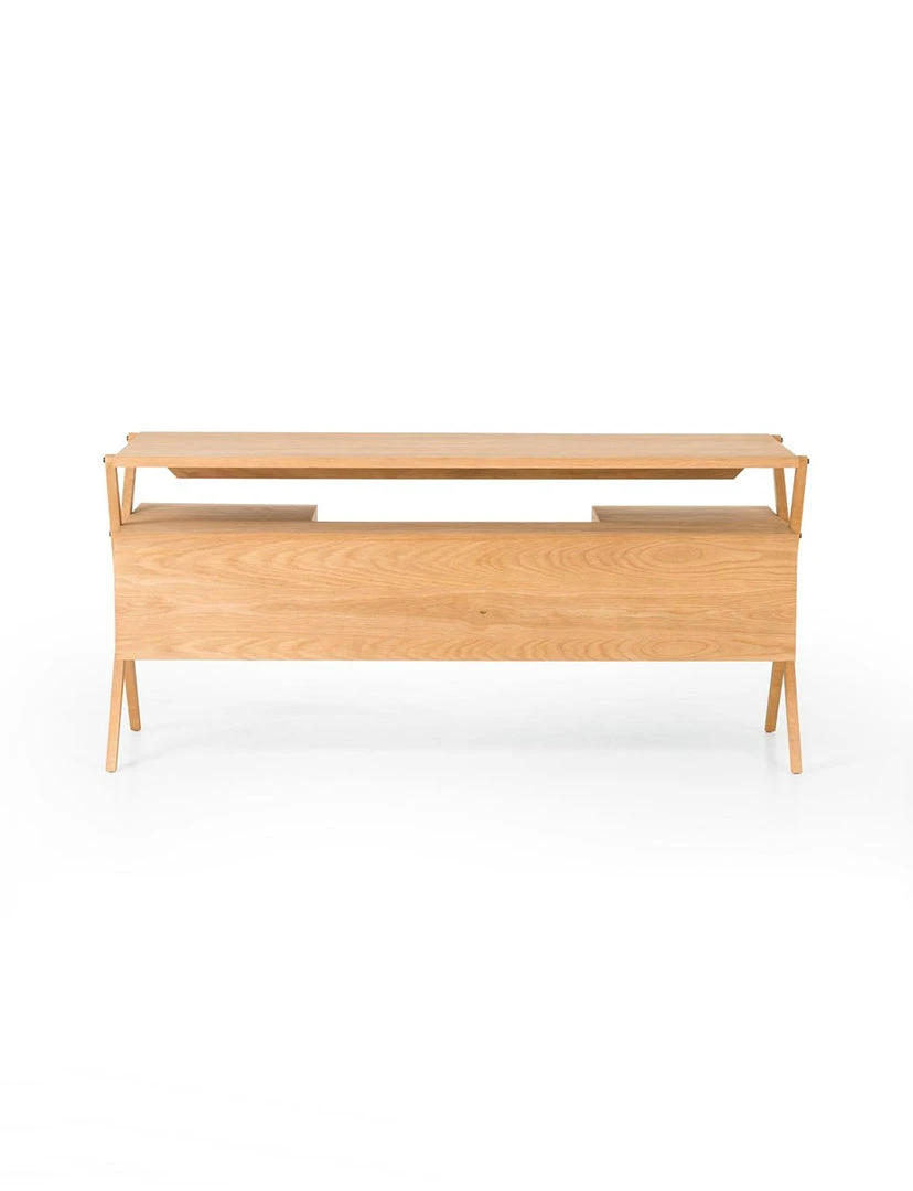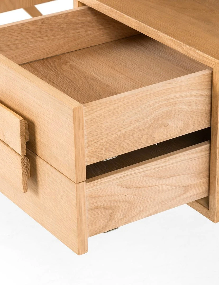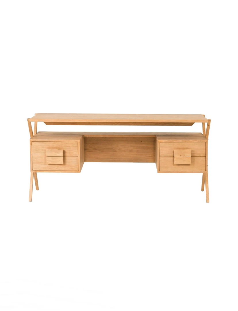 This Burio desk is a natural solid oak that forms an architectural-inspired desk with midcentury-style scissor legs for a light, float-like look with naturalist vibes. Uniquely shaped pulls reveal four spacious soft-close drawers, bringing generous storage options to the modern office.