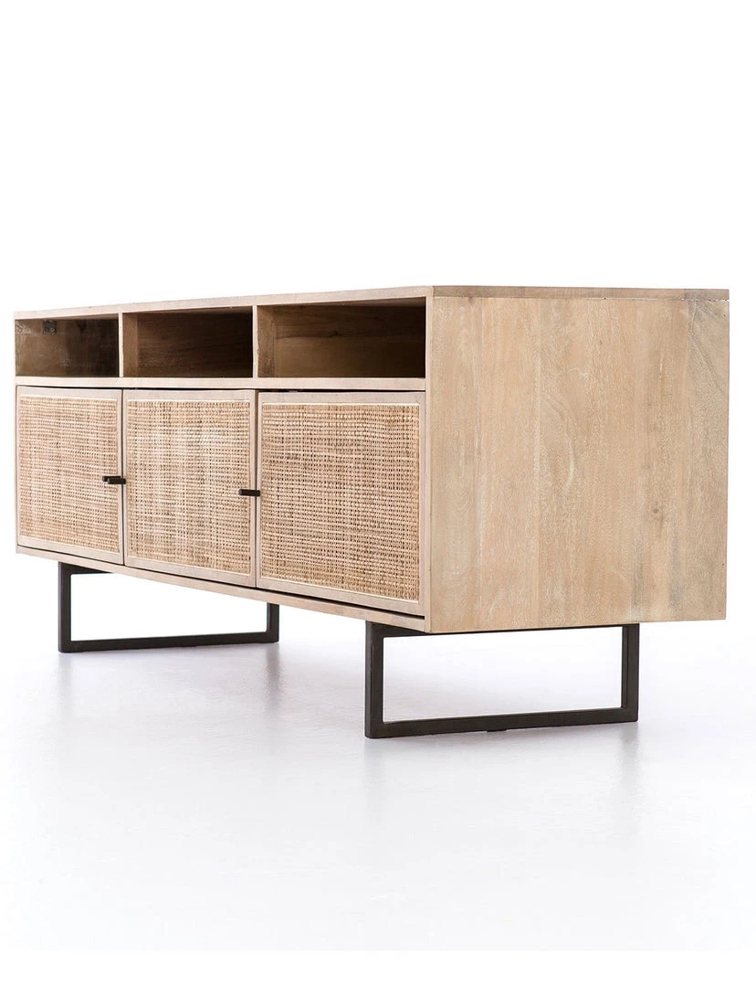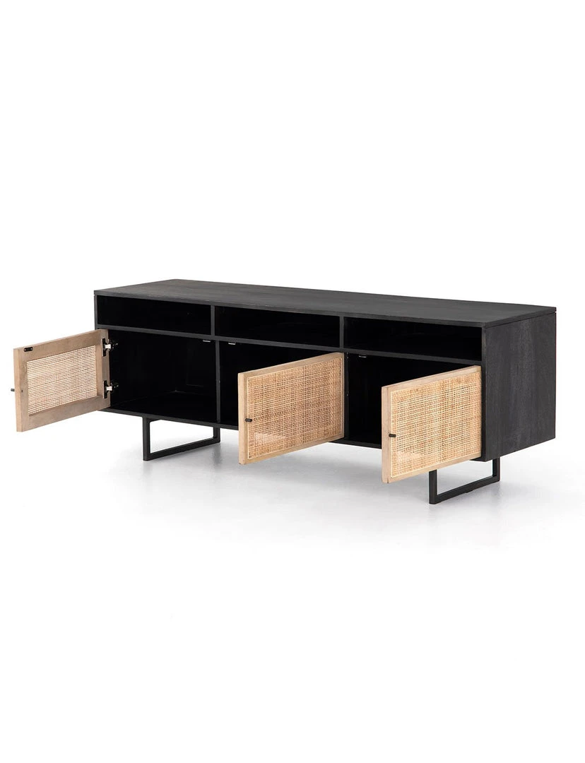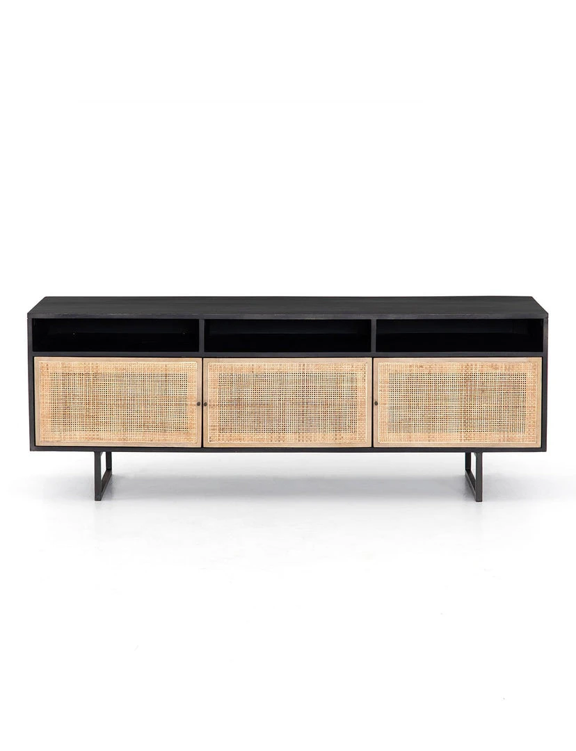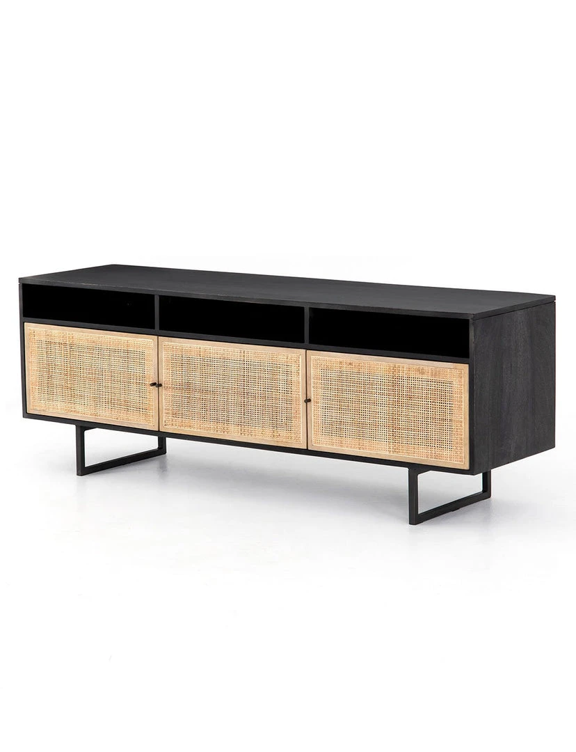 Mid-century-inspired style with an organic twist. Surrounded by mango casing, light cane weaves for a fresh look with natural depth. Angular gunmetal-finished iron legs offer an intriguing contrast of texture and tone. Shelving and posterior cord management for modern media storage.