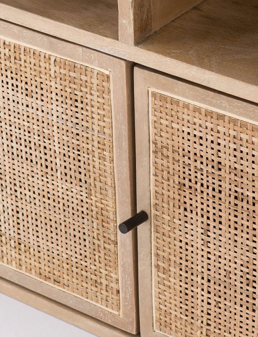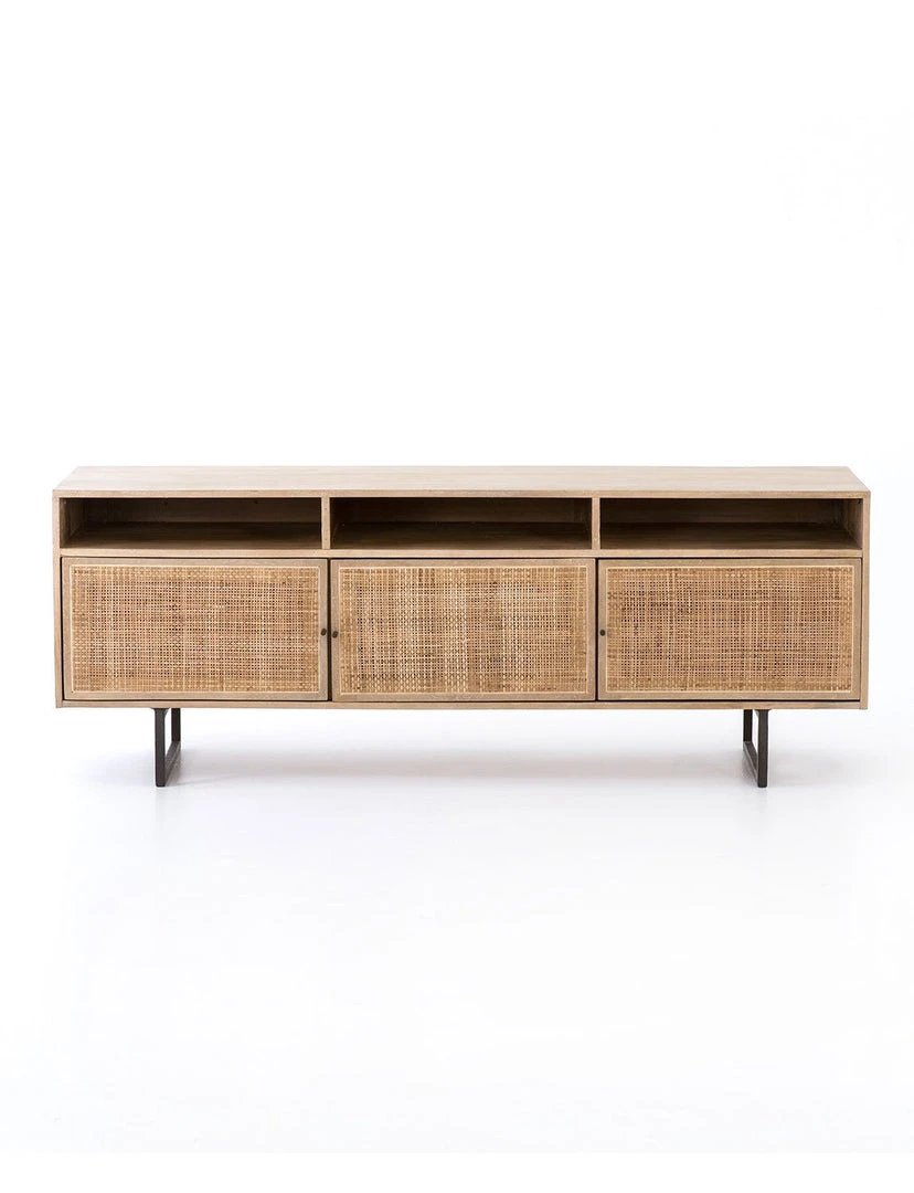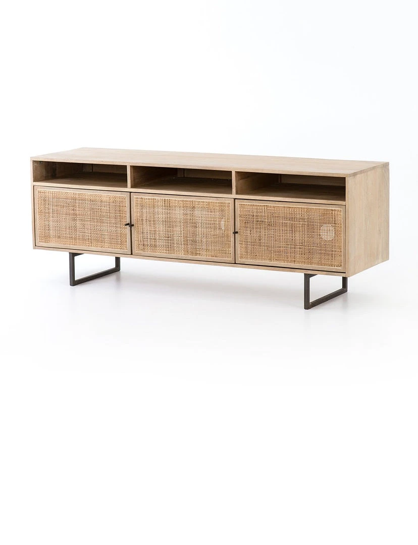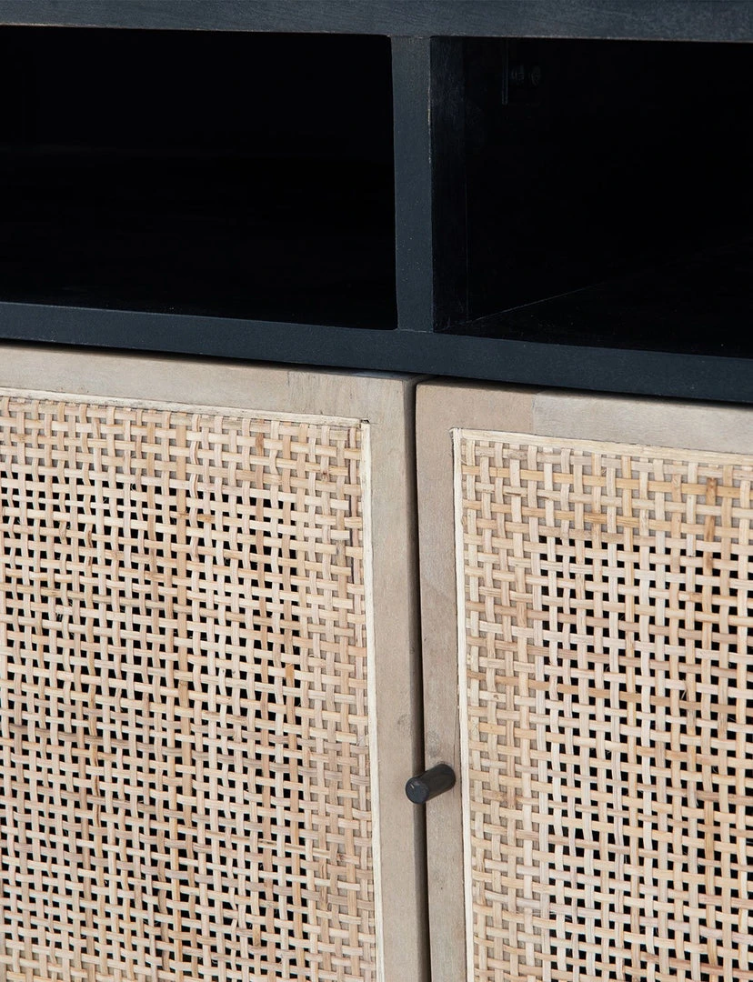 Mid-century-inspired style with an organic twist. Surrounded by mango casing, light cane weaves for a fresh look with natural depth. Angular gunmetal-finished iron legs offer an intriguing contrast of texture and tone. Shelving and posterior cord management for modern media storage.