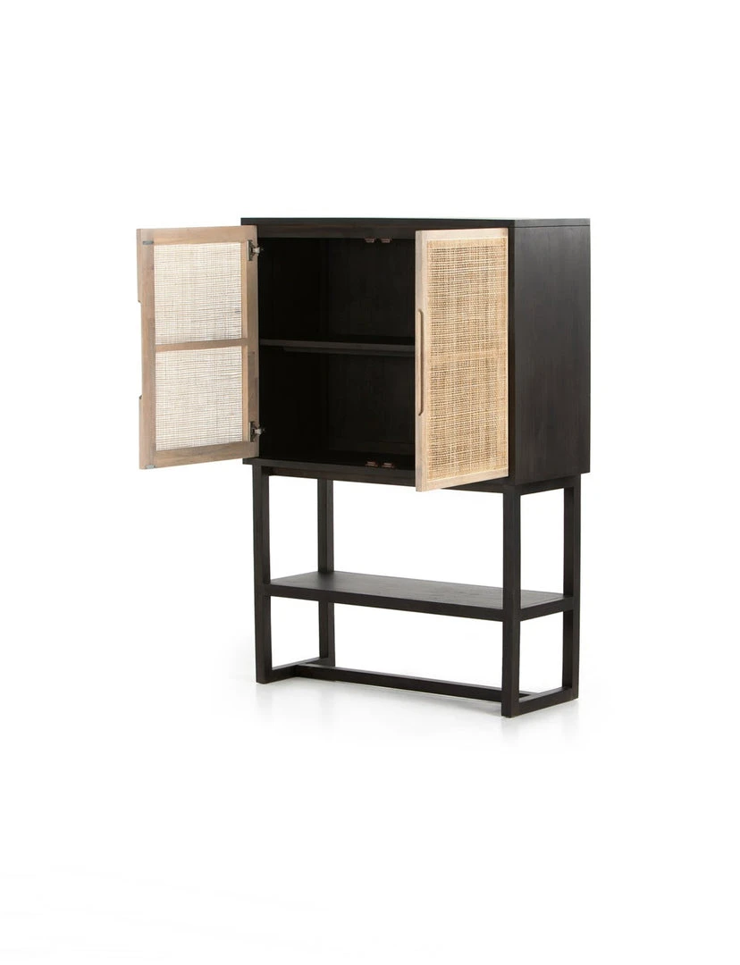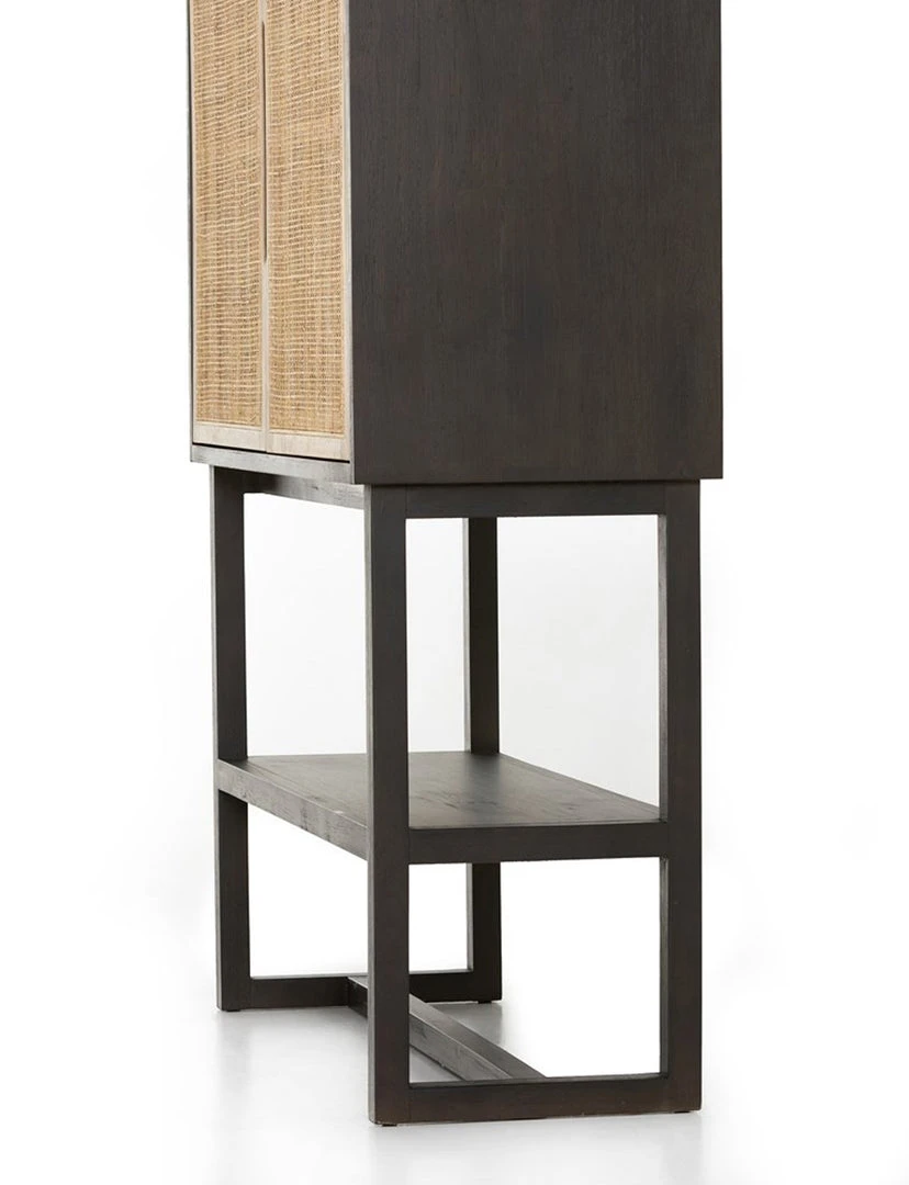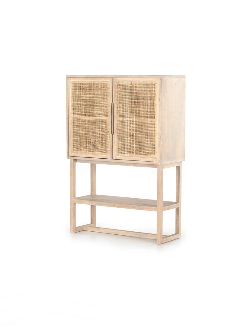 Mid century-spirited while beautifully on trend. Natural mango creates stately casing for textural door fronts of natural cane. Style as a bar cabinet, book shelf or versatile storage piece. Open lower shelving brings even more storage and styling options to the table.