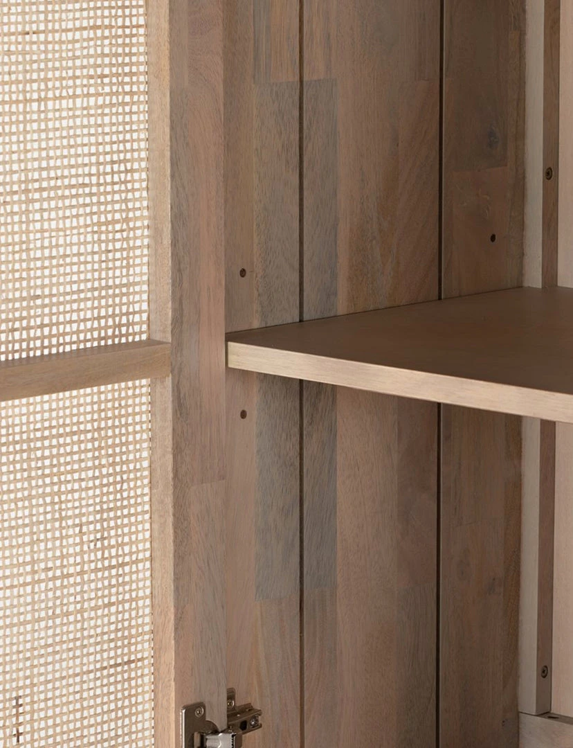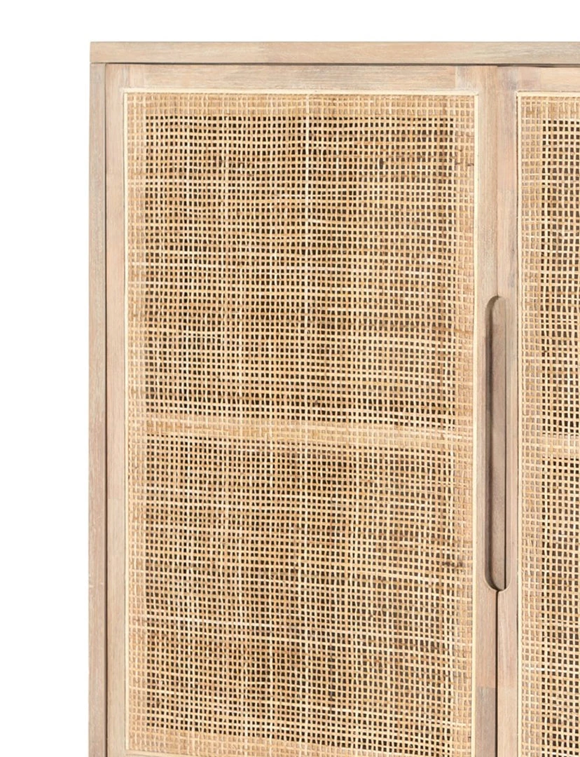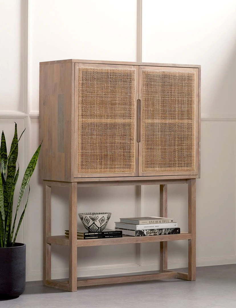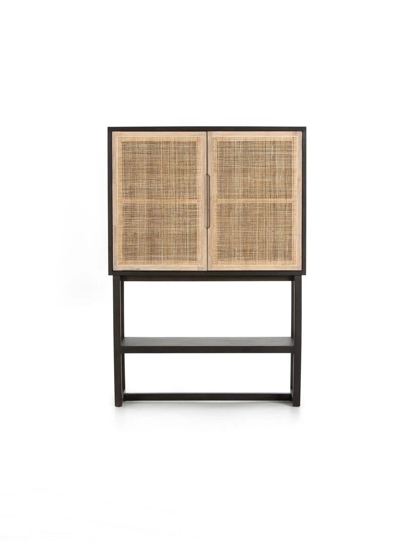 Mid century-spirited while beautifully on trend. Natural mango creates stately casing for textural door fronts of natural cane. Style as a bar cabinet, book shelf or versatile storage piece. Open lower shelving brings even more storage and styling options to the table.