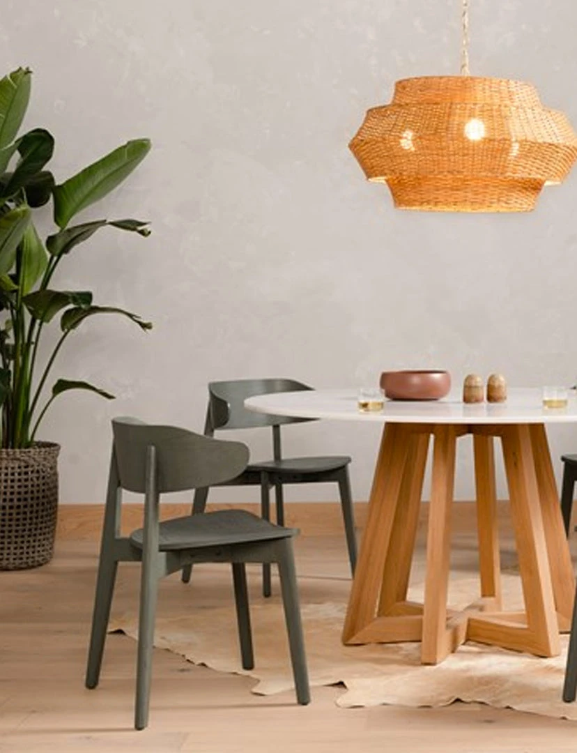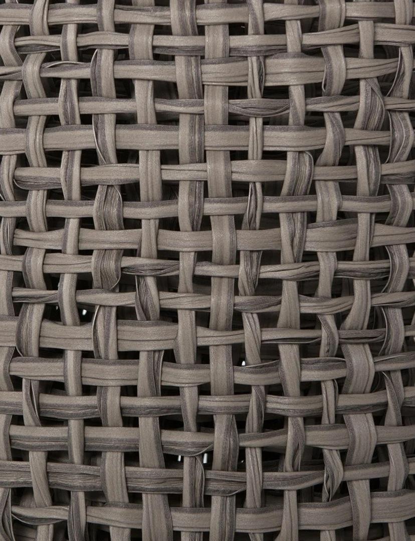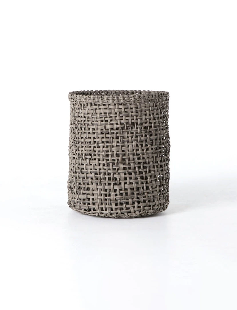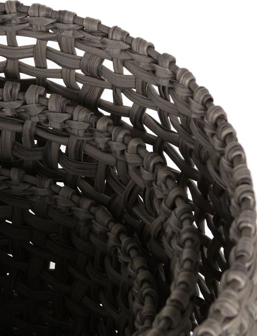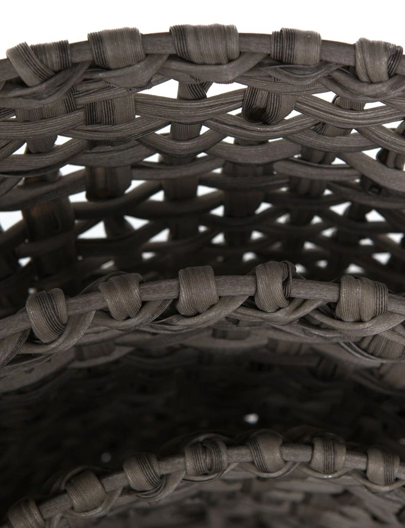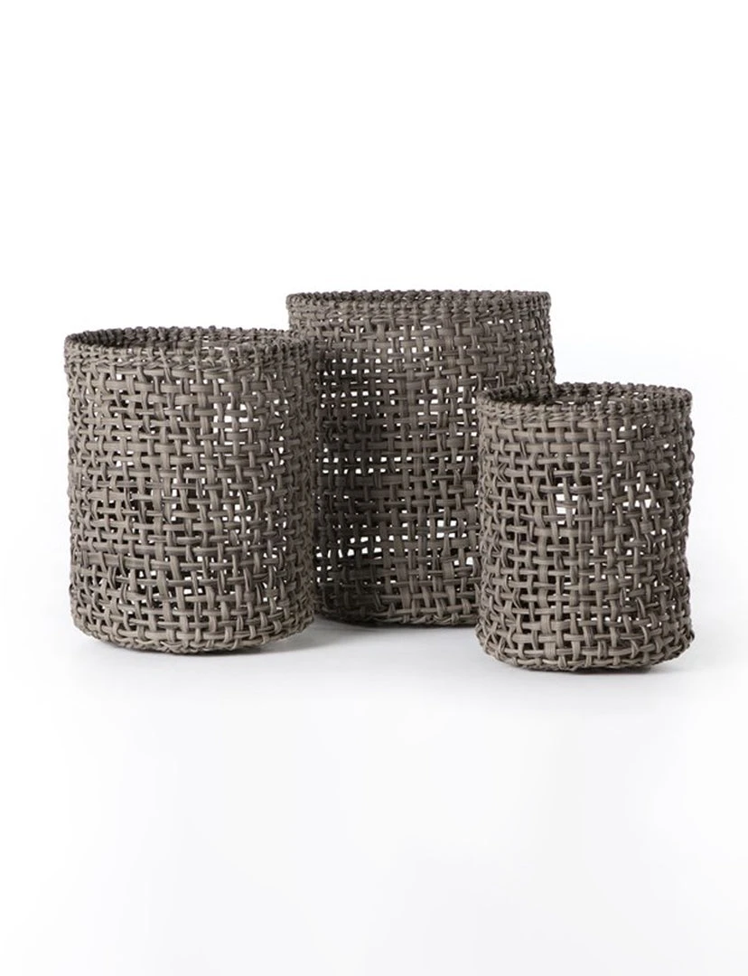 Three round baskets in natural tones add a bit of bohemian charm. Made from recycled plastics, each is a bit different. Safe for outdoor spaces — cover or store indoors during inclement weather and when not in use.
