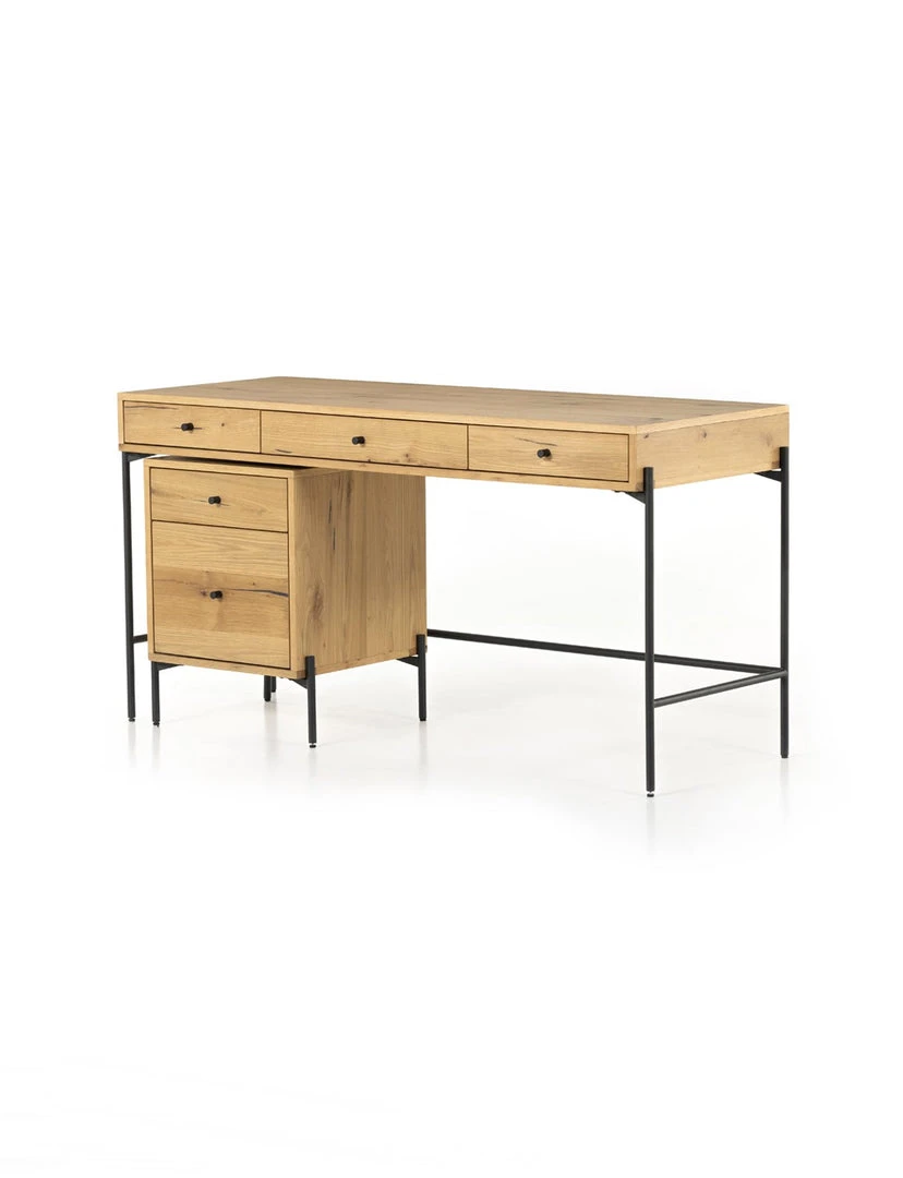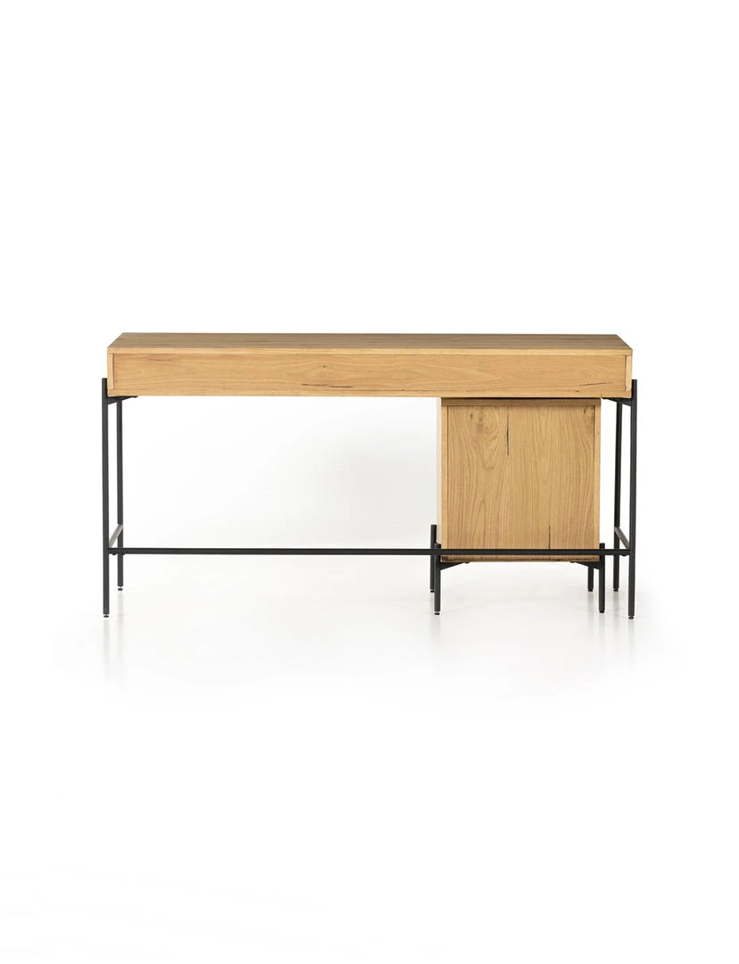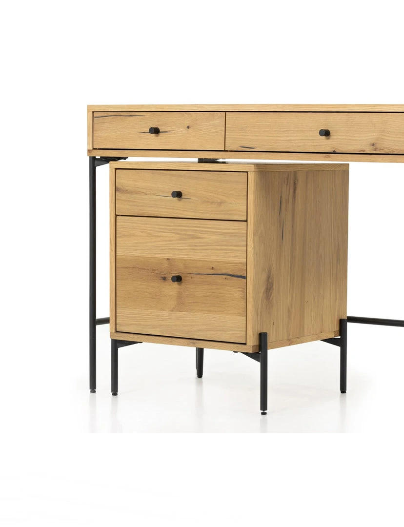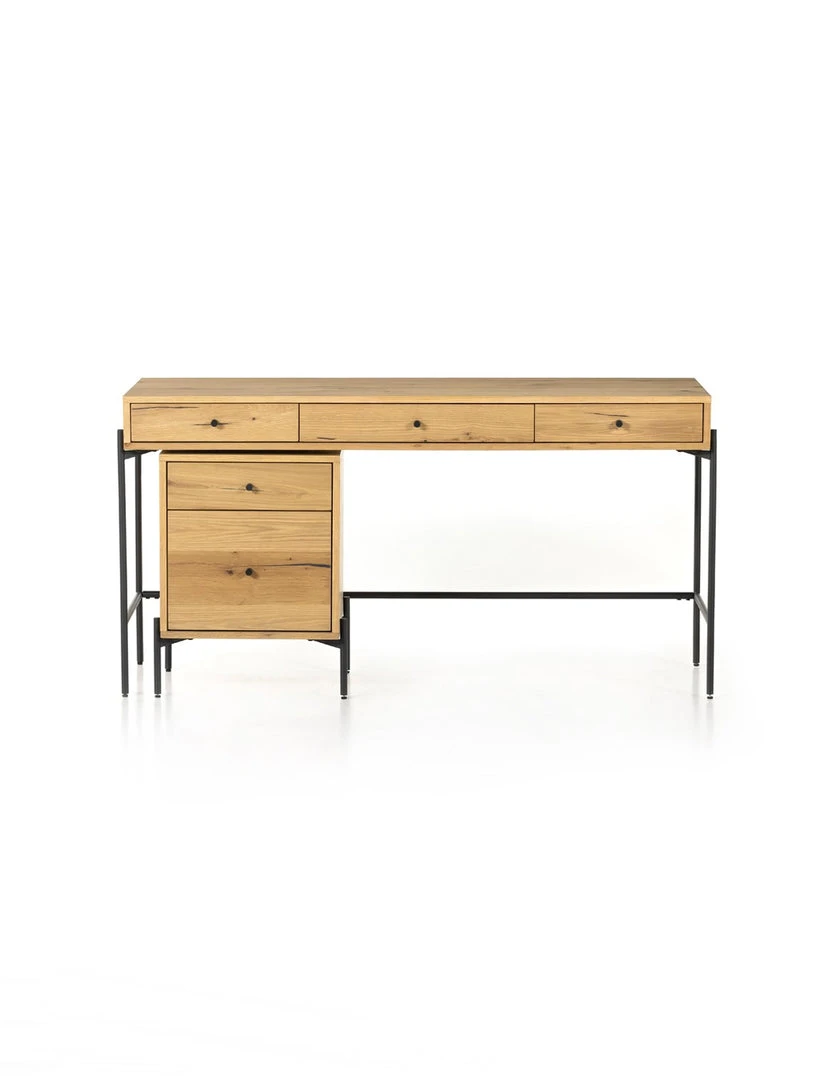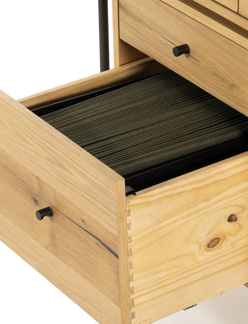Streamlined and stylish. Framed by slim iron finished in a dark gunmetal, light-finished oak and contrasting resin form a modern fashion desk, complete with a matching filing cabinet for handy storage of important documents.