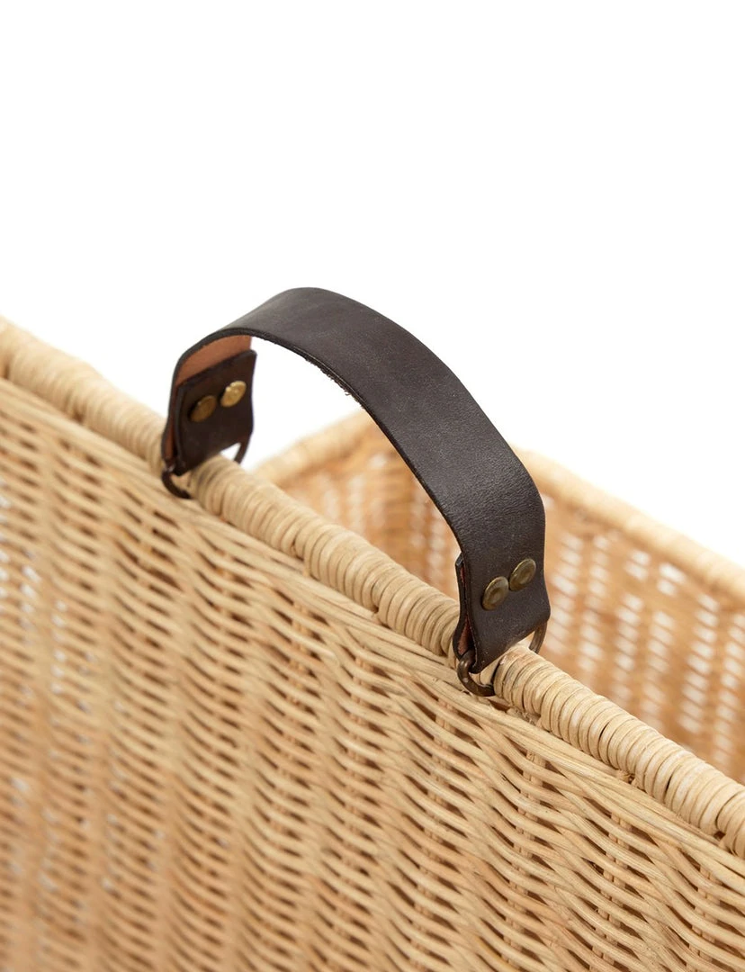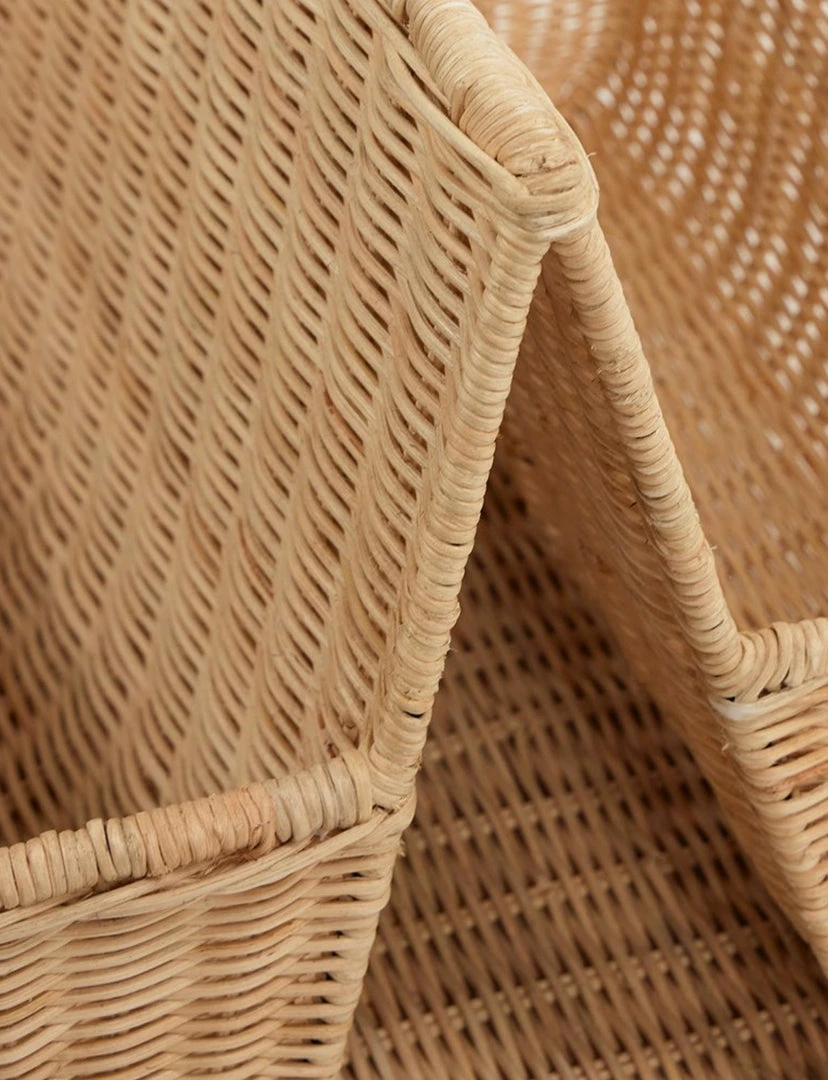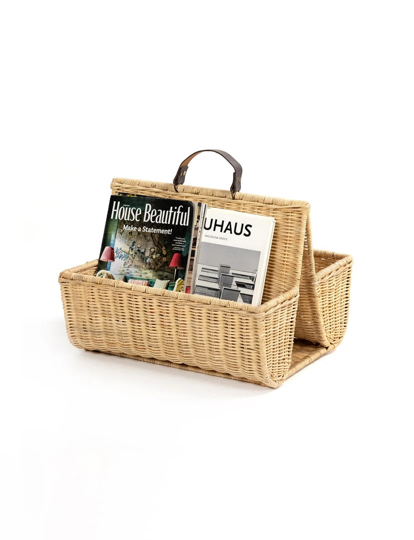 Made from natural rattan, dual sides await storage of favorite magazines and periodicals, with a leather top handle for ease.