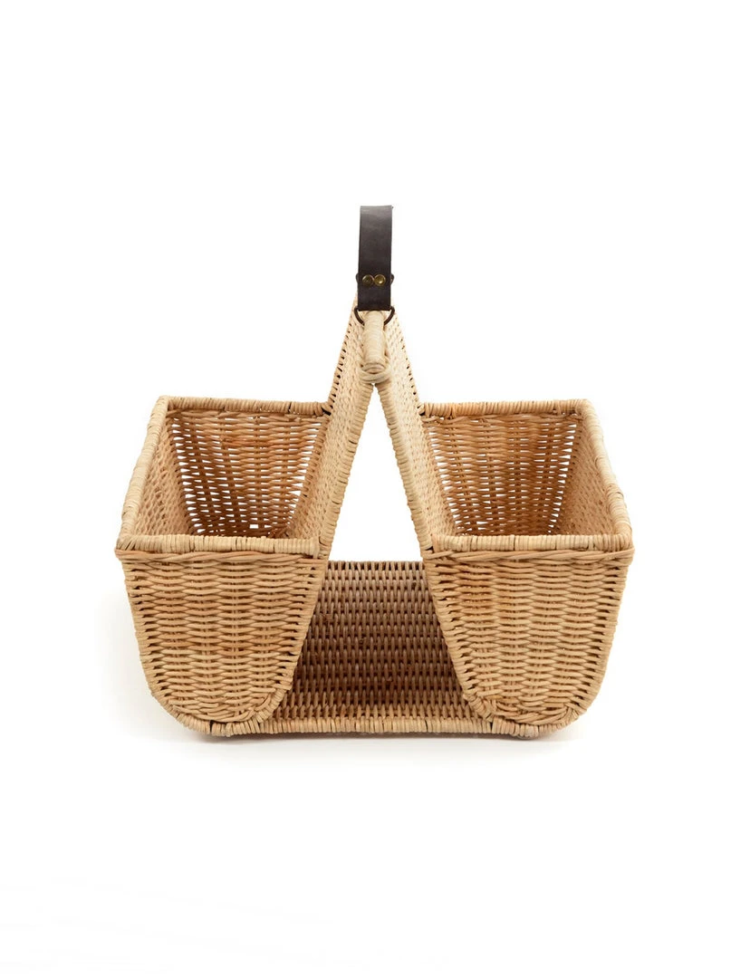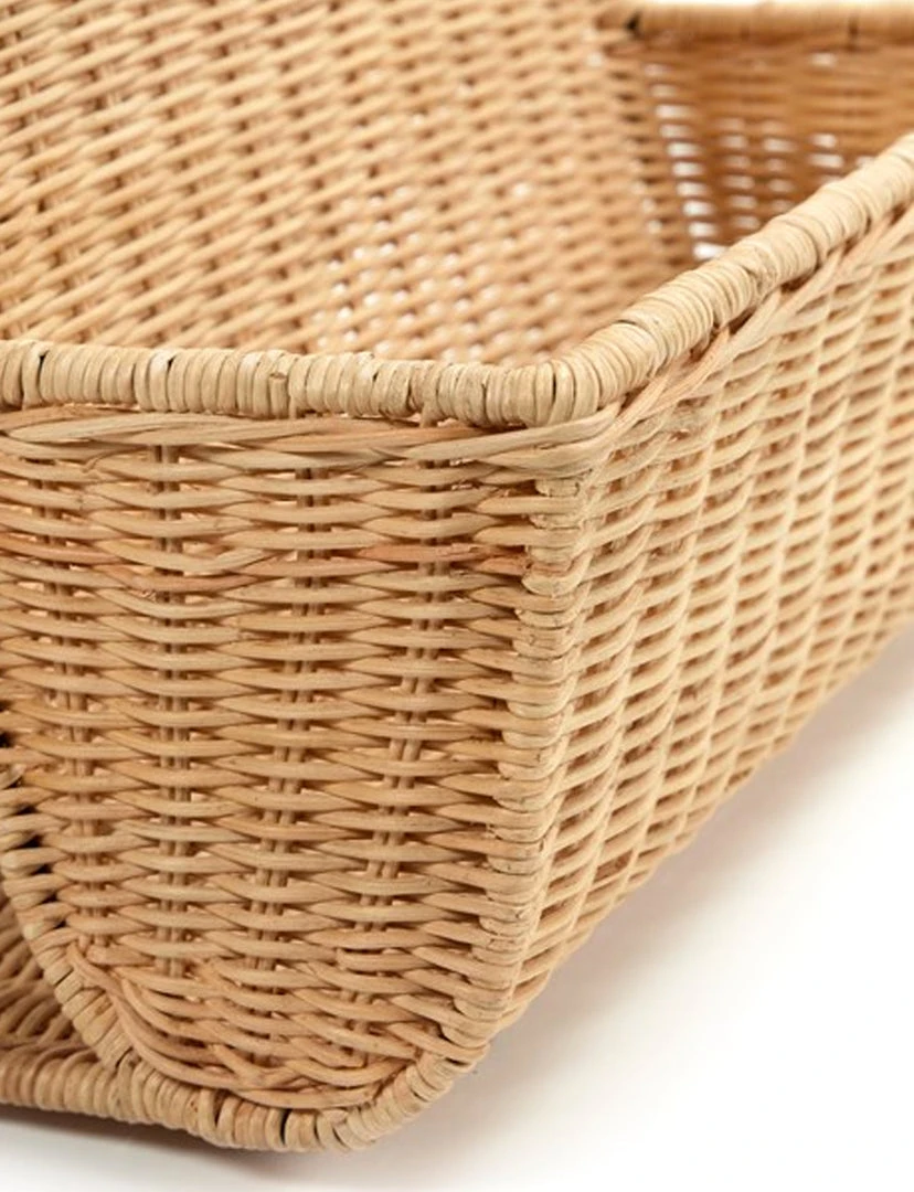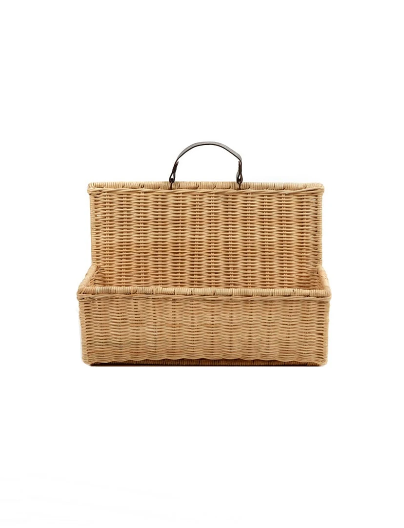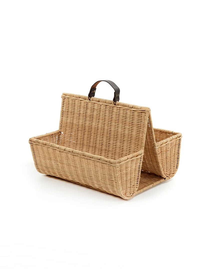 Made from natural rattan, dual sides await storage of favorite magazines and periodicals, with a leather top handle for ease.