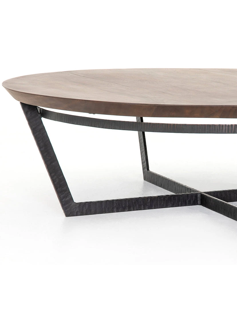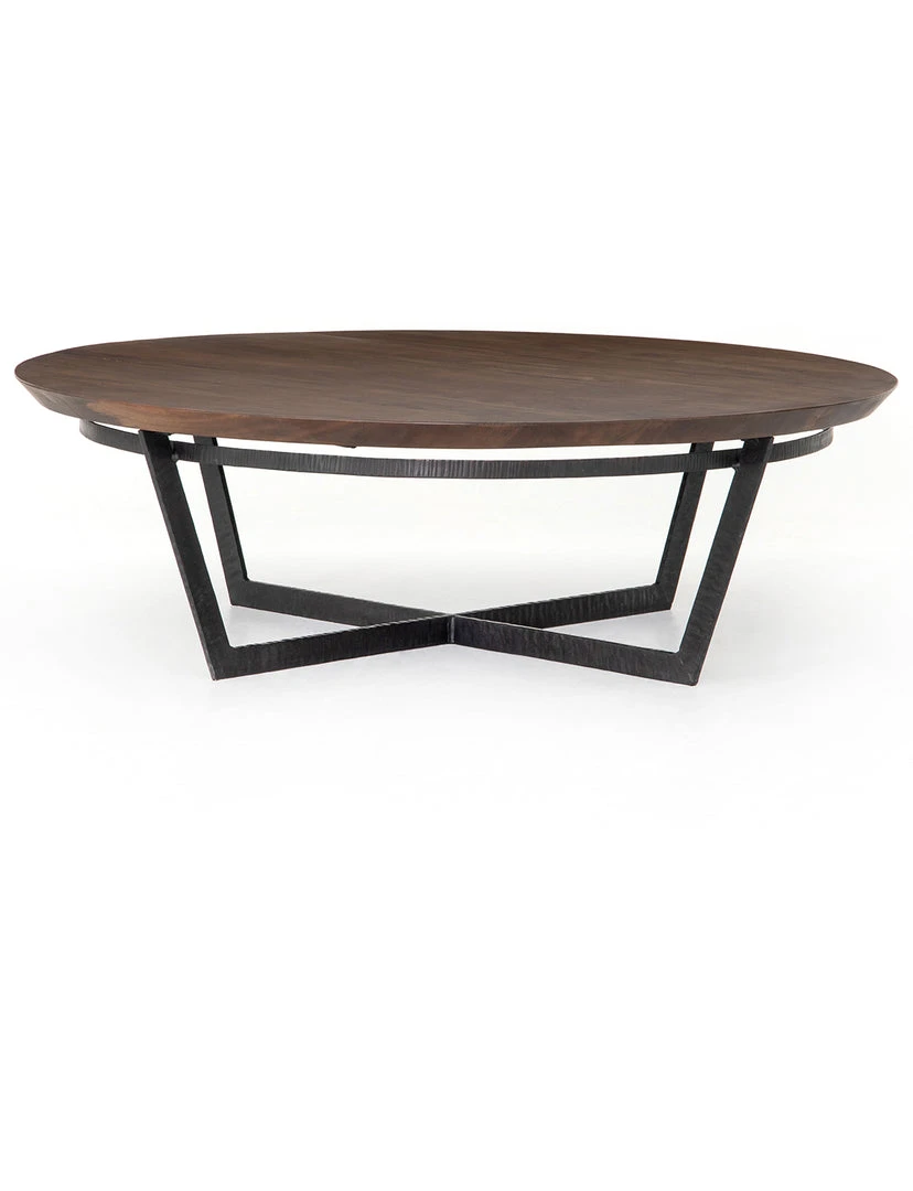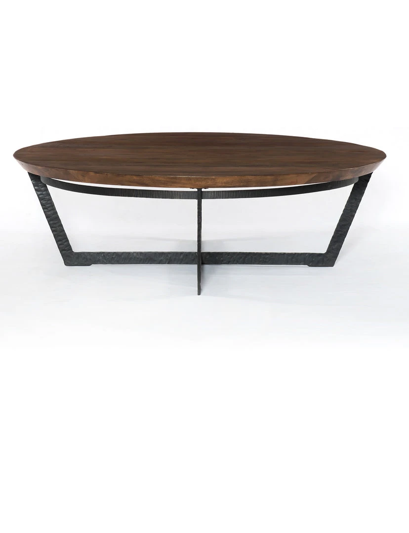 Elegant edge. A raw, rustic iron base supports a rounded brown top of reclaimed woods, which is sandblasted for textured nuance and sophisticated polish, while maintaining woods’ organic character.