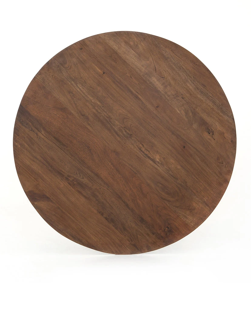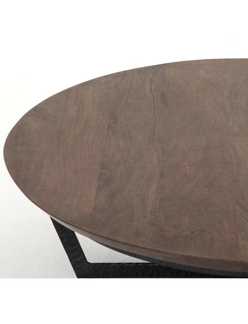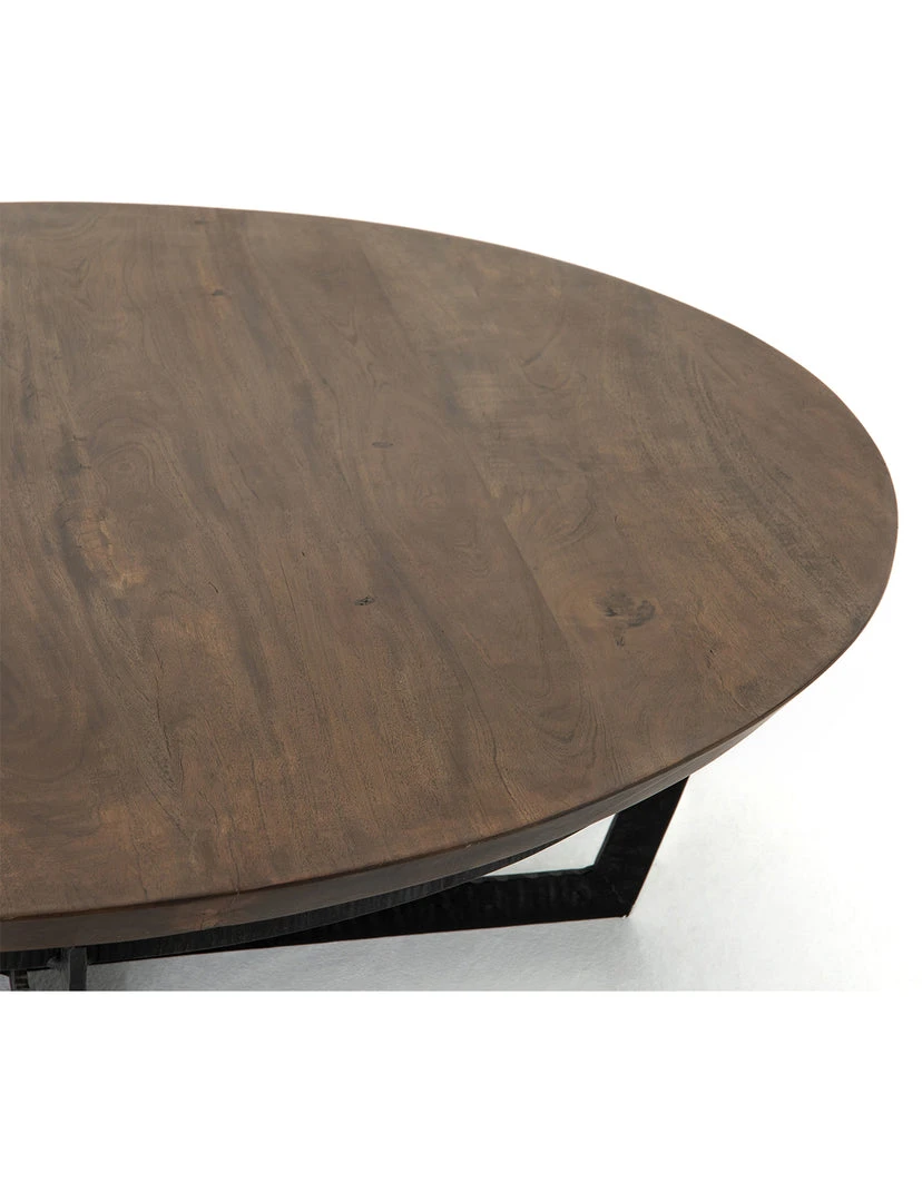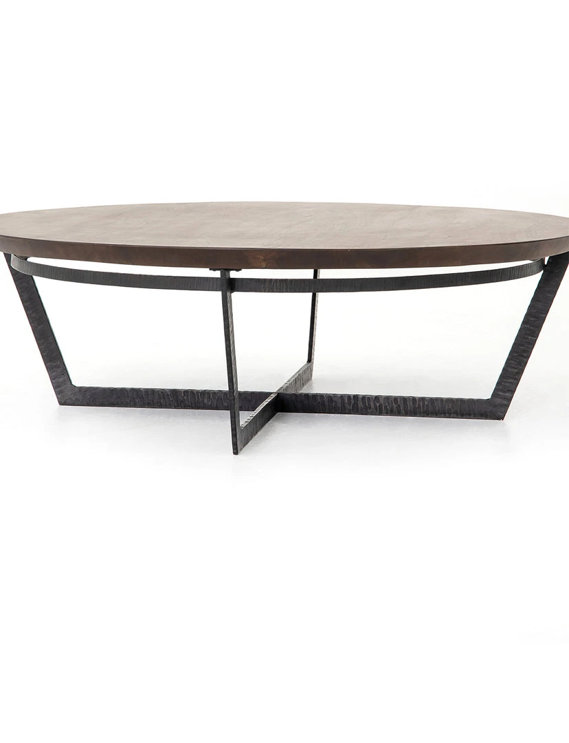 Elegant edge. A raw, rustic iron base supports a rounded brown top of reclaimed woods, which is sandblasted for textured nuance and sophisticated polish, while maintaining woods’ organic character.
