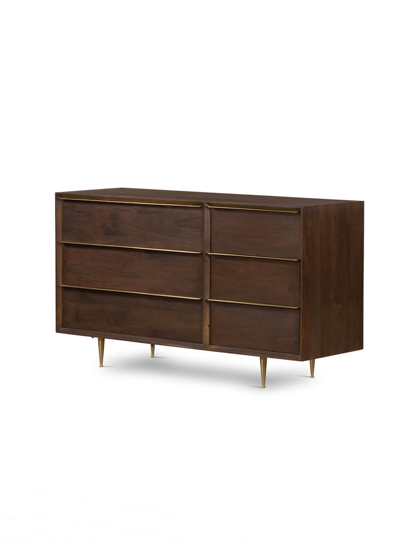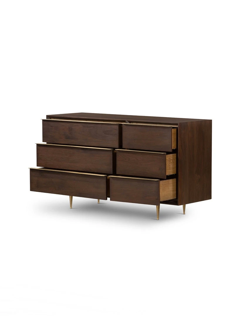 Stately and streamlined. Made from rich walnut veneer finished in a beautiful dark chocolate, six spacious drawers bring generous storage space to the bedroom, while brass-polished legs dramatically taper for a touch of midcentury-inspired elegance.