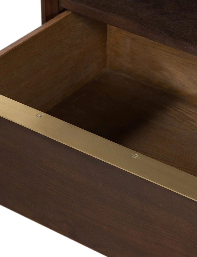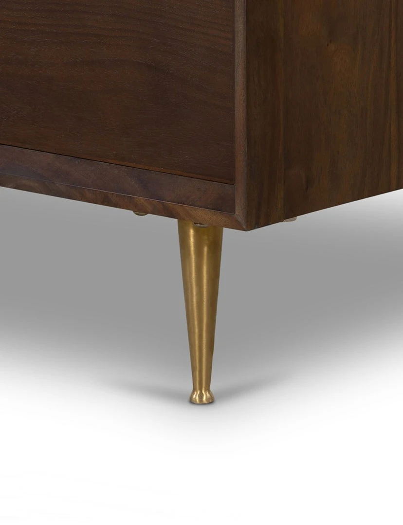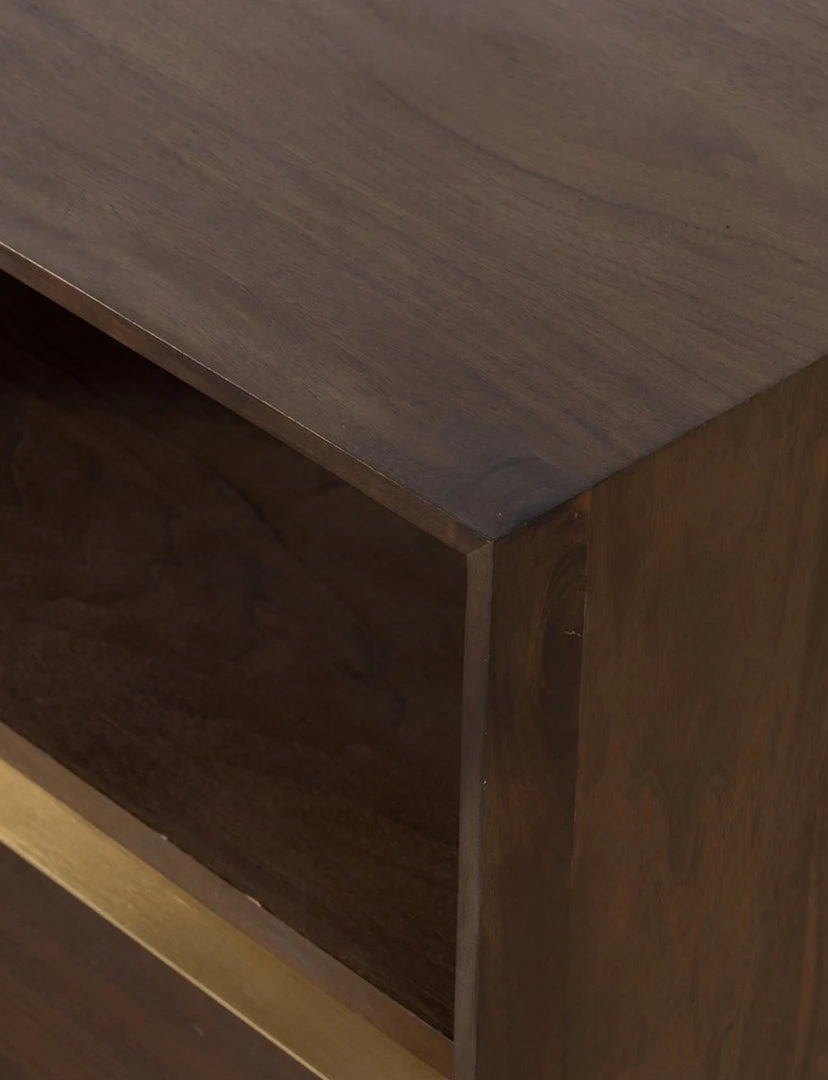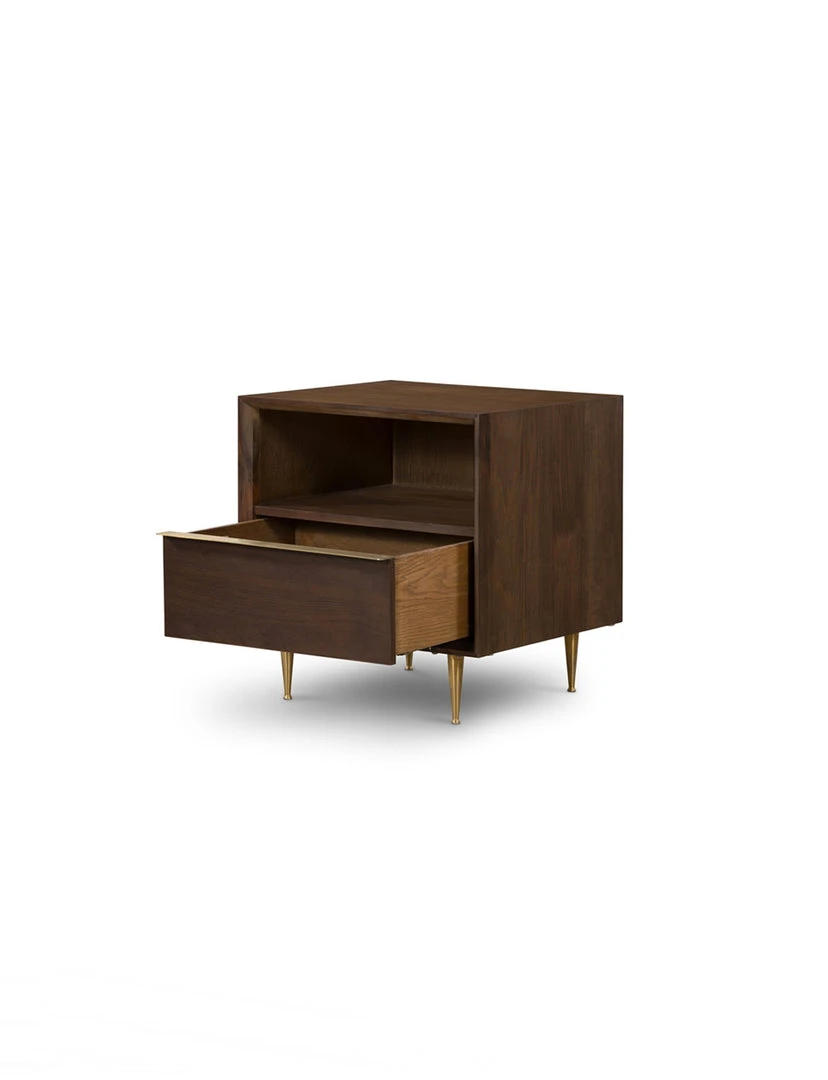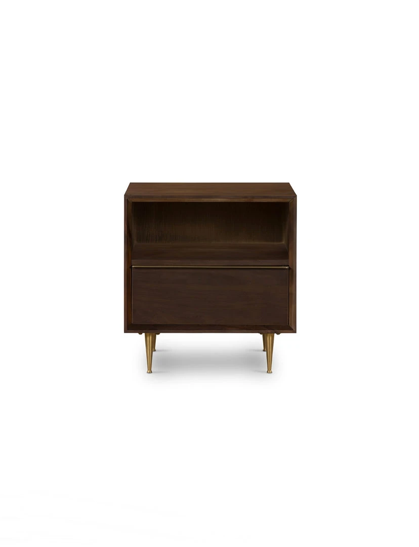 Stately and streamlined. Made from rich walnut veneer finished in a beautiful dark chocolate, a single drawer and open cubby bring extra storage space to the bedside, while brass-polished legs dramatically taper for a touch of midcentury-inspired elegance..