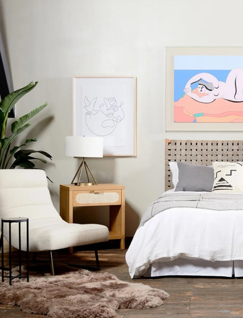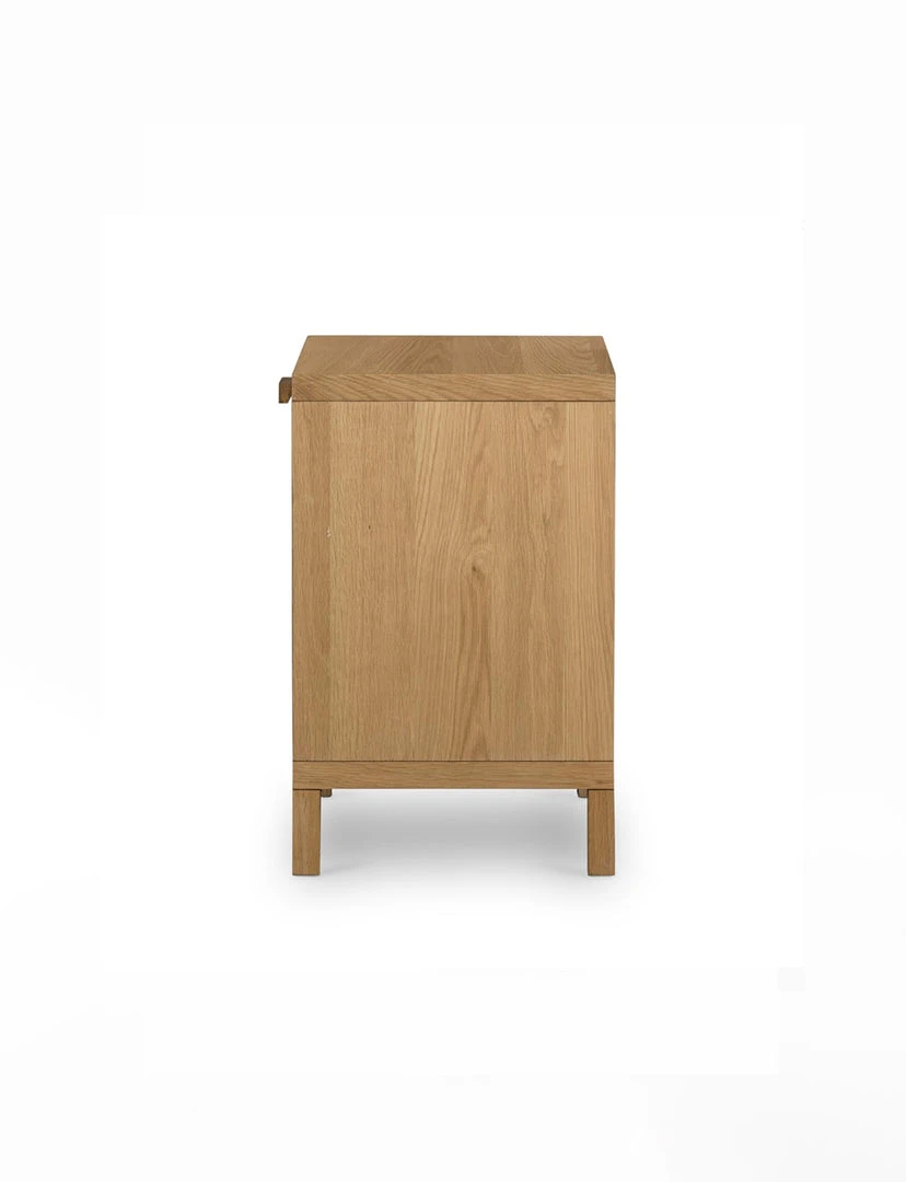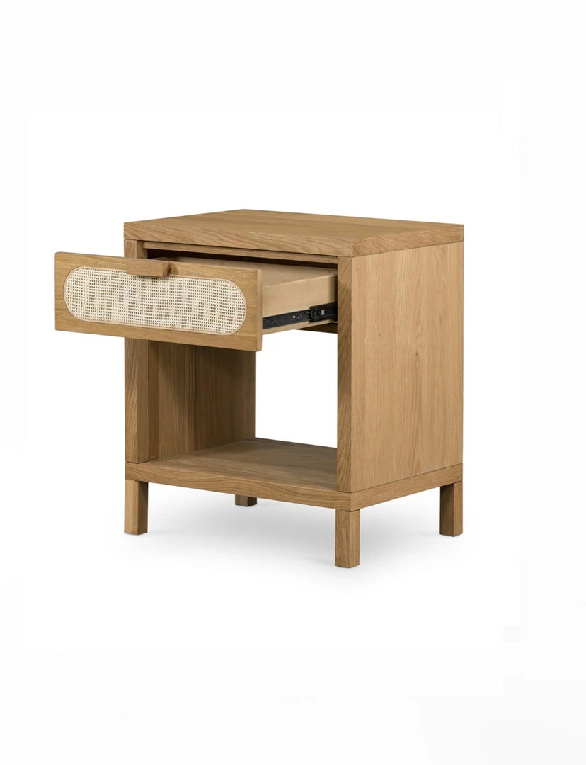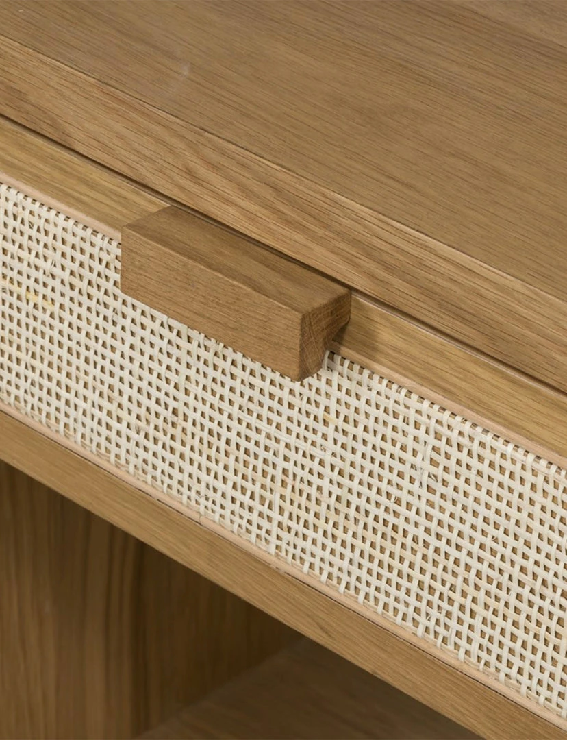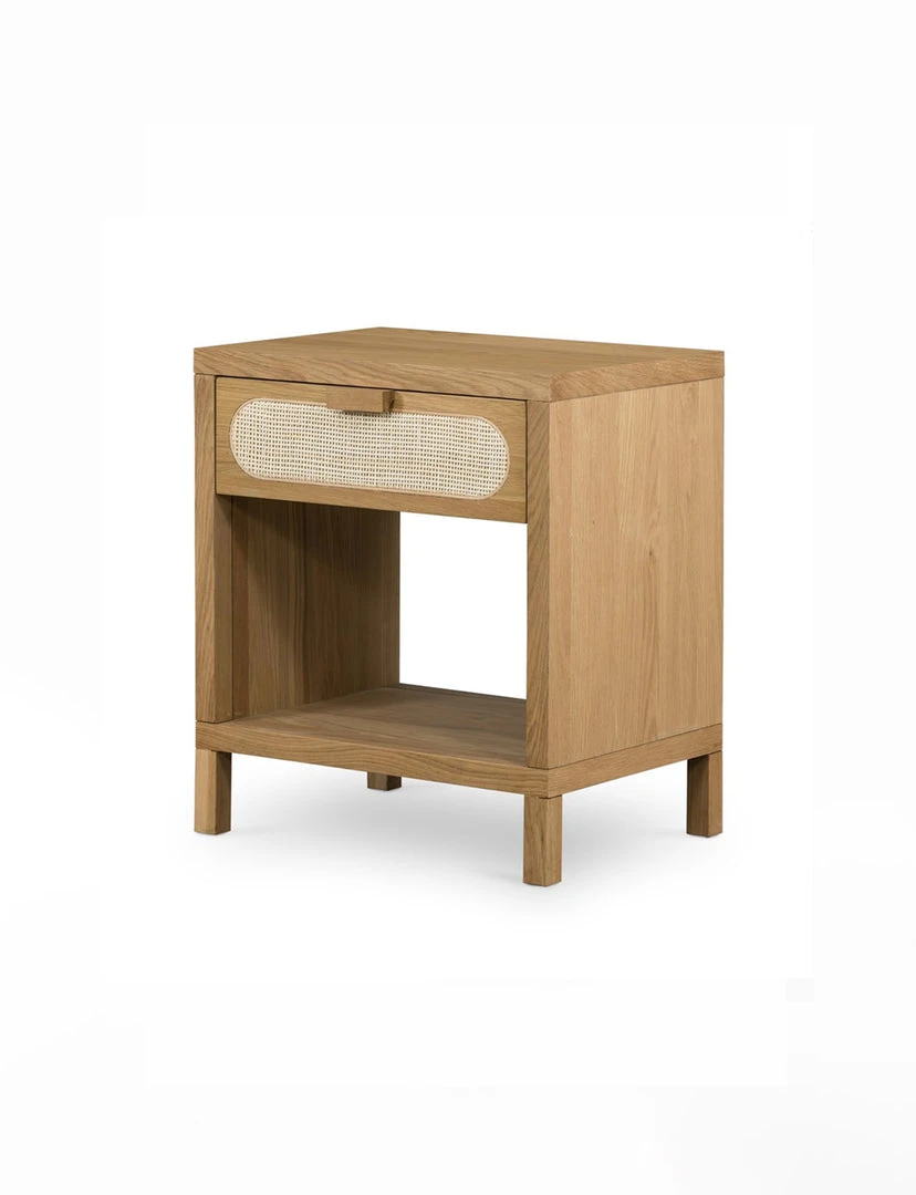 Au naturale. A nightstand of honey-finished oak features a single drawer with a pill-shaped cane front, for a soft, neutral look with lasting modernity.