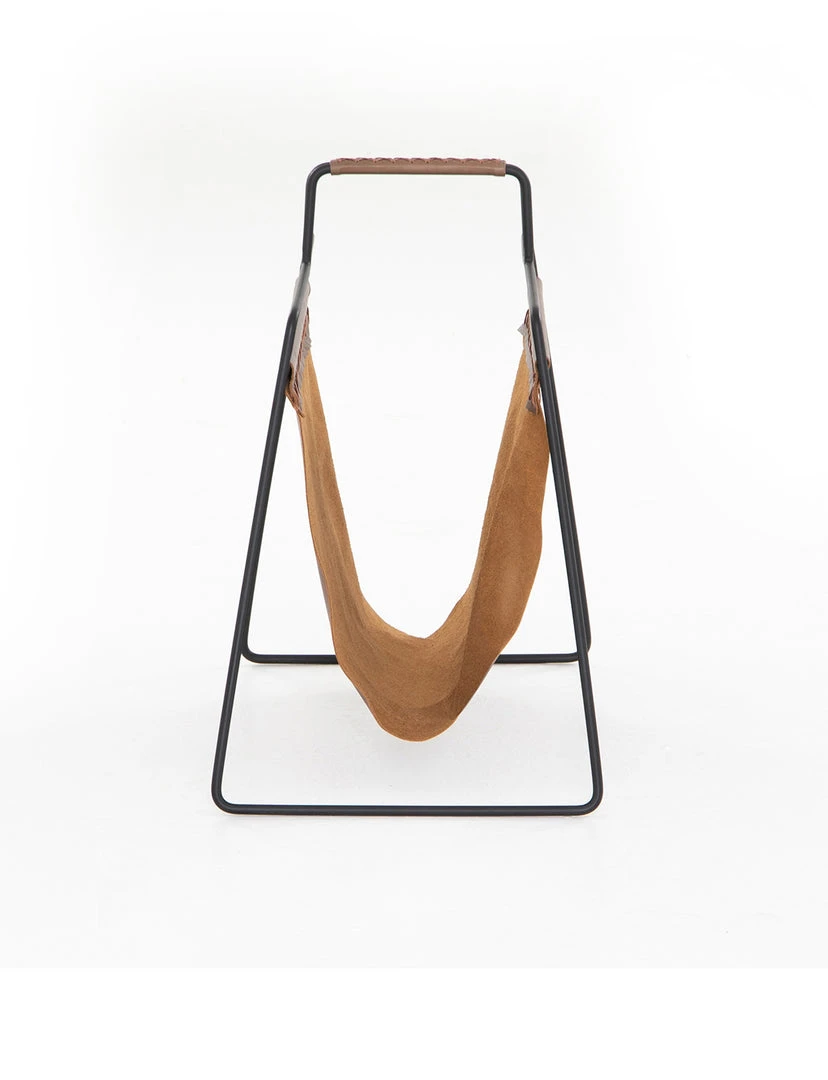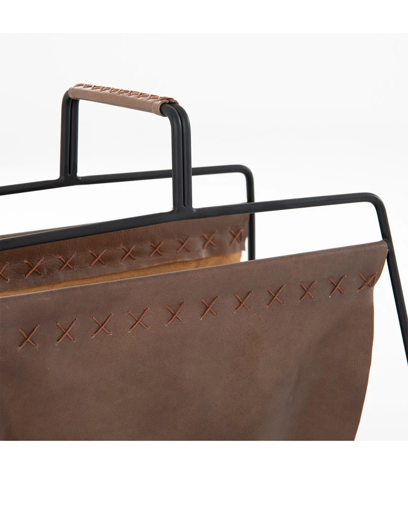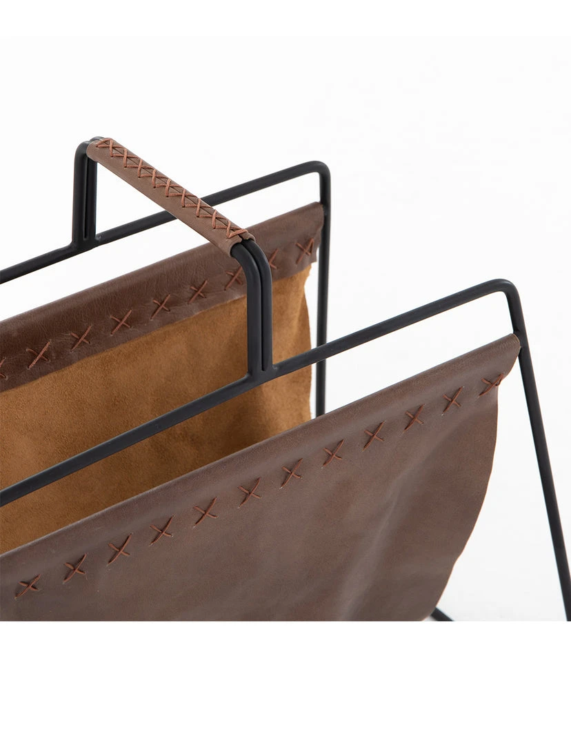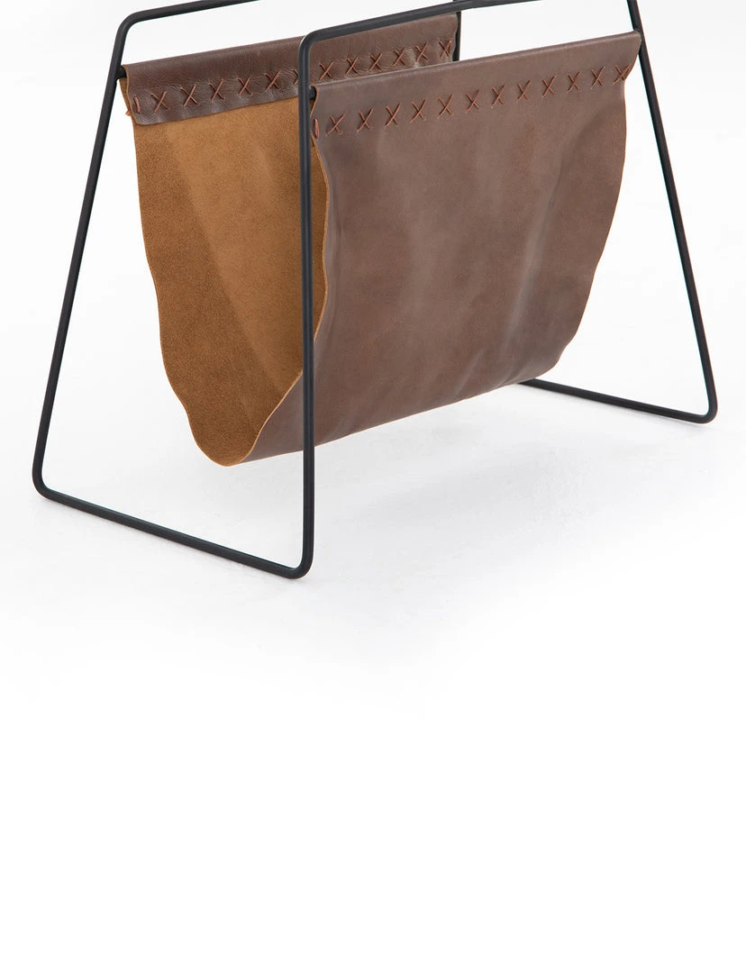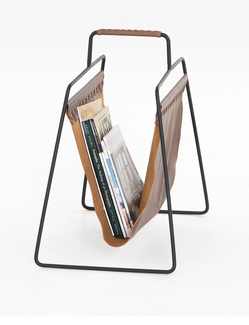 Mid-century styling meets modern detail. Brown leather slings from a slim, black metal frame to hold papers and periodicals. Top handle is leather-bound for easy transport. Cross-stitching adds an artisan touch.