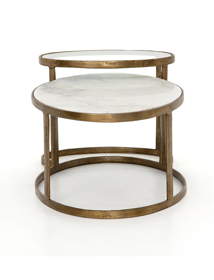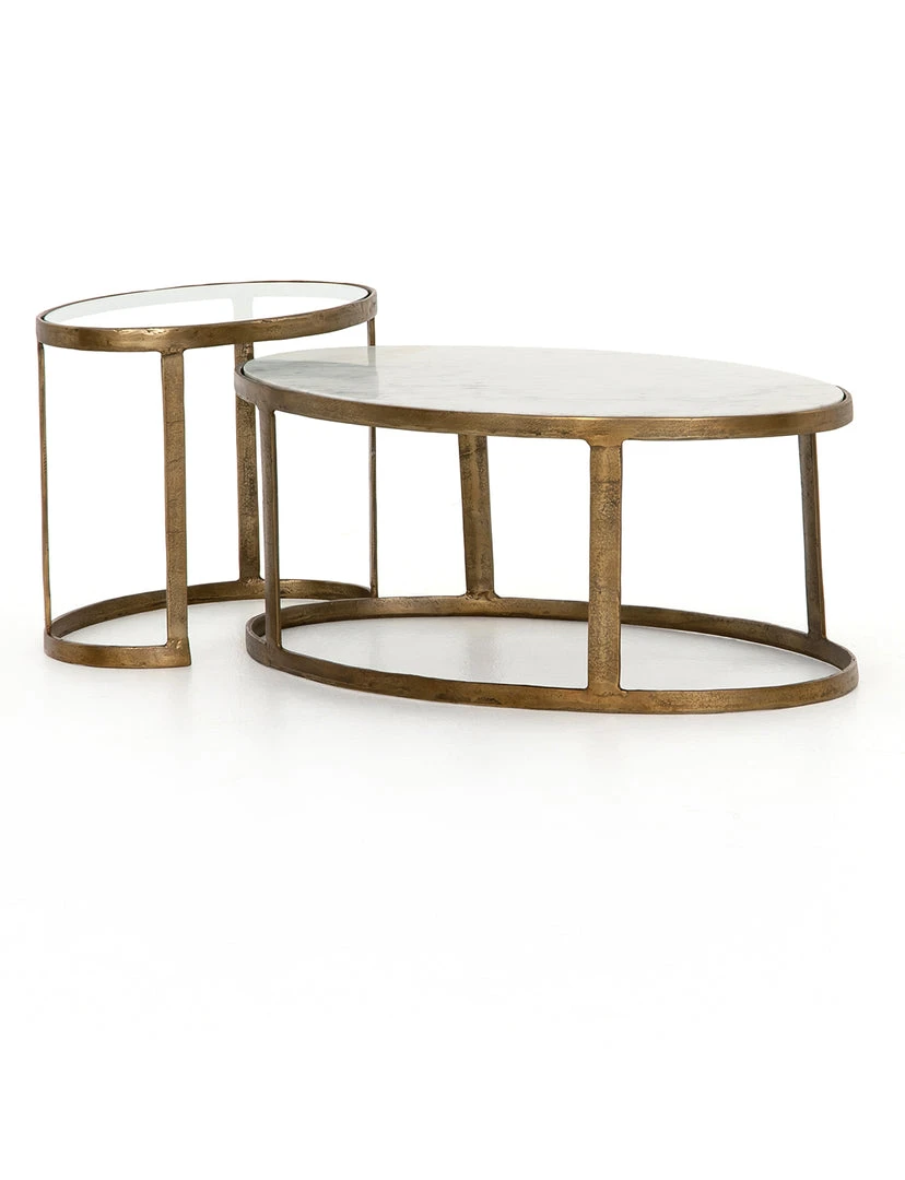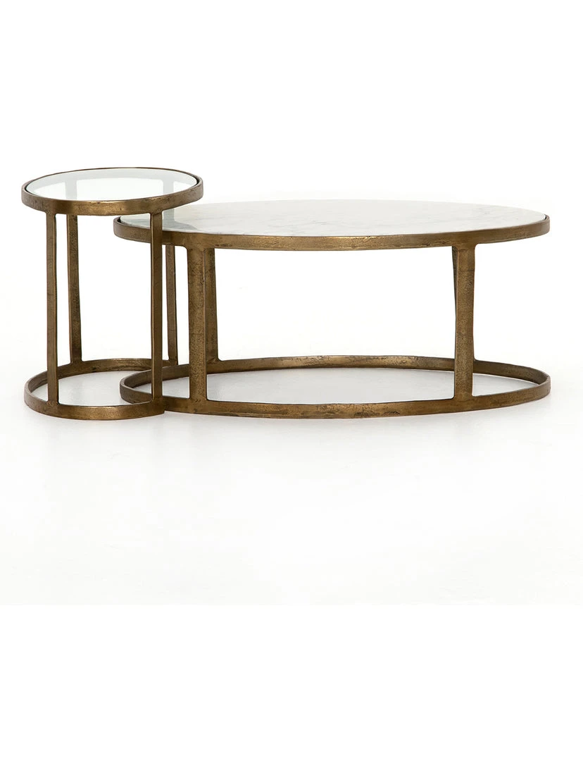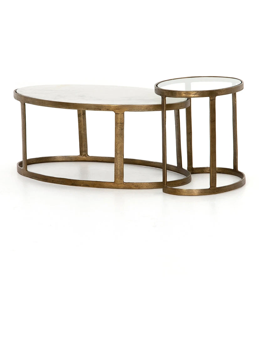 Shapely surfaces, designed to slide together or apart with ease. A raw brass finish lends a lived-in feel to aluminum framing, with one oval-shaped nester topped by polished white marble pairing with a taller, rounded table featuring tempered glass.
