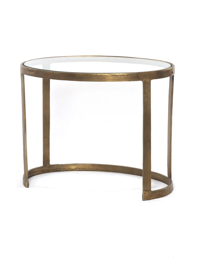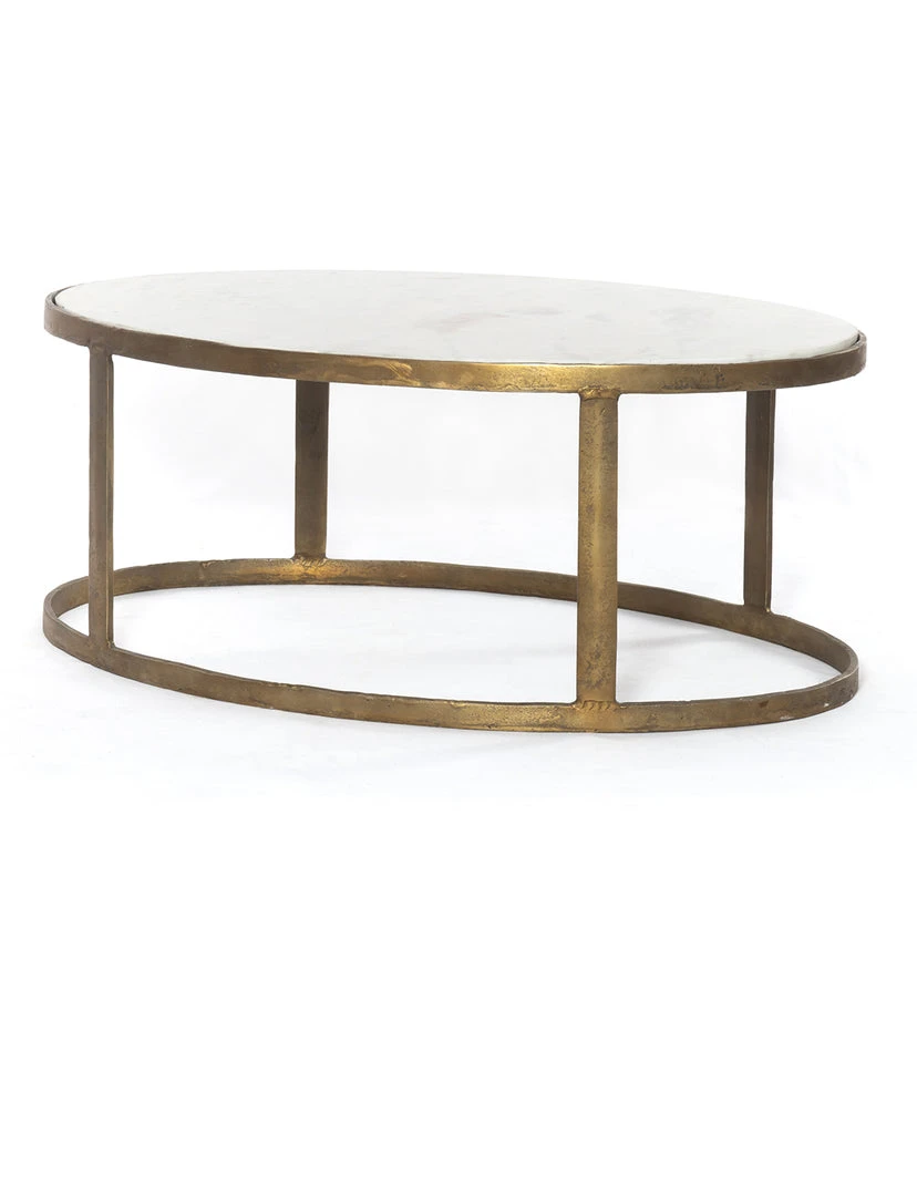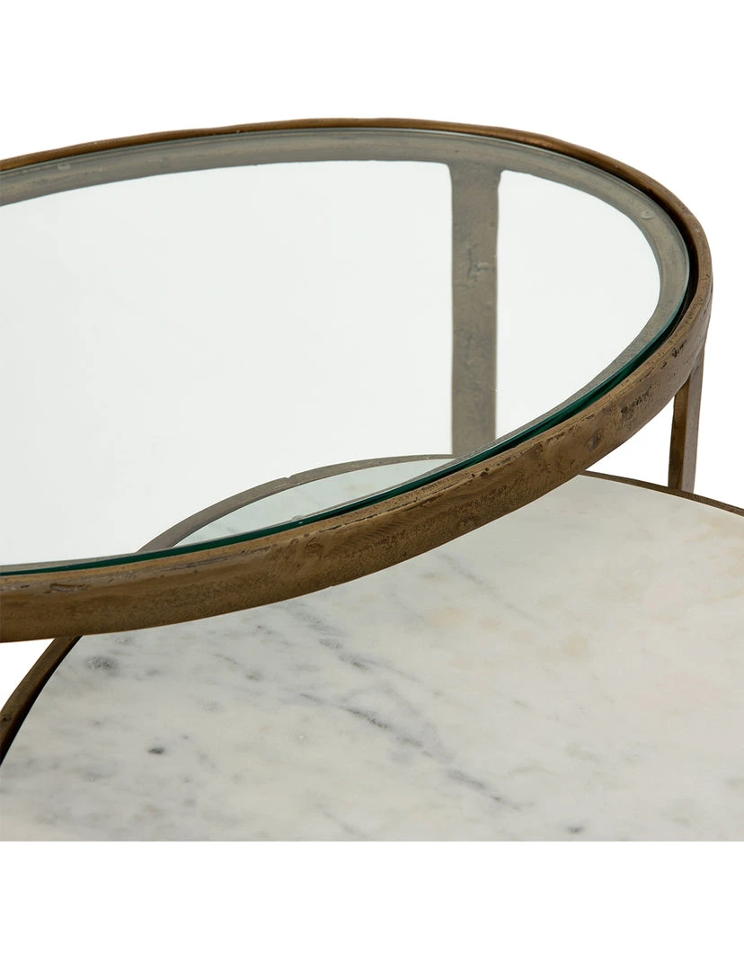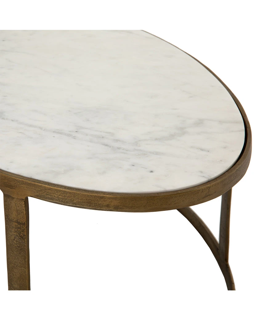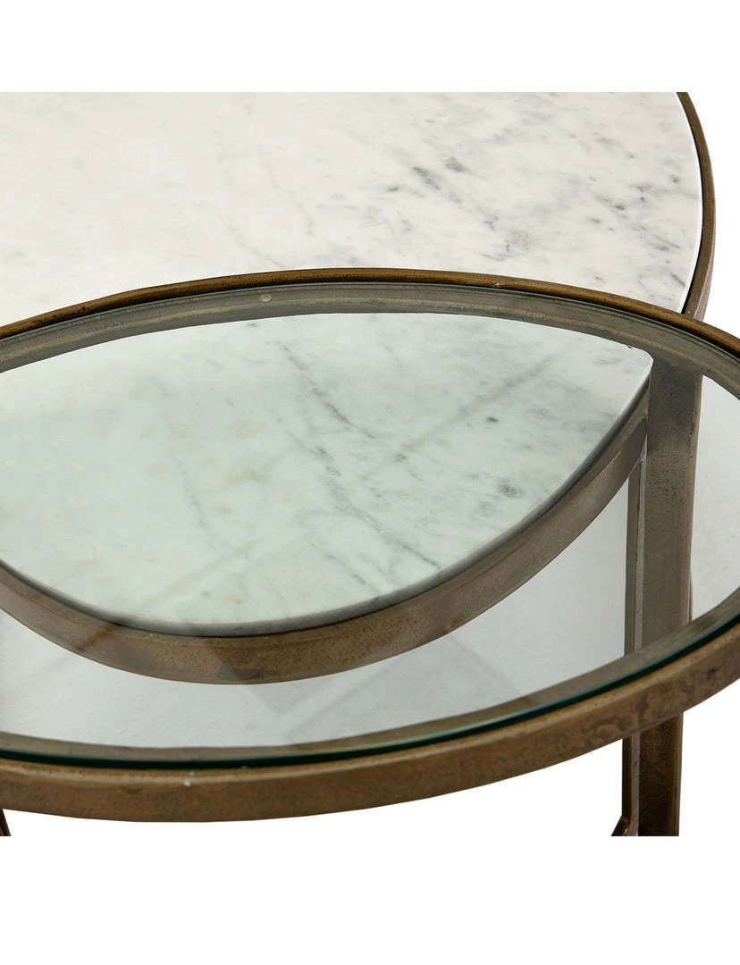 Shapely surfaces, designed to slide together or apart with ease. A raw brass finish lends a lived-in feel to aluminum framing, with one oval-shaped nester topped by polished white marble pairing with a taller, rounded table featuring tempered glass.