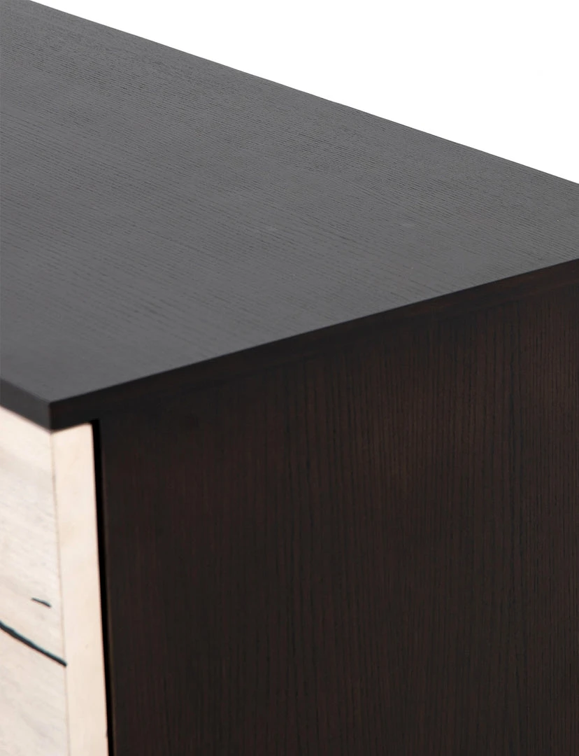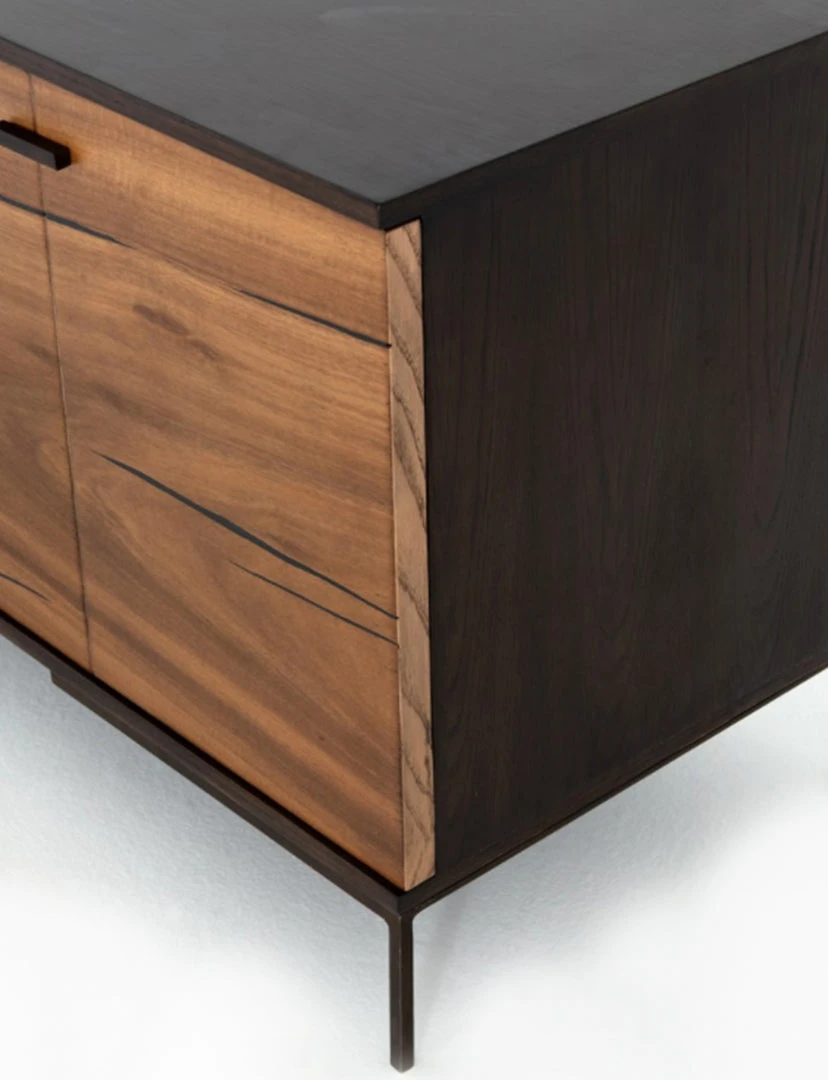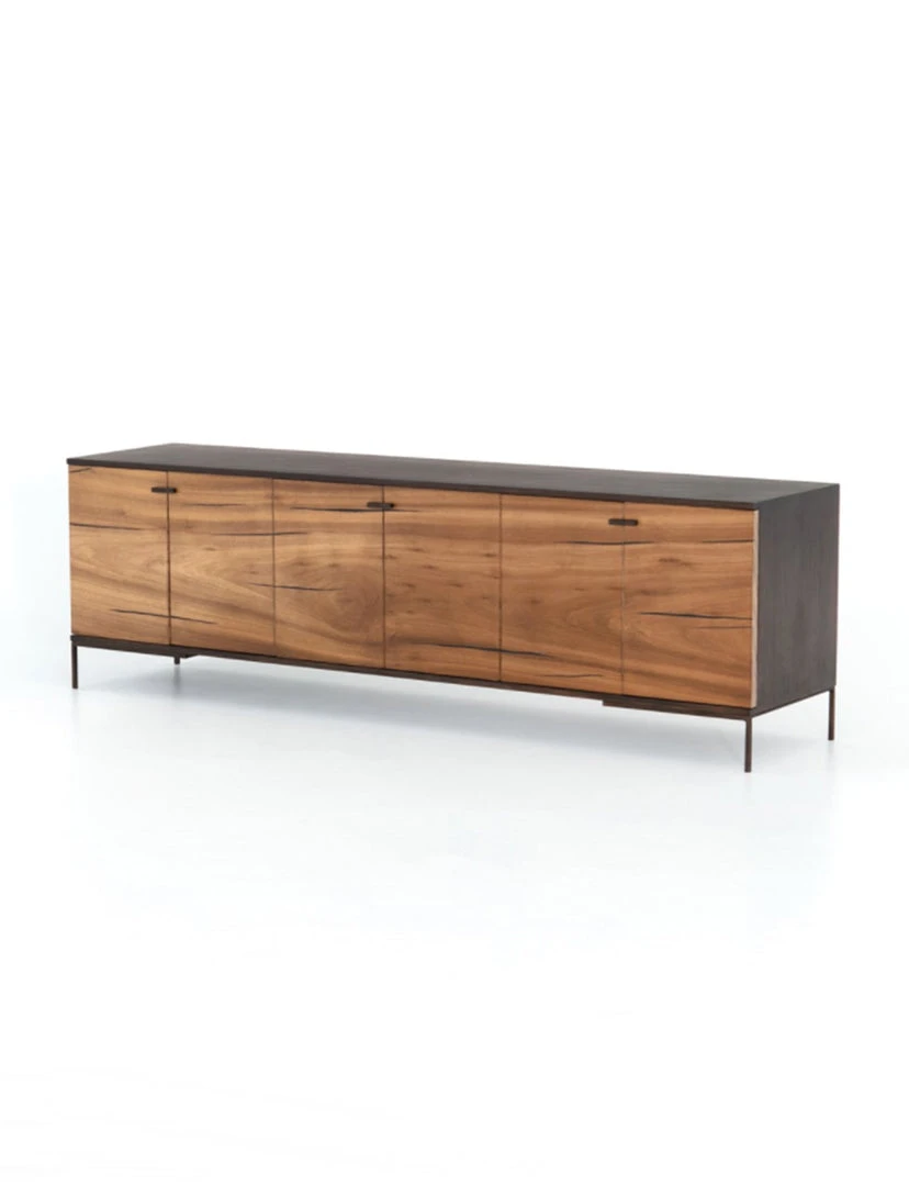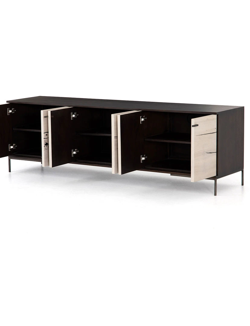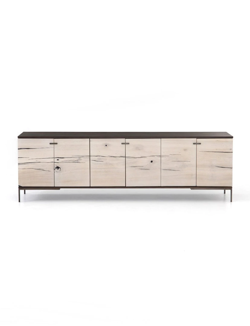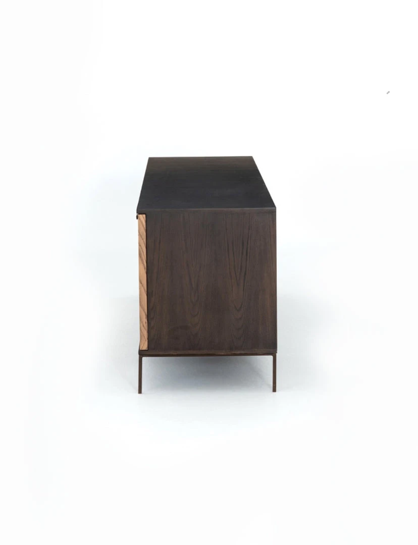 Plantation yukas deliver warmth to minimalist styling. Slender legs of bronzed iron support an ash-finished frame as resin fills yukas’ natural graining. Iron hardware adds a hint of modern edge to mid-century form. Six open-front doors offer ample storage.