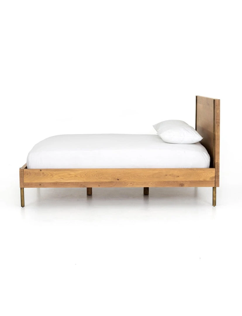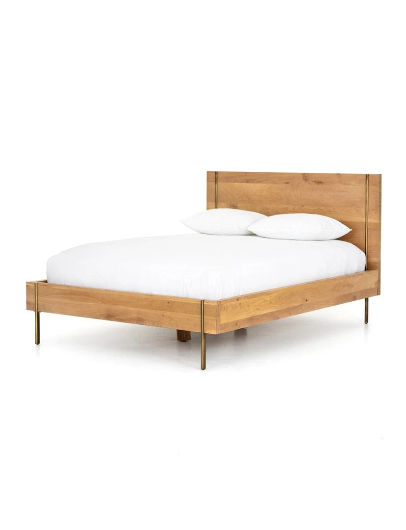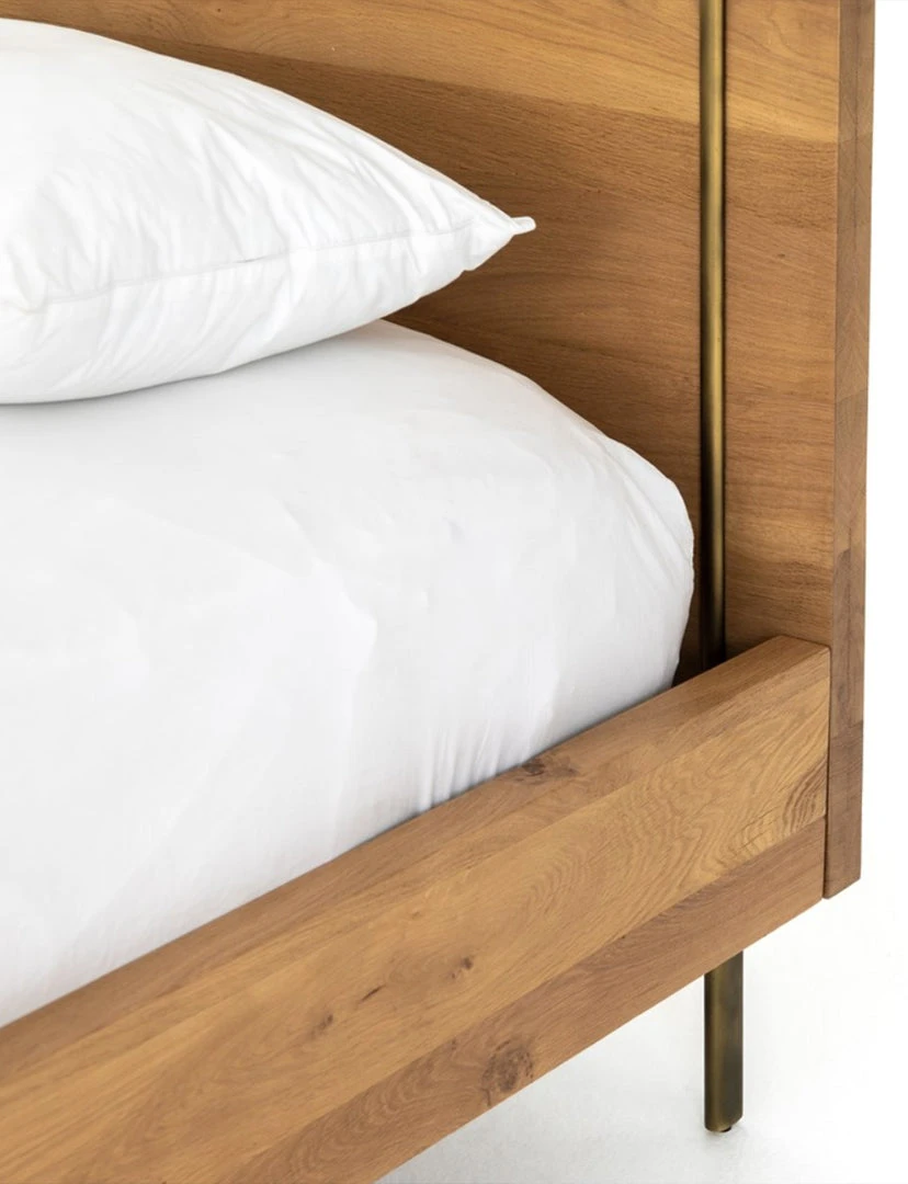Style meets simplicity in this Danish-inspired design. Solid natural oak forms clean lines, adopting linear insets of satin brass on head and footboard for added intrigue. Box spring not required.