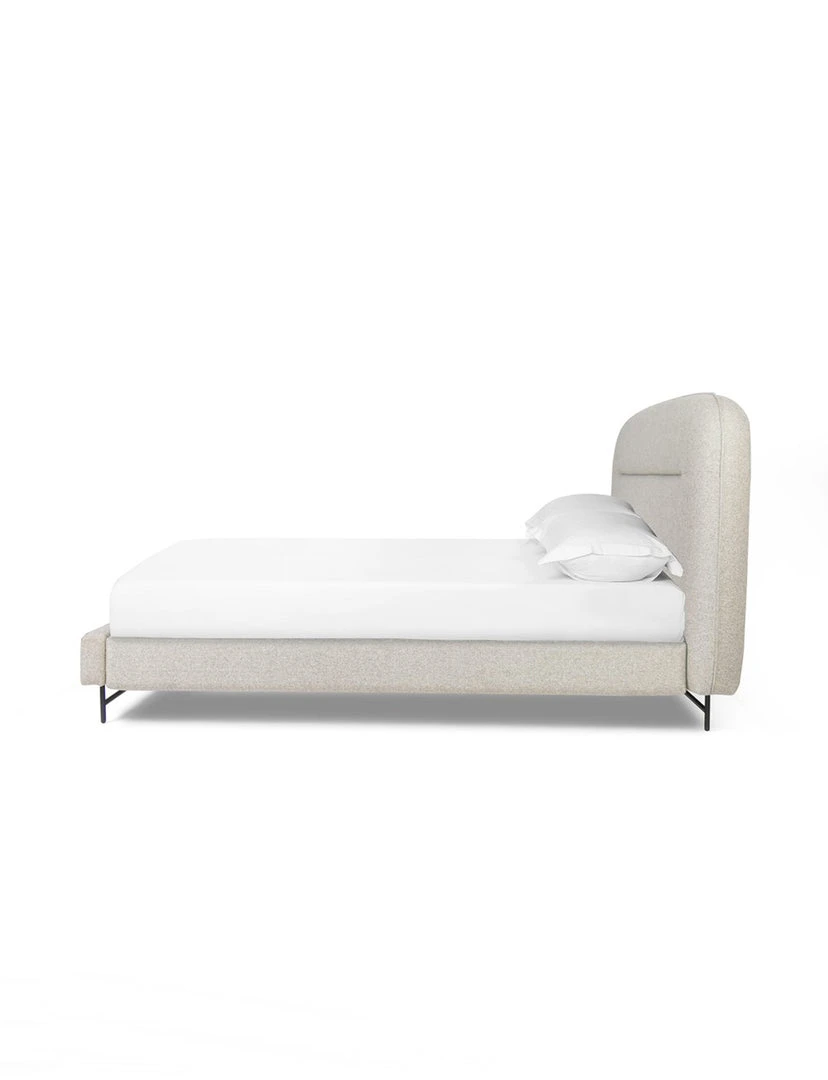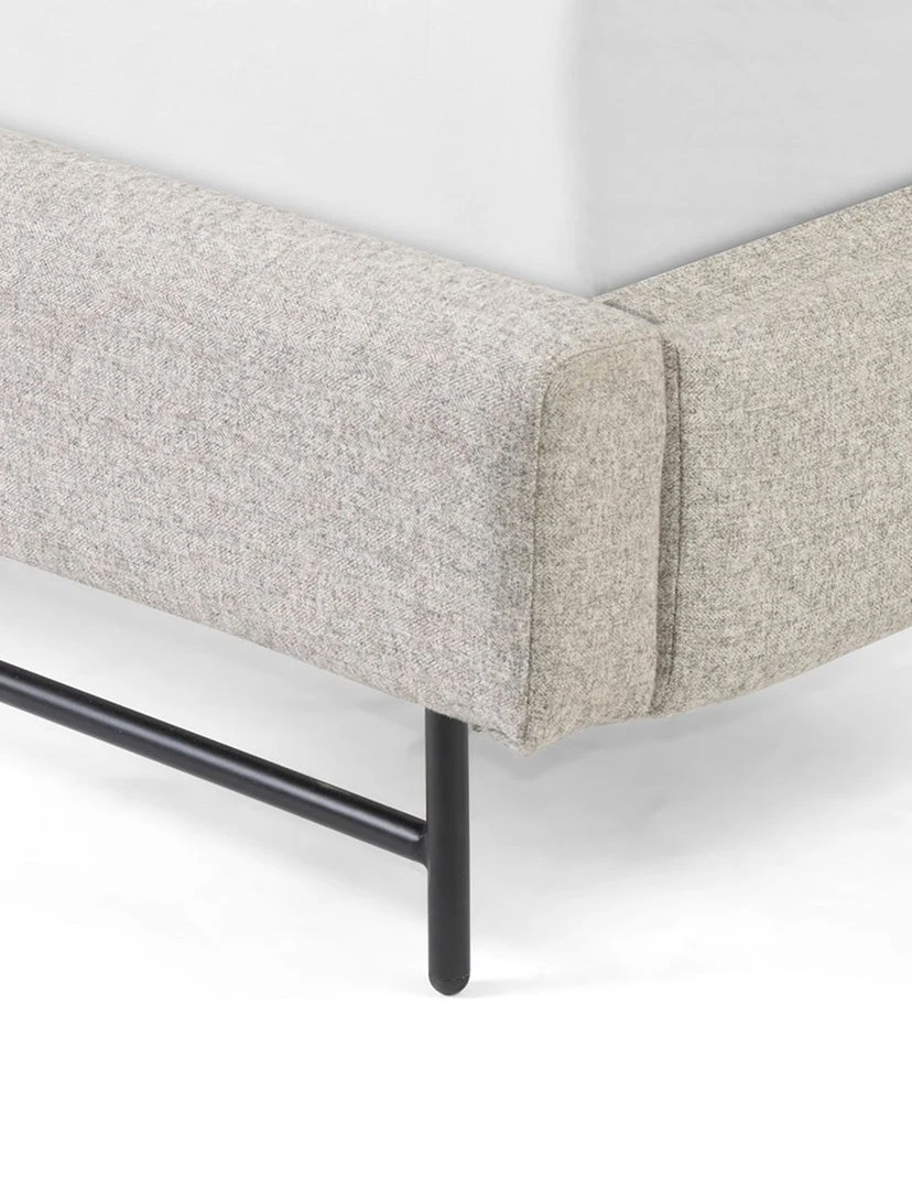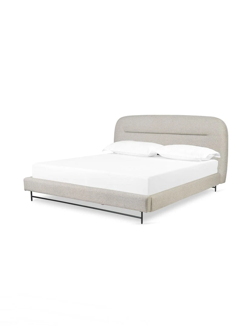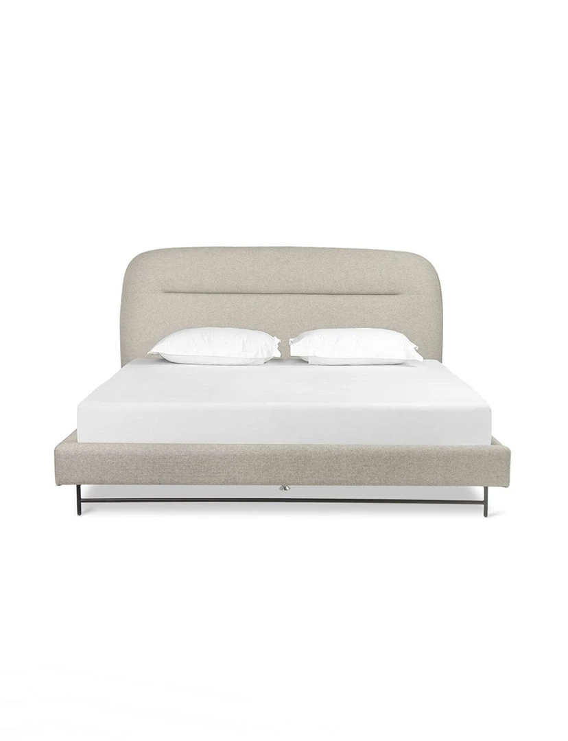 Neutral novelty. Atop an airy black-finished iron base, a shapely upholstered headboard brings a warm, modern look to bedroom styling.