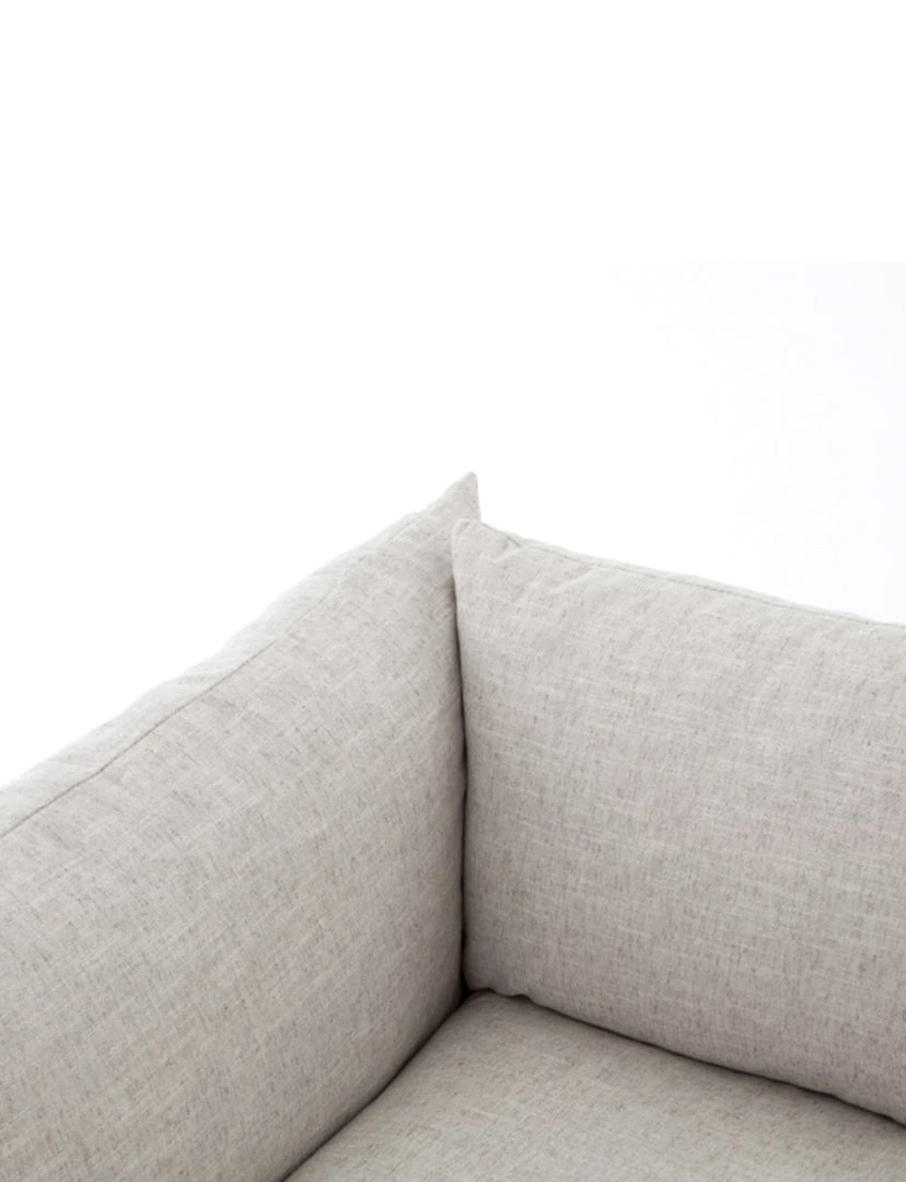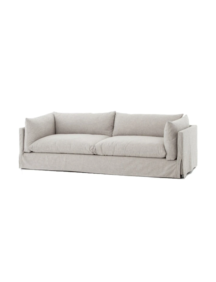 A loungey, slipcovered sofa made for modern living. Shelter arms and pillow-inspired cushions are covered in comfortably durable stain-resistant fabric.