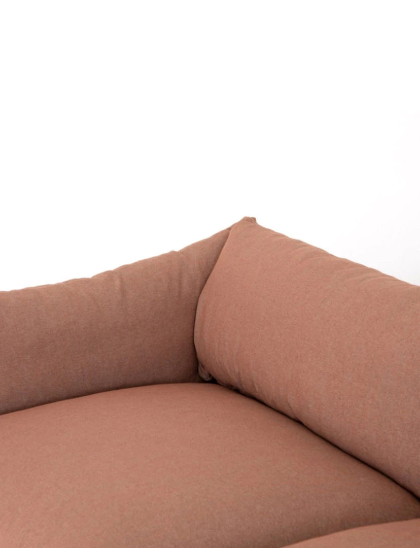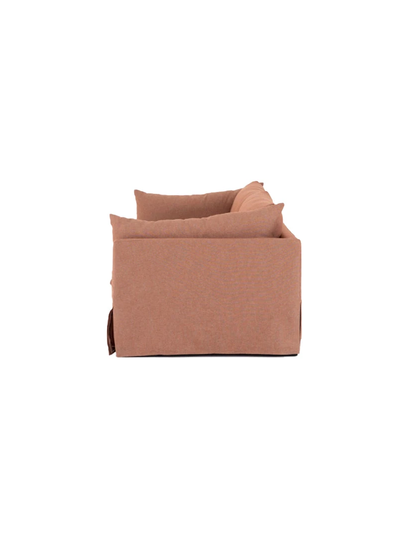 A loungey, slipcovered sofa made for modern living. Shelter arms and pillow-inspired cushions are covered in comfortably durable fabric in a warm rust hue.