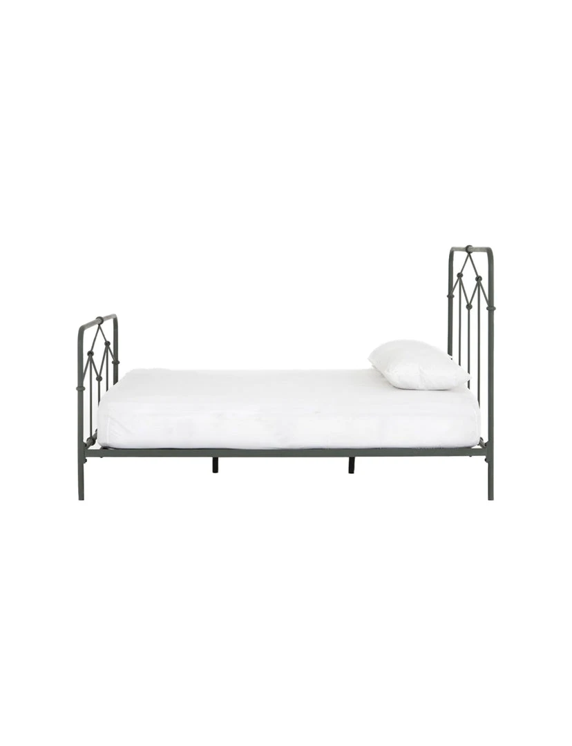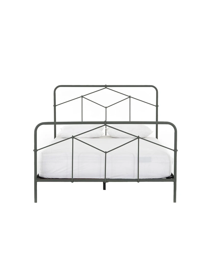 Modern geometric patterns update a design inspired by vintage European hospital beds. Finished in a sage green, simple iron tubing looks airy and feels substantial. Low-profile box spring recommended.