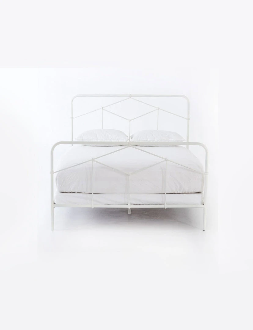 Modern geometric patterns update a design inspired by vintage European hospital beds. Simple white iron tubing looks airy and feels substantial. Low-profile box spring recommended.