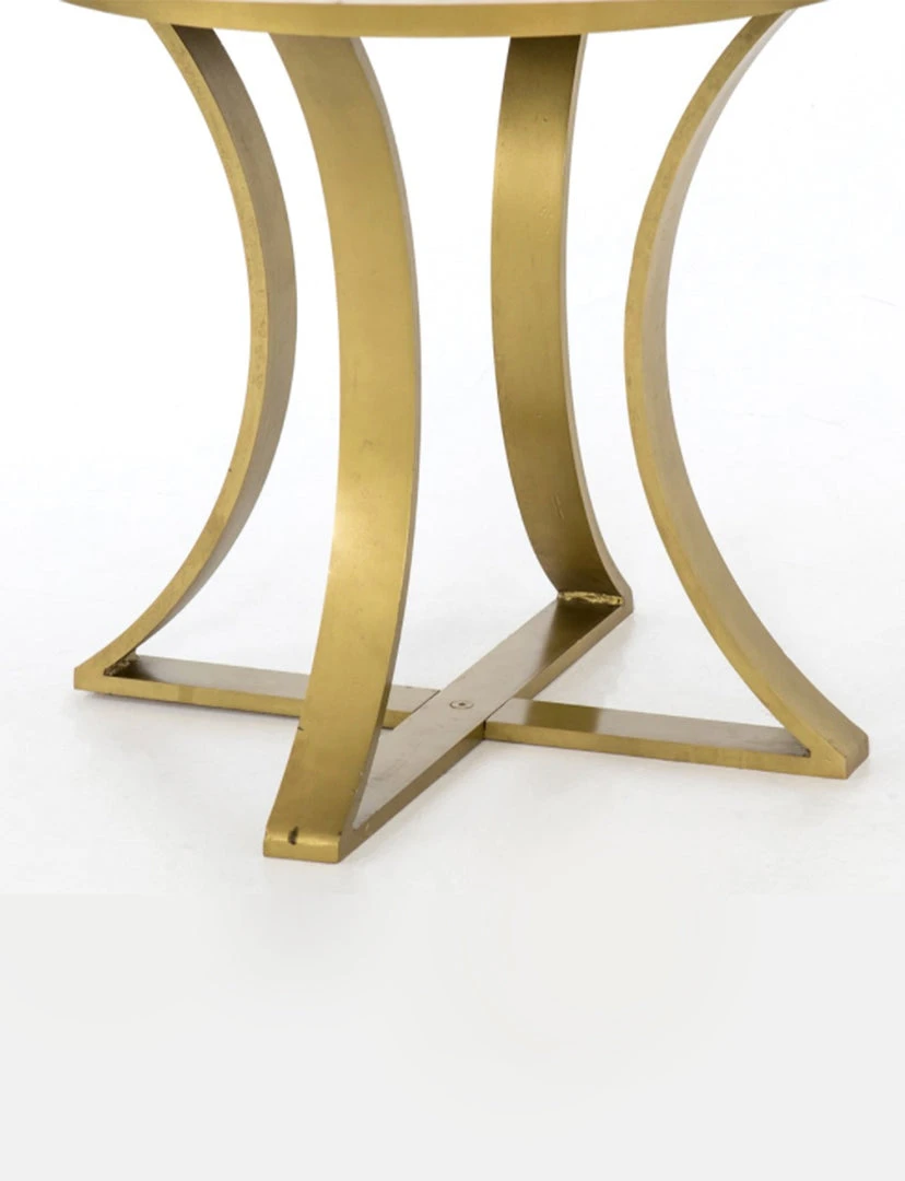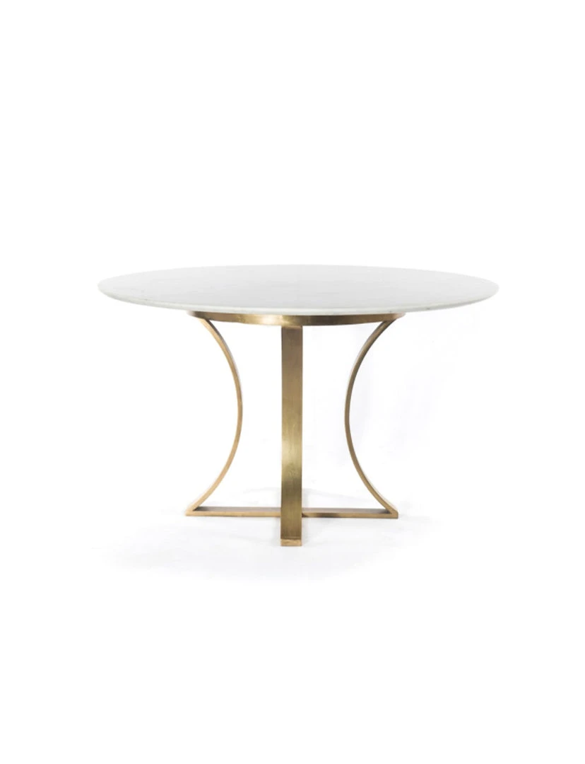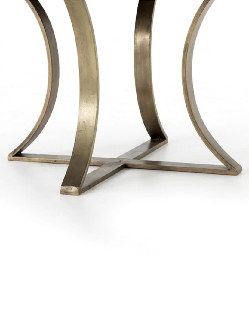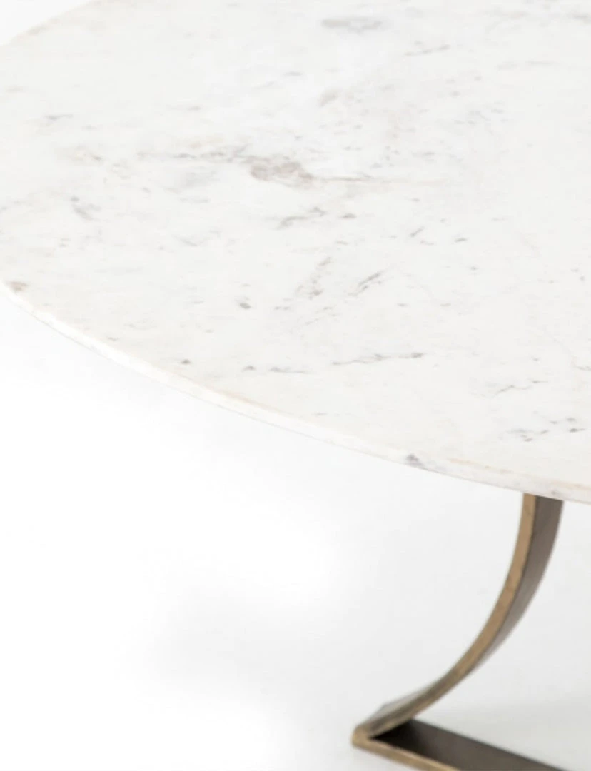 Sophisticated materials take a cue from modern geometry. Antique brass iron forms uniquely-curved angles to balance a contrasting polished white marble top. A refined spin on trend-forward design.
