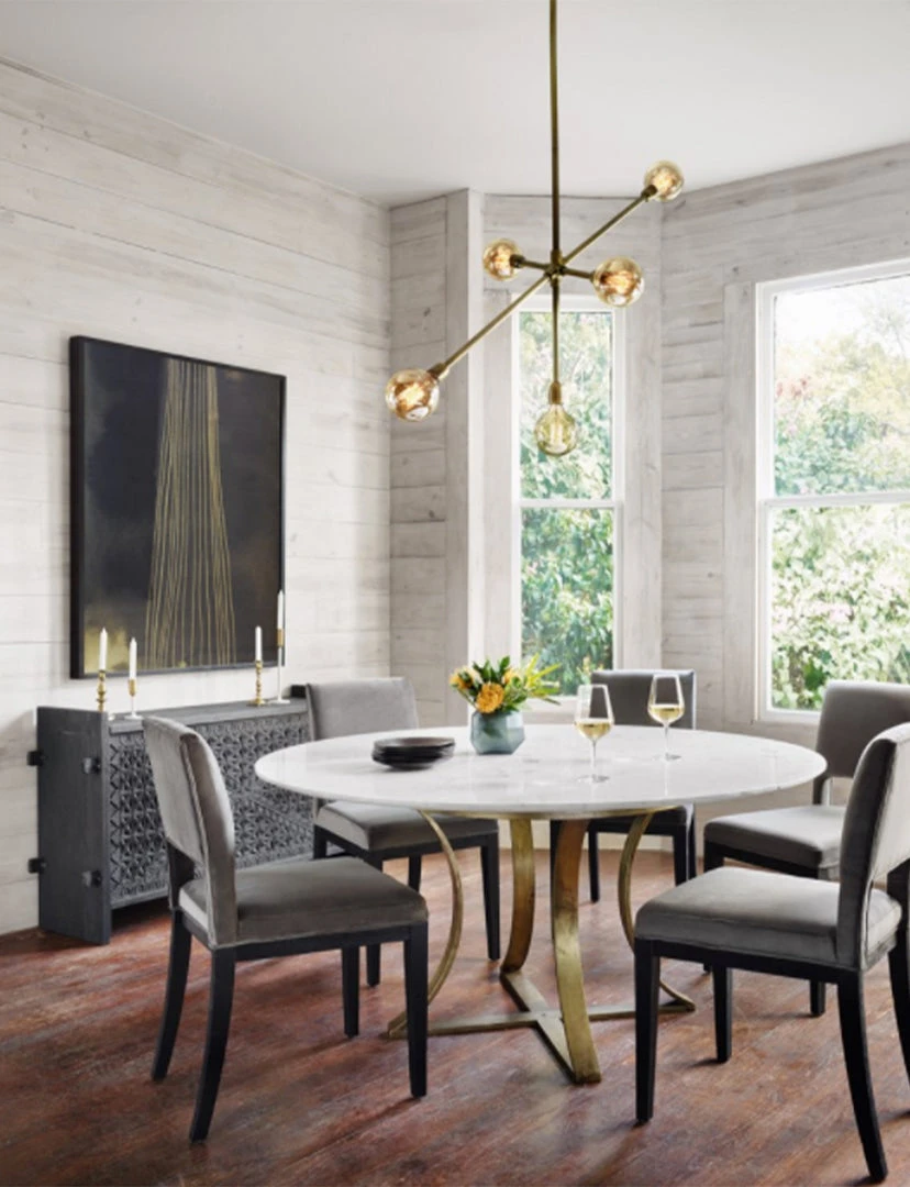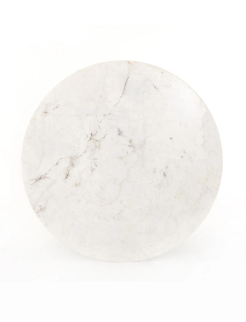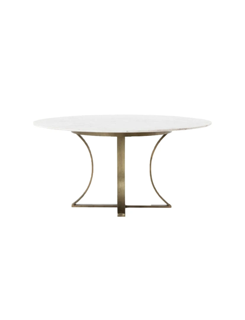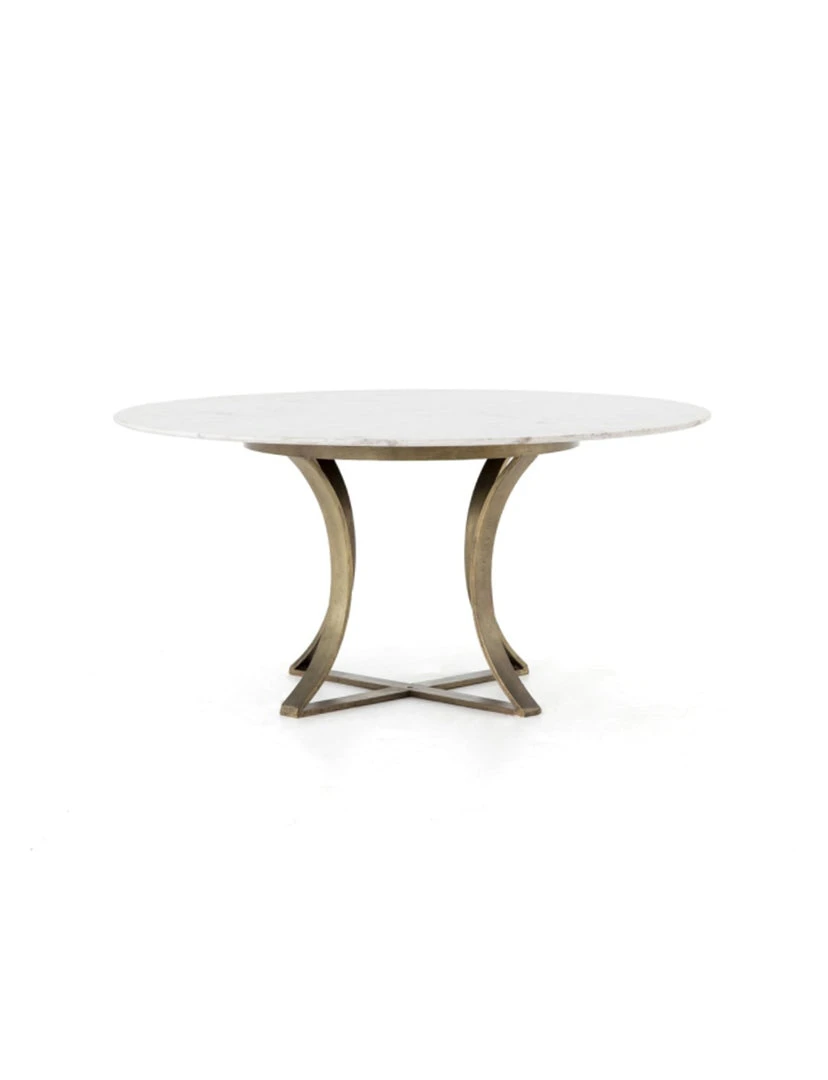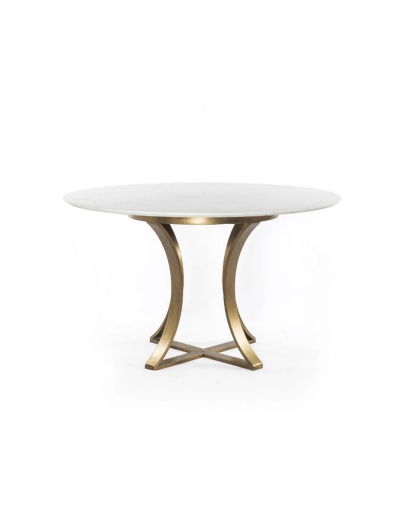 Sophisticated materials take a cue from modern geometry. Antique brass iron forms uniquely-curved angles to balance a contrasting polished white marble top. A refined spin on trend-forward design.
